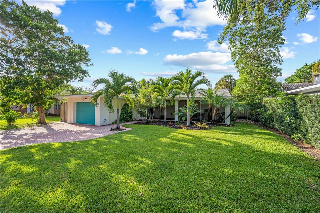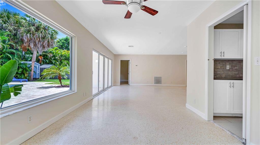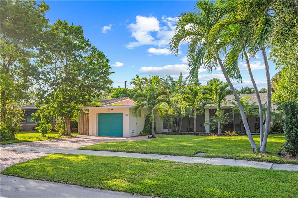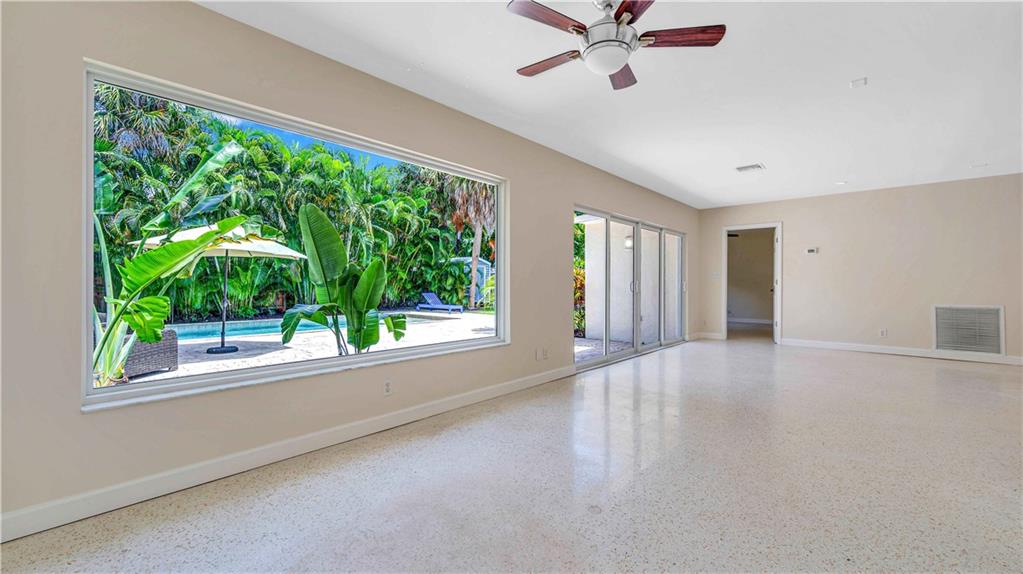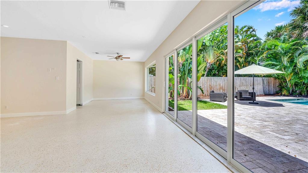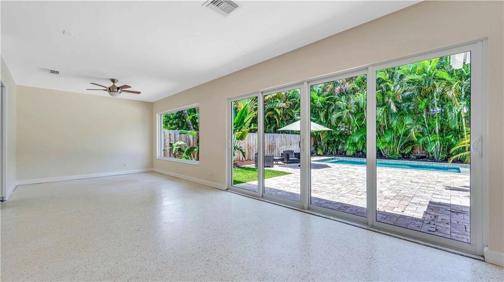 Bright and spacious home on a deep, private lot approximately a mile from the beach. Located in the Highlands section of Victoria Park, this cool mid century has sleek terrazzo floors, generously sized rooms, updated kitchen and baths, a home office, impact rated windows and doors. A wide driveway leads to a large, screened entry porch. An L-shaped living dining area opens through wide sliding glass to the pool and large surrounding yard Adjacent is a modern, eat-in kitchen with quartz tops fully equipped & including a wine chiller. Off the kitchen is a full laundry with wash sink leading to the air conditioned office cleverly constructed within the garage area allowing plenty of remaining storage area. The neighborhood is lined with sidewalks. Parks, stores and restaurants are all nearby.