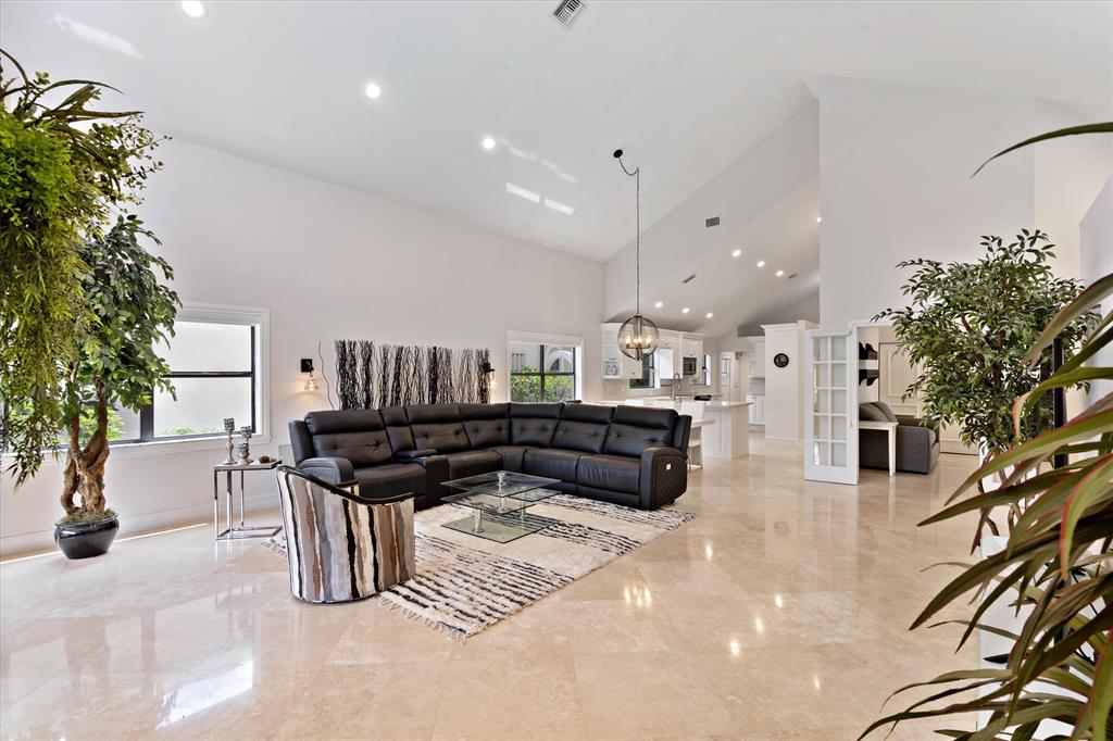 Impressive one story home with 3 bedrooms, 2.5 baths, and a 2 car garage. Charming front entrance and inside you're greeted by high vaulted ceilings and a lovely open floor plan with 1,968 sq ft under air. Upgraded kitchen with quartz countertops and stainless steel appliances. Some features include: 2019 AC, 2007 water heater, marble flooring, luxurious baths, the third bedroom acts as an office and offers glass French doors, desirable southeast exposure. Spacious backyard with paved patio and covered area. Enjoy both GOLF and LAKE views!