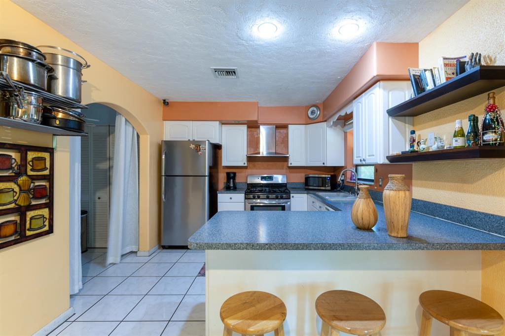 Cute home with no restrictions , newer kitchen has 5 burner gas stove, up dated bathroom with tile floors , open floor plan with french impact doors out to the yard. Shudders for all windows, one year old roof, water heater 1991 , central AC 2003. Beautiful private yard with many trees . Great for investor or first time buyer.