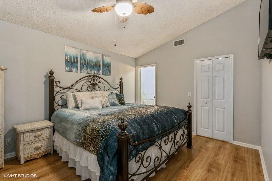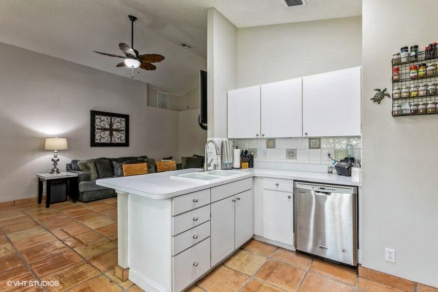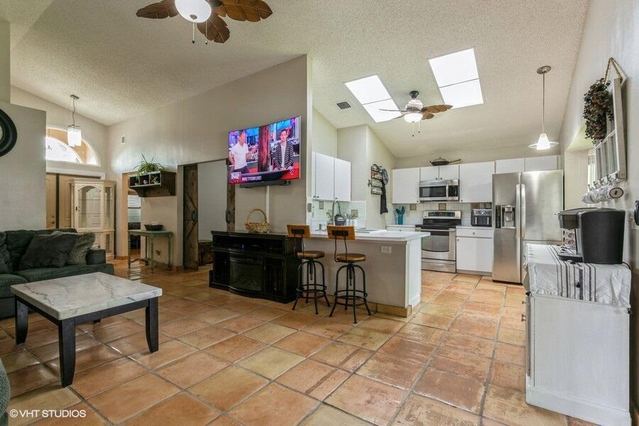 Welcome home to Paradise says this nice 3 Bed 2 Bath home in the sought after West Palm neighborhood. Buyers will love the curb appeal and looks of this home on a corner lot. The 2 car garage and large driveway leads you to the welcoming front porch. Inside you will find an open floor plan with tall ceilings. There is fresh paint throughout along with new designer fans and sliding barn doors off the 3rd bedroom/den. The large Livingroom leads to the open kitchen and the Large Master Suite. There are sliders that walkout to a nice sized screened porch that overlooks the beautiful fenced backyard perfect for entertaining and privacy. There is nice pavers and a large nice shaped patio to relax or BBQ. This home comes with the included subdivision pools, park, playground area.