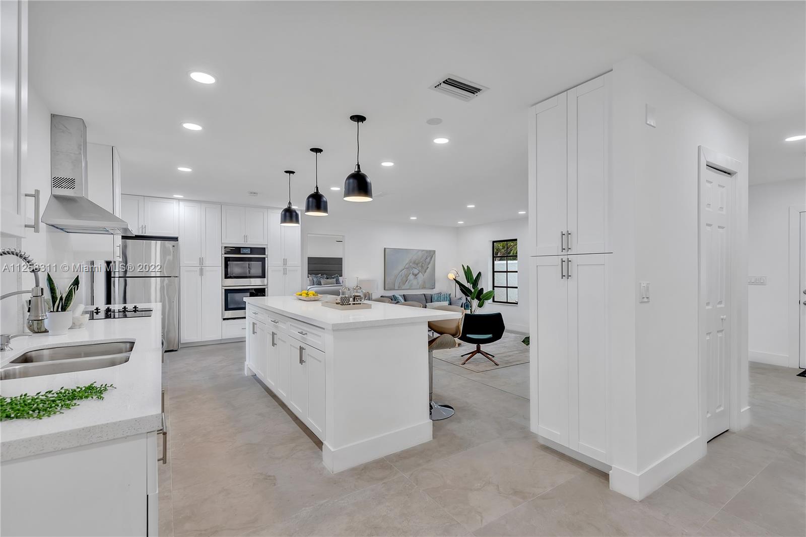 Newly remodeled lakefront pool home, in desirable Royal Palm Estates. Features large format tile floors in common areas and luxury vinyl planks in all bedrooms, recessed LED lights throughout. Open-concept kitchen with island, quartz countertop, and SS appliances; a Master bedroom with ample walk-in closet and cabana bath. Three spacious secondary bedrooms. Formal living room area, and cozy family room. Spacious 2-car garage with laundry. Circular driveway and privacy wall from the street. Large L-shaped swimming pool with diving board and one of the best lakefront views in the neighborhood!! Ready to launch your kayak or paddleboard. Perfect Family Retreat, centrally located to signature Shoppes and restaurants, 15' to Beaches & FLL Airport.
