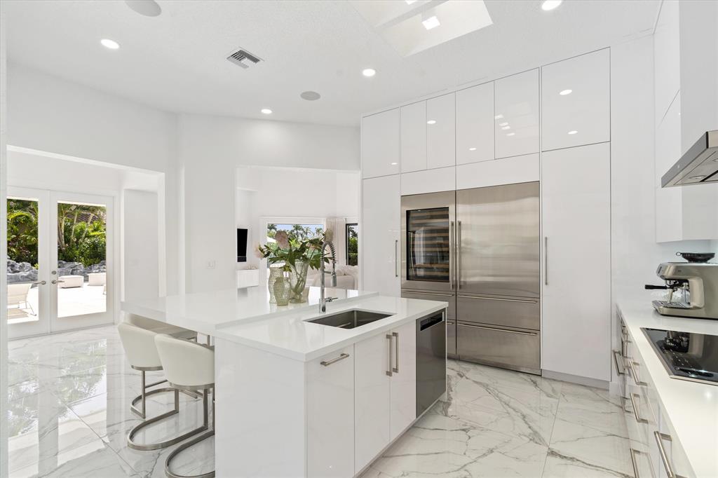 Explore a world of Luxury living from the moment you walk into this beautifully renovated private oasis. 4 bedrooms + an office, 4 full baths, 2 half baths, and a 2 car plus golf cart garage. Separate guesthouse with kitchenette and balcony. This courtyard estate home is perfectly situated on an extra large lot with lush vibrant landscaping, offering a golf course and long lake views. Oversized porcelain tile flooring throughout the main living areas, and a stunning gourmet kitchen with WOLF & SUBZERO appliances, chic cabinetry, quartz countertops. Luxurious ensuite bathrooms with custom marble floors. The courtyard features a summer kitchen, breathtaking saltwater pool and spa with waterfall for relaxation.