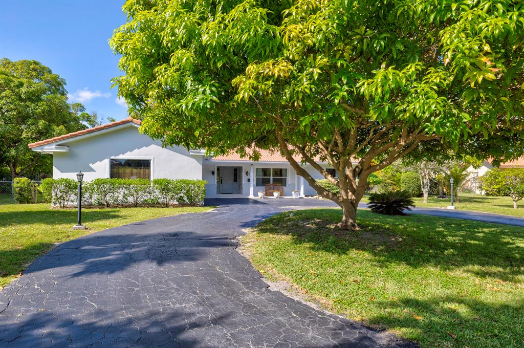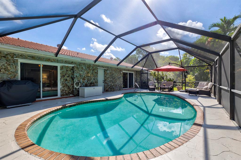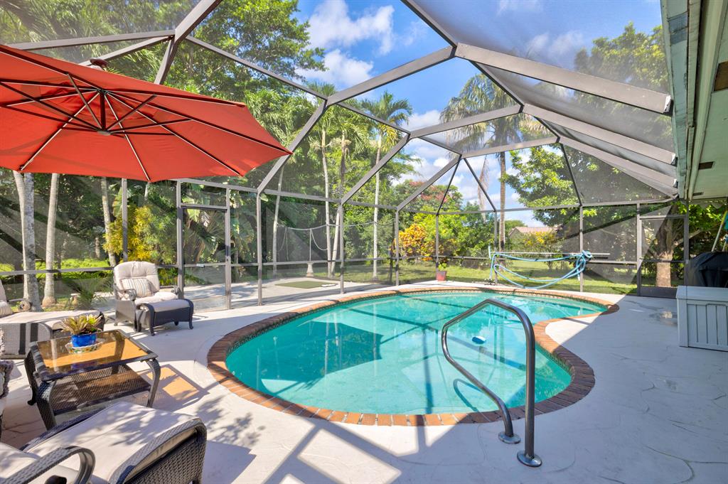 Beautiful sprawling ranch located on a private cul-de-sac in the much desired community of Village Green. The spacious 3/2 is one of the larger properties in the neighborhood sitting on 1/4+ acre. The interior boasts tons of natural light, separate dining room, updated eat-in kitchen with both a snack bar & island for add'l dining. 3 hurricane impact sliders each lead to various parts of the oversized lot which offers plenty of green space, avocado, coconut & mango trees, and a large screened in patio with private pool. New interior doors & hardware, accordion shutters, plenty of closets & storage are only a few of the many features (see all home features attached in documents tab). NO CARPET! NO HOA! Wide circular driveway & 2-car garage offer plenty of parking. Truly the perfect home for