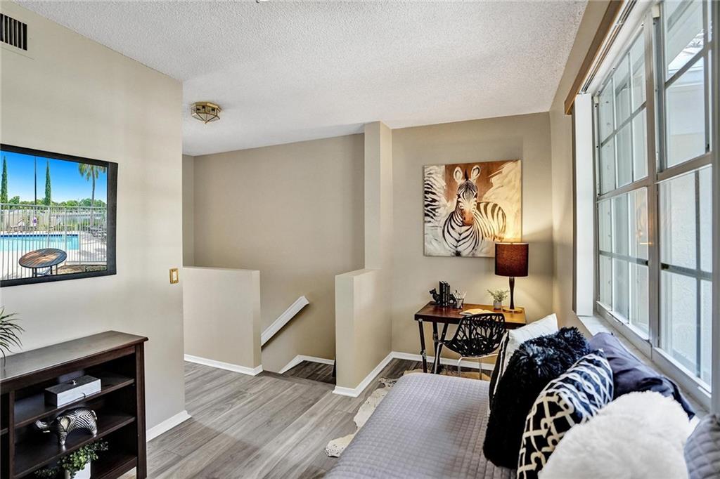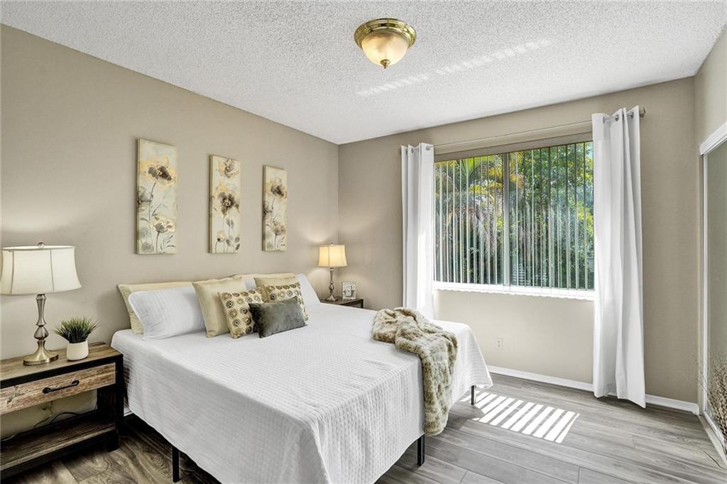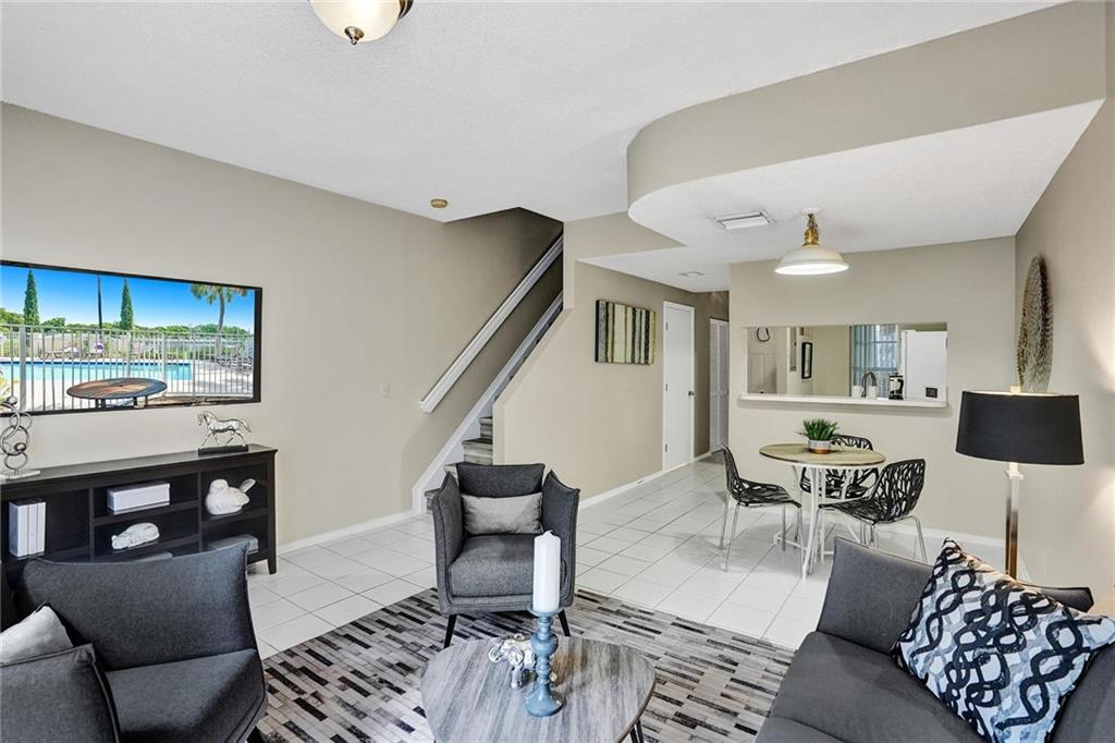 Here's your opportunity to buy into a great neighborhood at an affordable price. A contemporary friendly residence sitting nicely in desirable Somerset at Jacaranda. Easy entertaining in this unique 2 bedroom, 1-1.2 bath townhouse. Sliding glass doors open from living room to screened patio. Tile floors in social areas. Recently installed manufactured wood planks on stairs & second floor. Interior just painted! Second bedroom being used as loft, guest, media. Primary en-suite bedroom fit for a "king." Assigned parking at your door. Lots of guest parking. Accordion shutters, screened patio with storage room. Stacked washer/dryer. Wonderful location nearby all conveniences, main highways, schools, shopping. Steps to lovely lake views. If it sounds amazing to you, stop by and check it out!