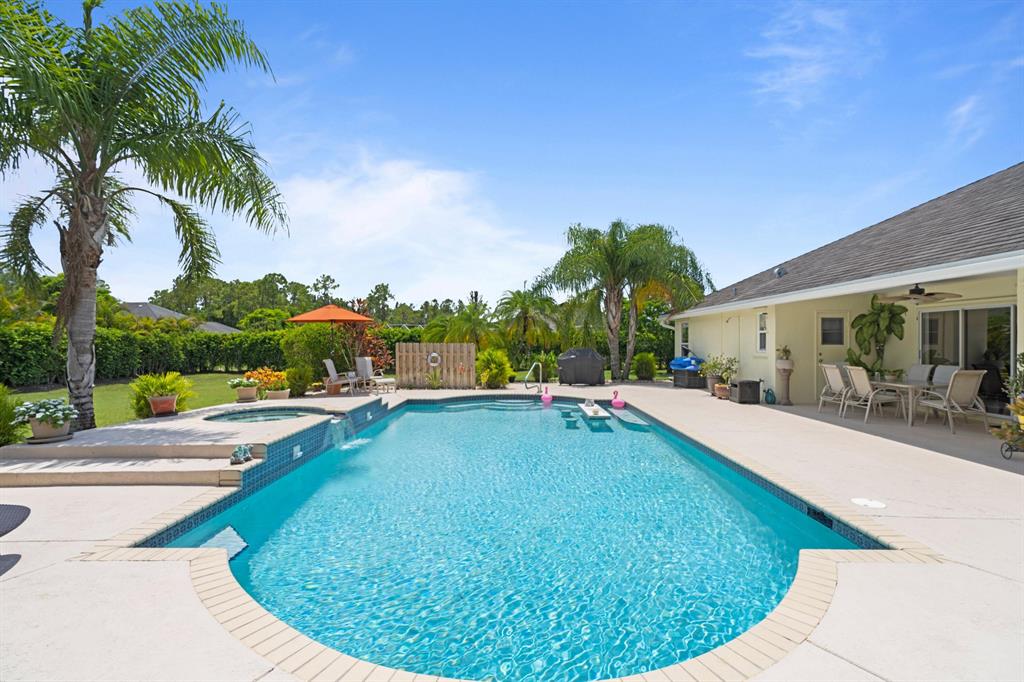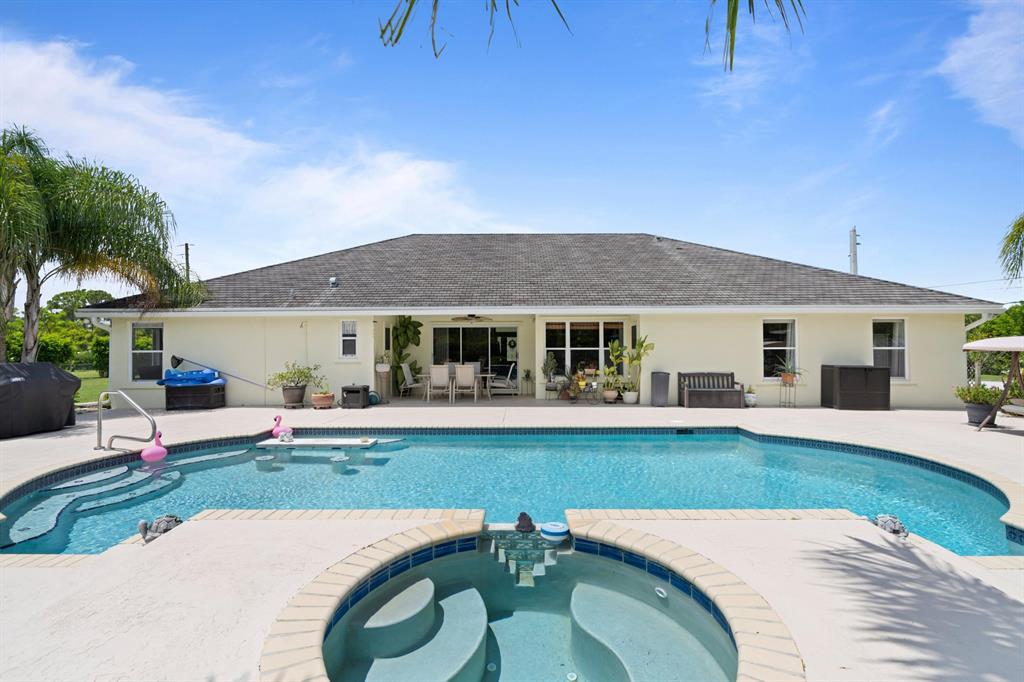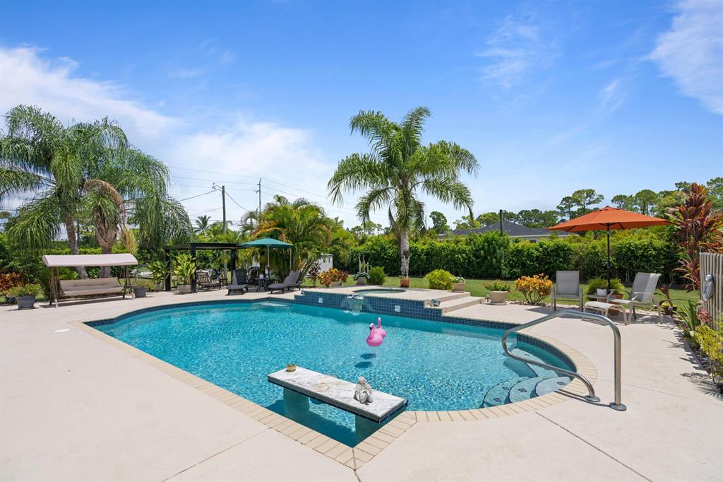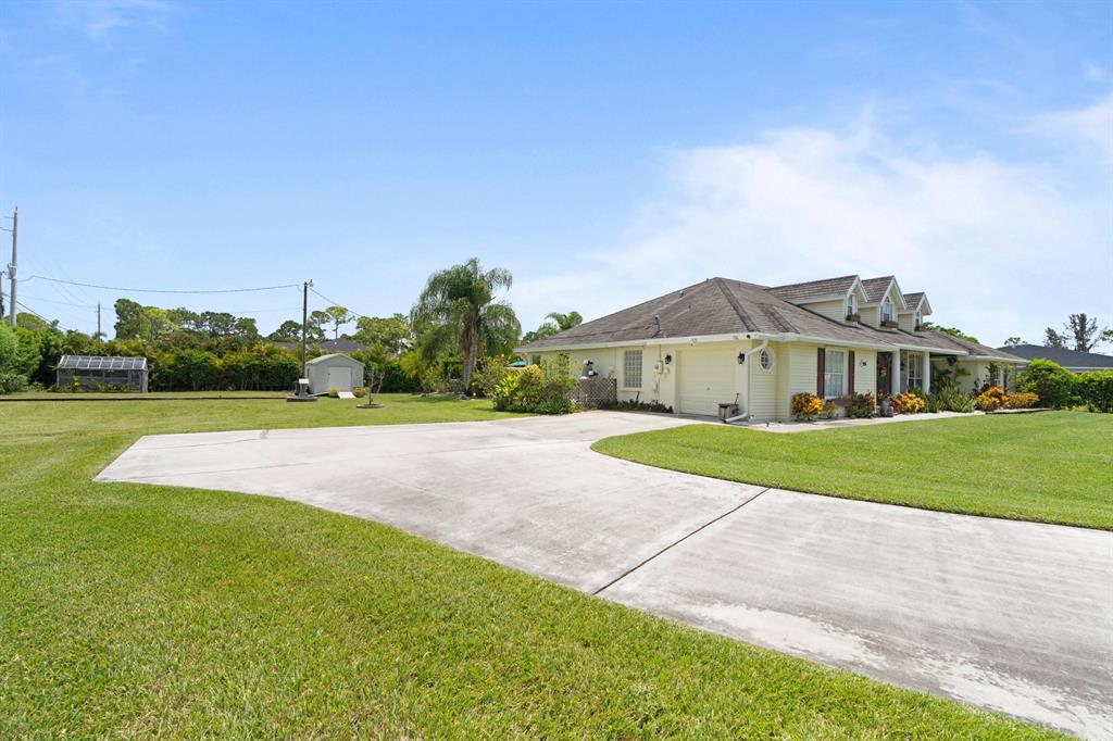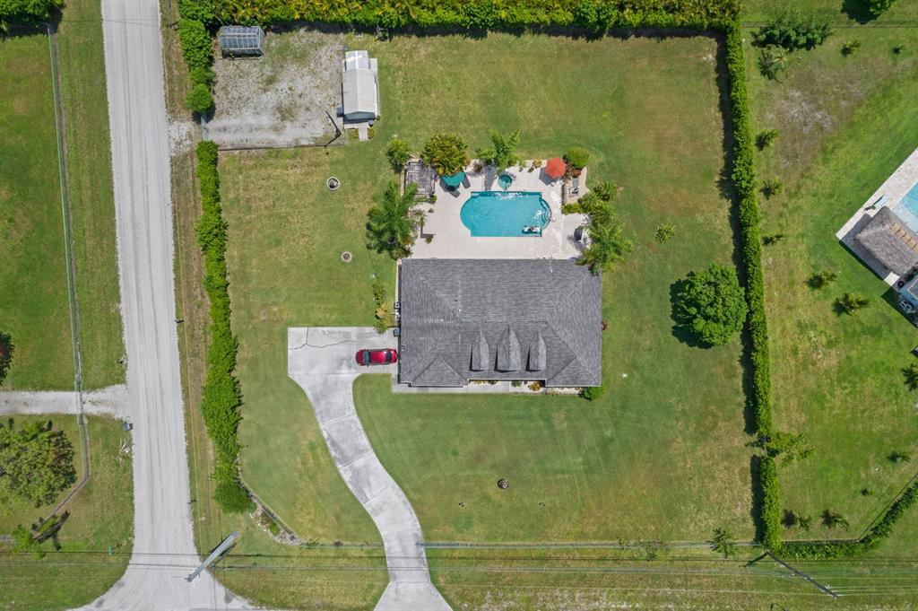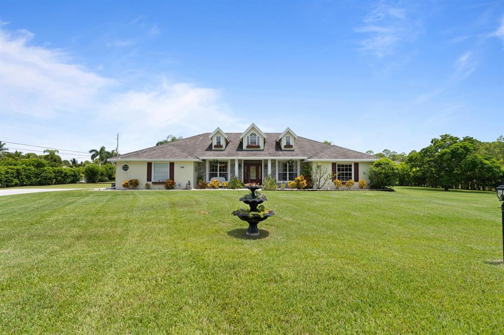 Stunning 1-Story Estate on HUGE Corner LOT l 1.38 Acres l Sought-After Neighborhood of The Acreage! 4 BR l 2 BA | Impressive Bright Open Split Floor Plan l Dramatic Vaulted Ceilings l Porcelain Tile l Crown Molding l Sky Lights. Beautiful Remodeled Eat-In Kitchen, Large Kitchen Island & Breakfast Bar, Custom Wood Cabinets, Wine Bar, Pantry & Luxury Vinyl Floors. Formal Dinning Room & Living Room. Master Suite with Vaulted Ceilings, Walk-In Closet, Hard Wood Floors, Ensuite with Dual Sink Vanity, Jacuzzi Soaking Tub & Custom Glass Shower. Quiet Lush Fenced Backyard, Covered Patio, Large Custom Pool with Waterfall, Fruit Trees & 2 Sheds. Minutes to Turnpike, Downtown City Place, Beach & PGA National Members Club! Roof 2009. AC 2013. WH 2010