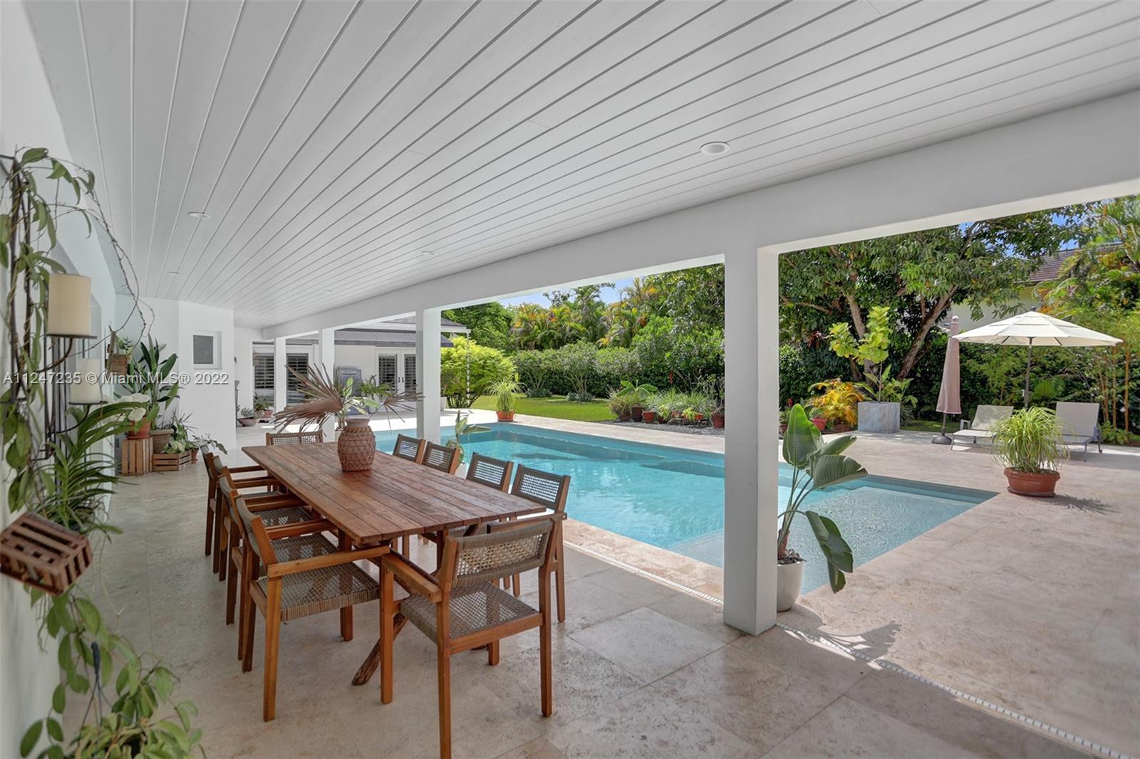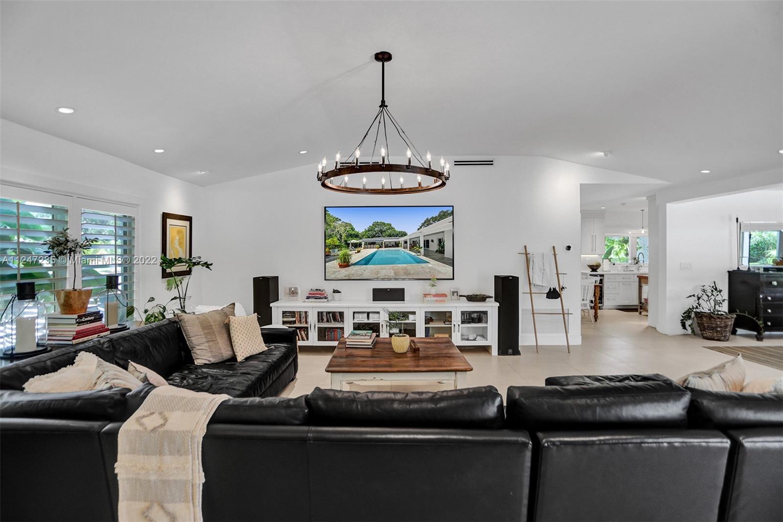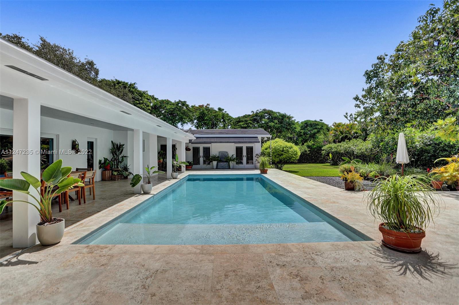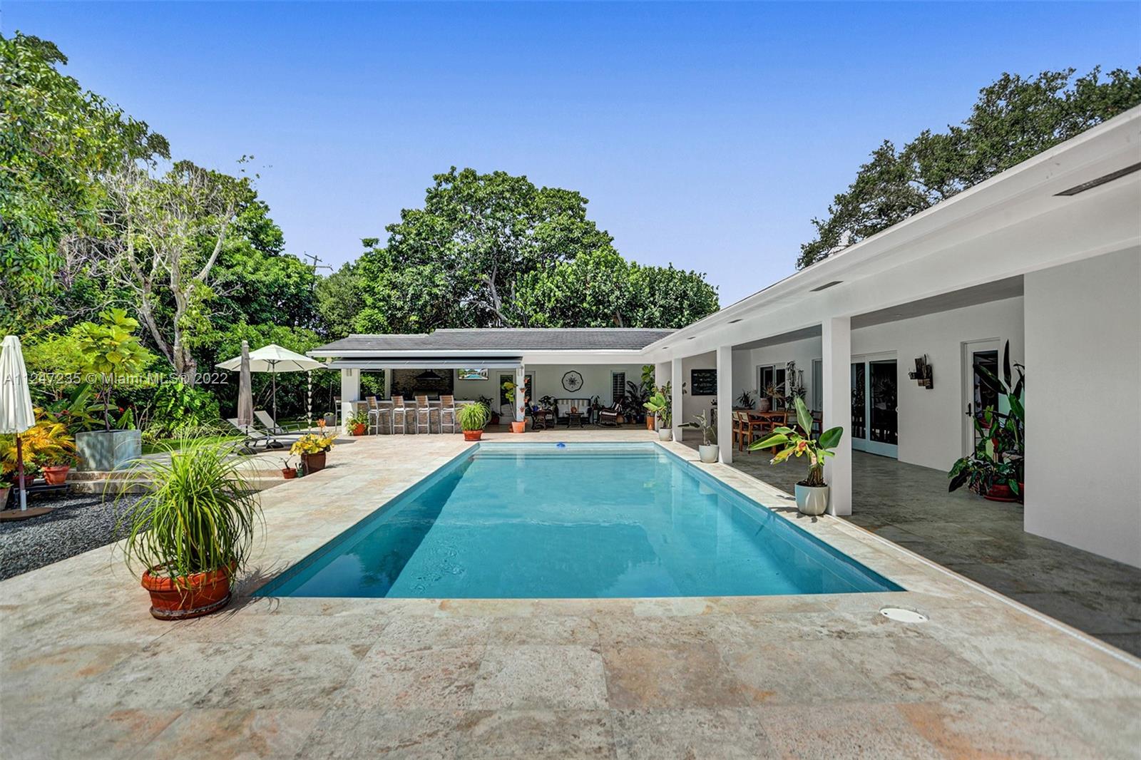 This turnkey North Pinecrest home melds Miami style and tropical ease steps away from Pinecrest Gardens. Experience a charming retreat in this 5 bed, 4 bath home remodeled in 2015. Highlights of this nearly 5,000 sf residence include a bright, airy formal living area leading to an expansive light-flooded family room, lofty ceilings, contemporary kitchen w Sub-Zero refrig, gas stove, butler’s pantry w Thermador oven,additional refrigerator, and ample storage. Relish in the stunning Florida landscape of the sprawling outdoor space, which includes a versatile kitchen and entertaining area for lavish nights of hosting or an elegant escape. The primary bedroom overlooking the lux pool area, flanked by lush foliage, has two spacious walk-in closets. Enjoy proximity to all of the Miami excitement