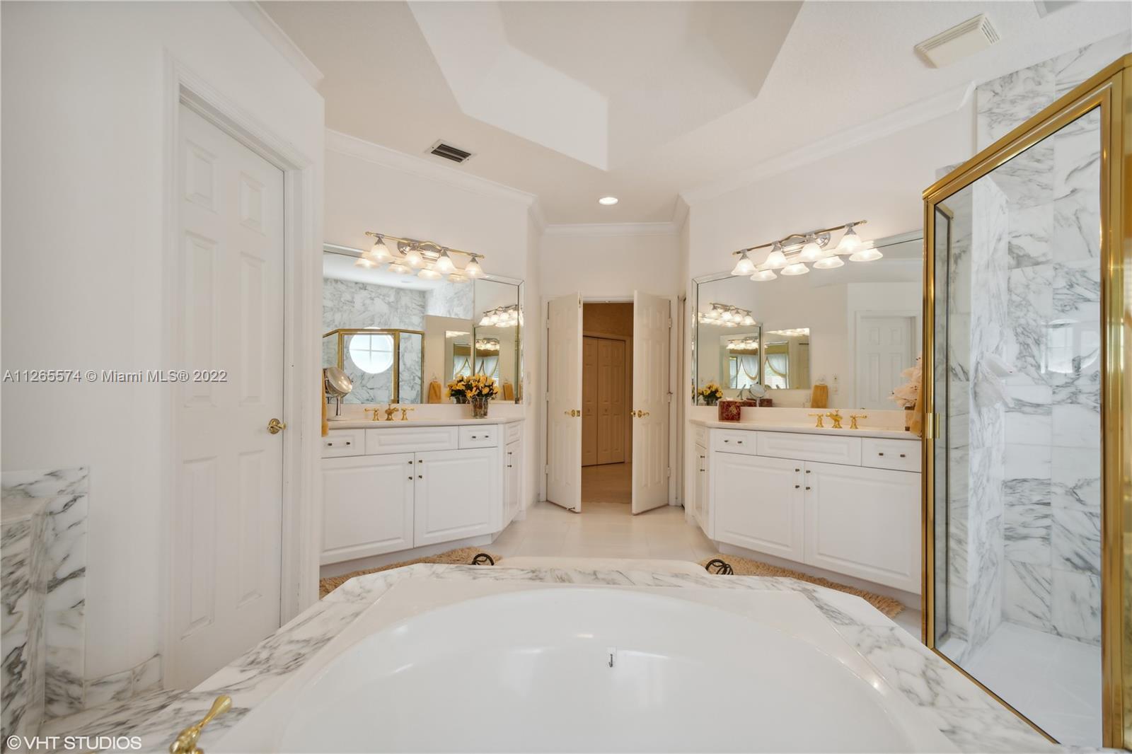 The dream location represents the epitome of opulent living. The estate sits on an oversized lot in a 24-hour man-gated community. The incredible floor plan of this home is open, functional and includes a master suite with a grand hallway, make-up area, and a regal closet; a children's and guests' wing with three spacious rooms, an office with a closet, chef’s kitchen with pantry, seated bar area, surround system, pool, full home generator with 1,000 - gallon gas tank, security cameras, impact windows - kitchen | dining area and accordion shutters. The enormous parking spaces, include a 3-car garage, two separate parking areas, a front porte-cochère, a circular driveway with a water feature and side entrance paved parking for the vehicle fanatics.