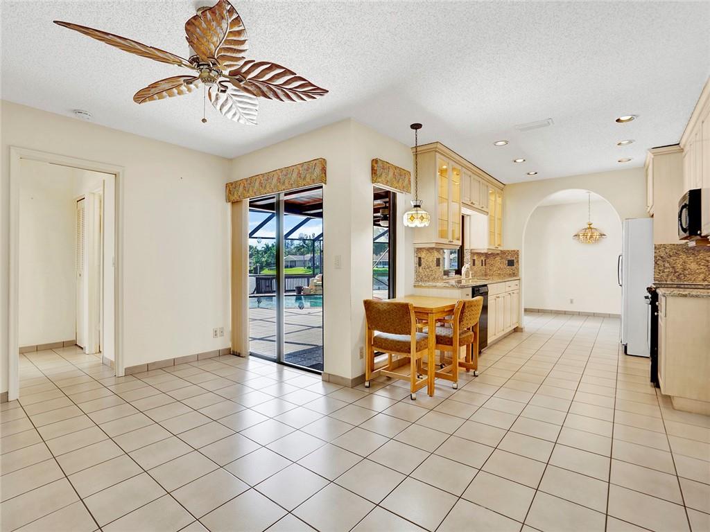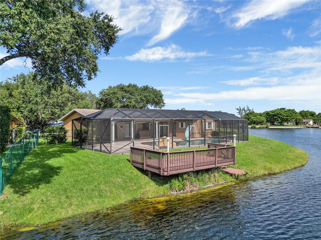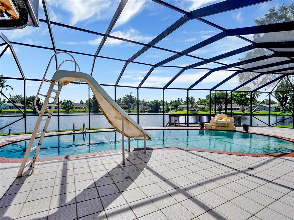 A bit of paradise in this quiet cul de sac location...water wraps around 143 feet of this property with large dock, dome screened pool with slide and waterfall, oversized roofed and beamed patio, all overlooking the widest part of lake. This Oakwood model features a split floor plan, two baths that lead to the pool/lake area, remodeled kitchen, upgraded baths, lots of high hat lighting and tile, full hurricane protection to include partial impact windows and partial accordian shutters, full alarm system, complete appliances including washer, dryer and refrig in garage, and walking distance to all "A" rated Cooper City schools. Some minor updating and your personal touches will make this your forever home.