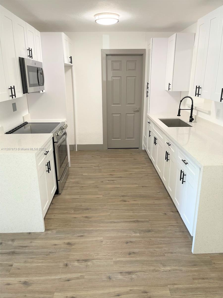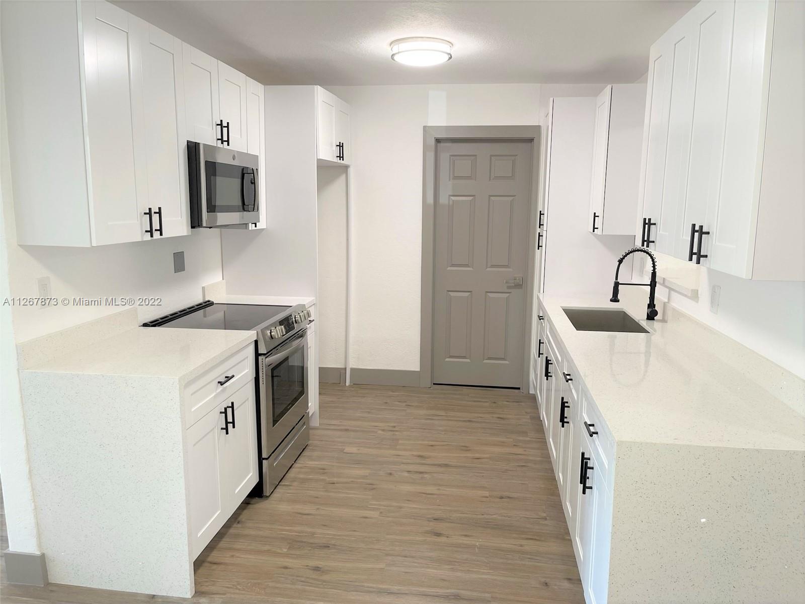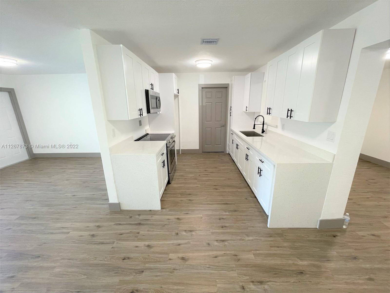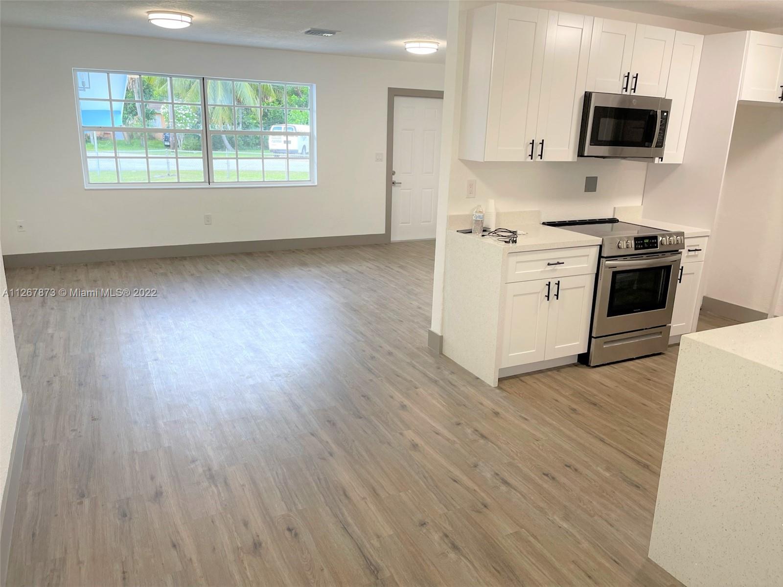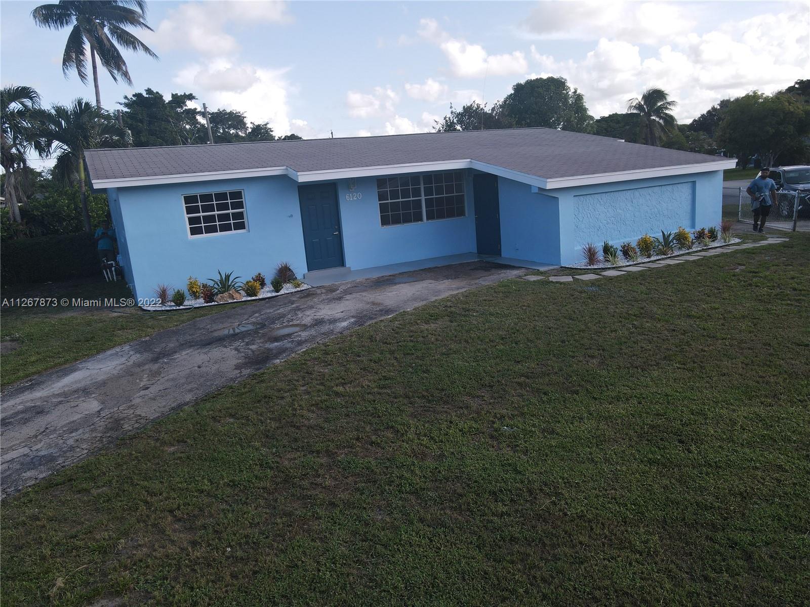 Lovely Single Family Home in the heart of Hollywood. Great three-bedroom two bathroom split plan; there is no HOA. Newly renovated. Nice waterproof vinyl flooring throughout the home with new baseboards and trims, LED lighting, renovated bathrooms, brand new kitchen with white shaker cabinets and quartz counters! A huge lot with a circular driveway, the house has a workshop that can be converted into an extra room. Cover patio at the back. Don't miss out on this gem! it won't last!!