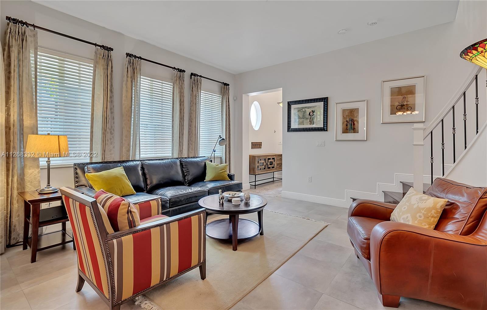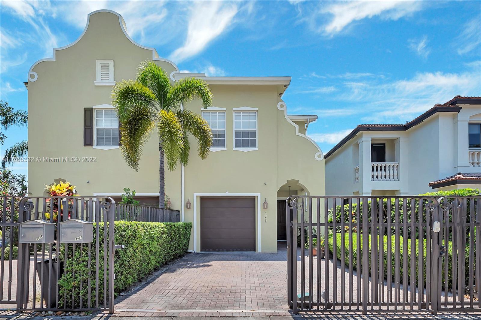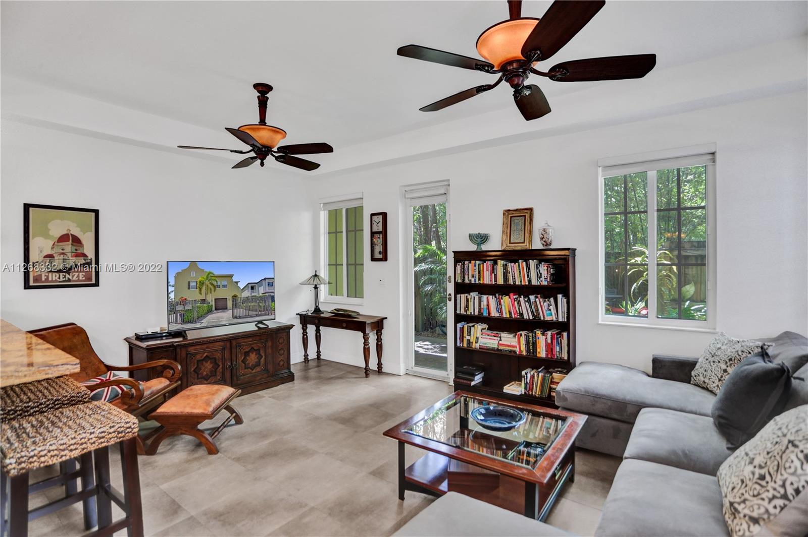 Live the Coconut Grove lifestyle in the largest townhome floorplan available. This beautiful, gated home has 4 bedrooms, 3.5 baths plus loft area. Foyer entry leads into large bright living room w/ stunning oak wood staircase and formal dining room. European style kitchen with breakfast area has coffee & beverage station w/ two wine coolers and pantry. The spacious family room leads to the tropical backyard. Surrounded by trees and lush vegetation, this is your very own Grove oasis. Large primary bedroom has separate sitting area, balcony, walk-in California closet, and luxurious bath. Laundry is upstairs along with one ensuite bedroom and two additional bedrooms that share a bath. Features 10’ high ceilings, impact windows, granite countertops, one car garage and more. Unique opportunity!