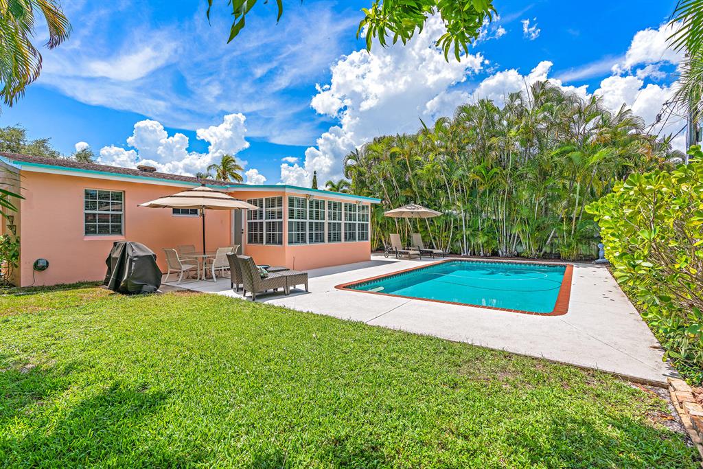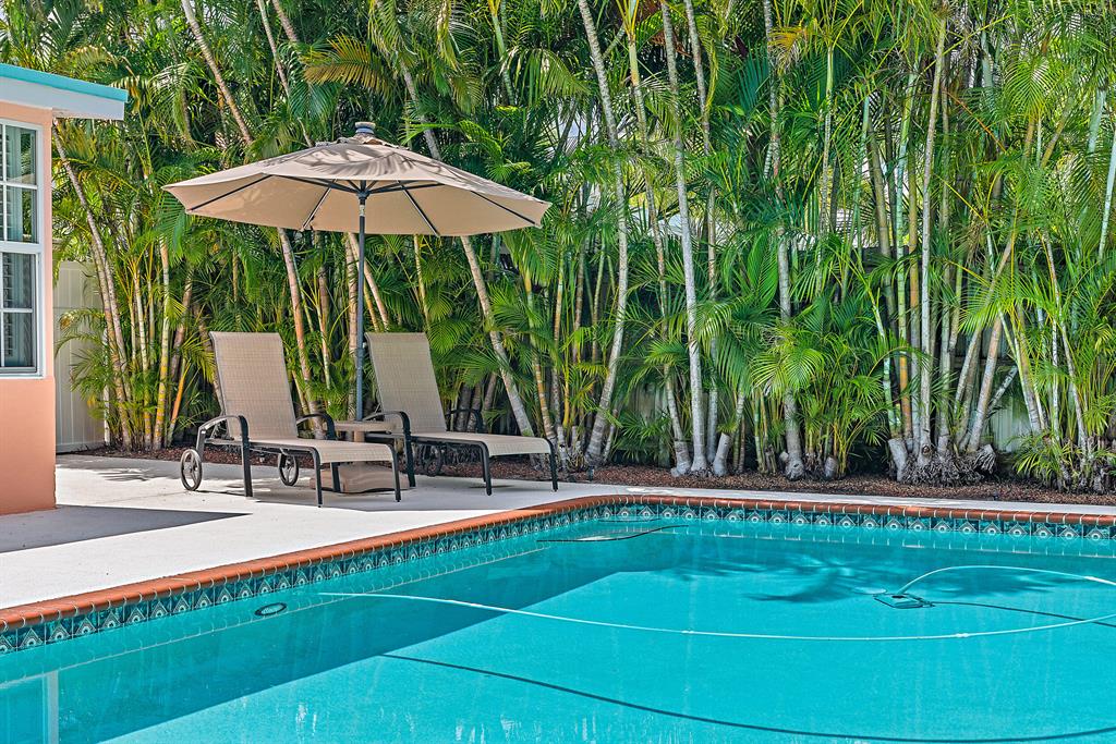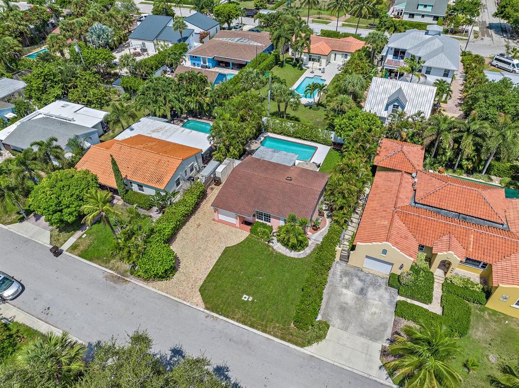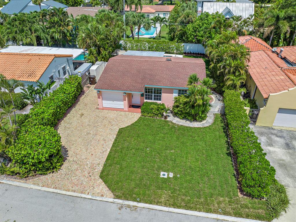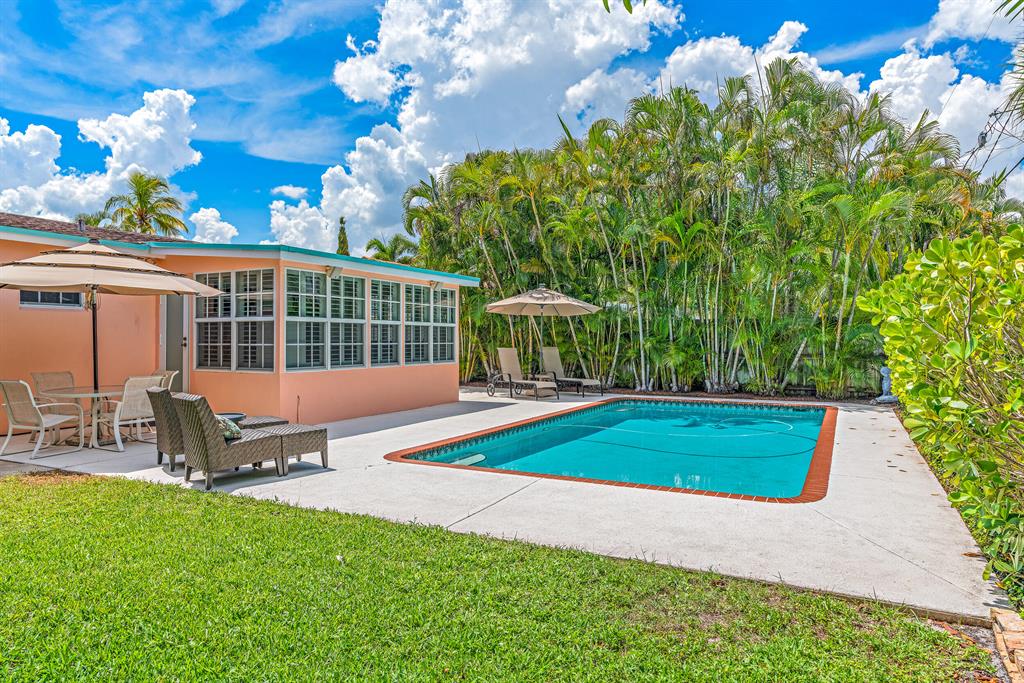 Charming 2 bed/1 bath South of Southern home with swimming pool. Fantastic east-of-Olive location on a cul-de-sac with a deeded easement to Flagler Drive. Take a stroll along the gorgeous Intracoastal Waterway. This mid-century home has been meticulously cared for & lovingly maintained. Features: impact windows, 2021 AC, terrazzo flooring, brick driveway, an updated bathroom, walk-in pantry/laundry room, cozy Florida room w/ plantation shutters, & a music studio. The studio can be converted back into a full-size garage as needed. You'll love the spacious, lush, fully fenced backyard! The large swimming pool & patio are perfect for lounging, & entertaining. This 'SoSo' home is close to tennis courts, the park, beautiful beaches, great restaurants, downtown, PBI airport, The Square & more.