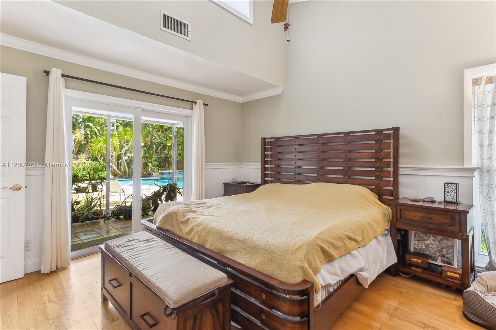 Move-in Ready Bright & Spacious corner lot pool home with impact windows and Vaulted Ceilings, Split bedroom plan. Wood Cabinets, Granite Counters, Stainless Appliances. Built in breakfast nook compliment's the kitchen. Wood Floors in Living Areas, 5" Baseboards and crown molding. Screened-In Patio, Salt System pool W/Hot Tub. Ample Storage Built-In's! Updated Master Bath:Custom Cabinets, Double Sink, Double Shower. Movie Room/2-Car Garage w/AC. Private Fenced yard and ample space. Storage Shed.