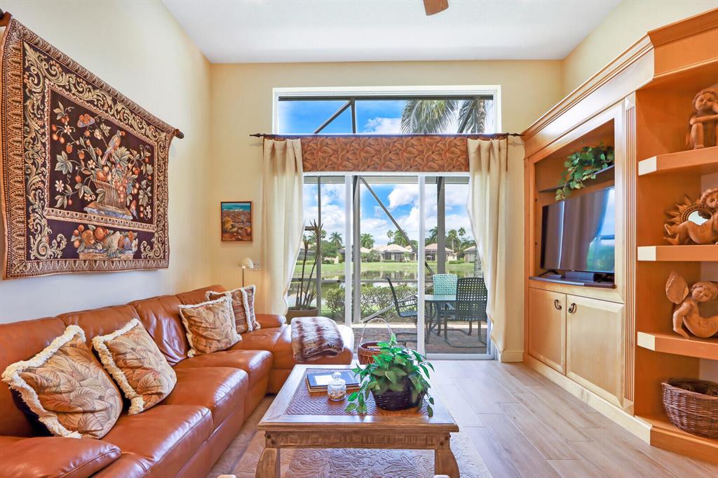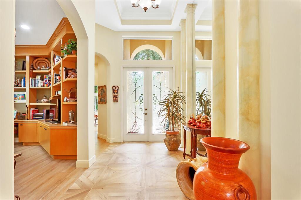 This FORMER BUILDER'S MODEL one-story, one-owner home boasts incredible upgrades, recent renovations (including a 4-year-NEW ROOF and a BRAND NEW 2022 AC system), a screened heated POOL, outdoor kitchen--all with the sublime backdrop of wide lake views (with a stunning lit fountain at night!). From the moment you open the elegant glass double doors you'll know that you're in a very special home. The builder incorporated dramatic and timeless architectural enhancements in practically every room of this renovated former model home. Soaring ceilings, adorned in layers of crown molding, stately columns and built-in mirrors create major wow-factor, complementing the new flooring in the main living areas.