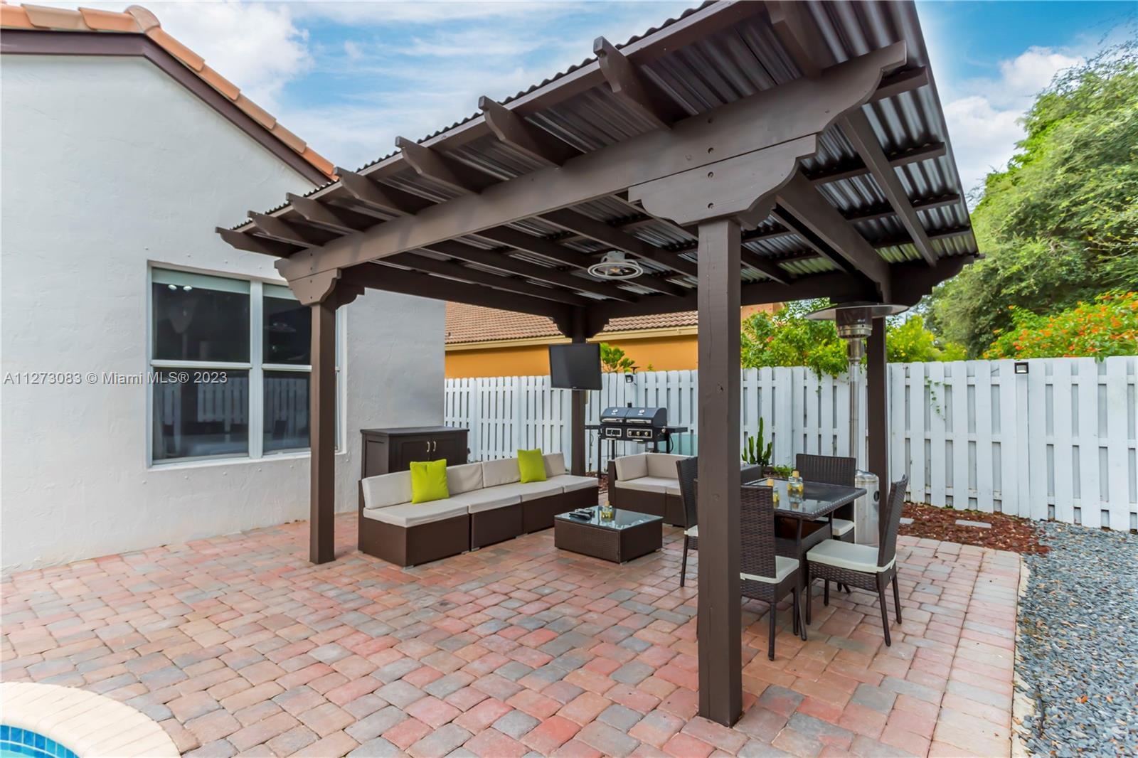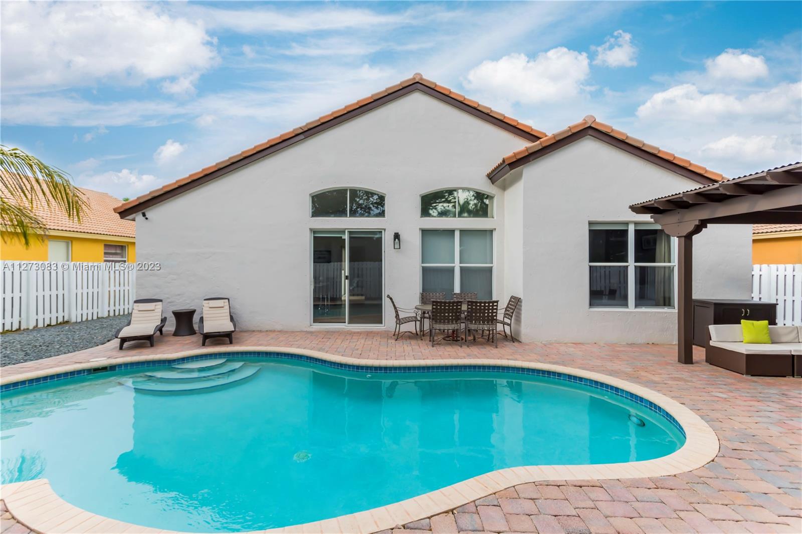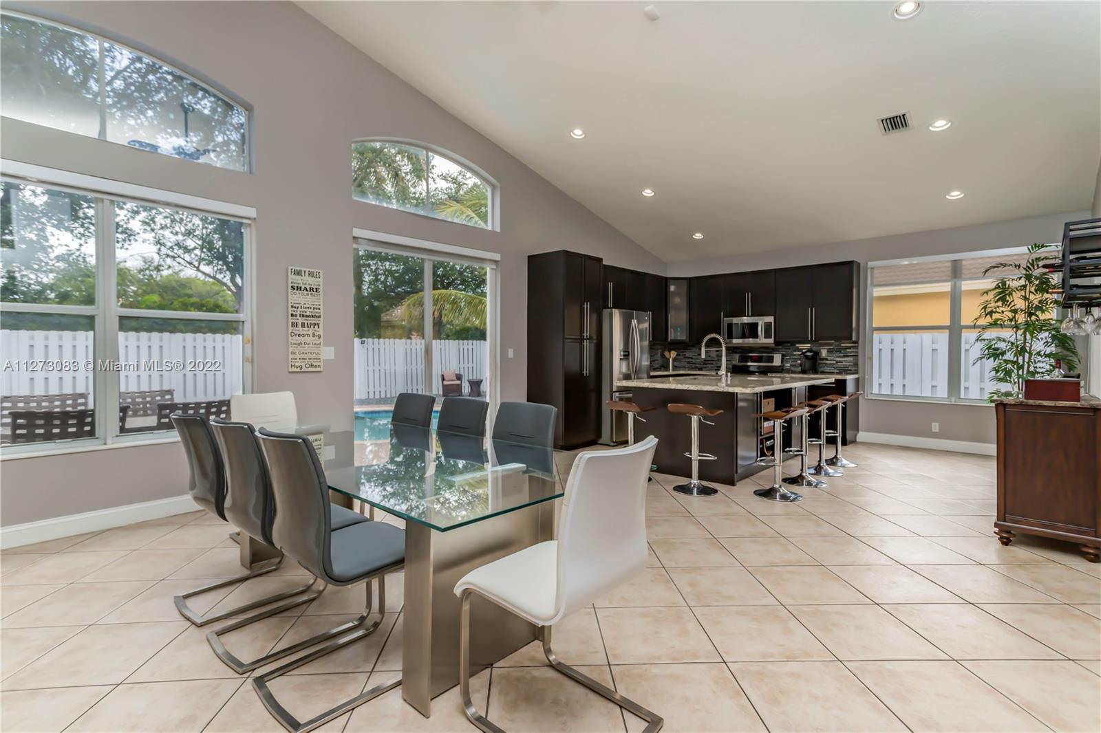 GORGEOUS THREE BEDROOM, TWO AND A HALF BATH, ONE STORY HOME WITH A ***SALTWATER POOL*** IN THE RESORT STYLE COMMUNITY OF MONACO COVE AT SUNSET LAKES. THIS HOME FEATURES TILE FLOORING IN THE MAIN LIVING AREAS, WOOD LAMINATE FLOORING IN ALL BEDROOMS, AND VOLUME CEILINGS THROUGHOUT. THE LARGE OPEN KITCHEN IS COMPLETE WITH AN EXTENDED OVERSIZED ISLAND WITH SEATING, GRANITE COUNTERTOPS, DECORATIVE BACKSPLASH, MODERN CABINETRY & STAINLESS STEEL APPLIANCES. THE PRIVATE FENCED-IN PRIVATE BACKYARD HAS A LARGE SALTWATER POOL & A HUGE PERGOLA MAKING THIS THE PERFECT PLACE TO RELAX AND ENTERTAIN. ***AC IS 3 YEARS NEW & WATER HEATER WAS REPLACED IN 2022!***