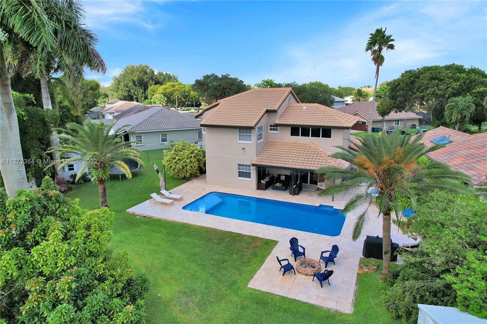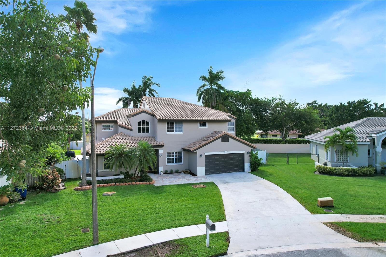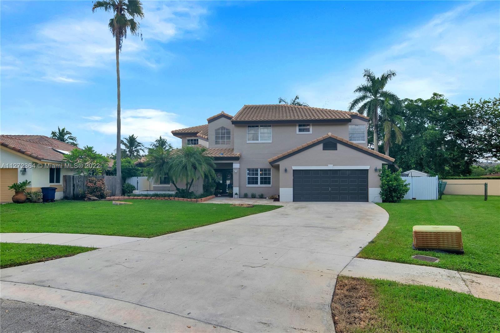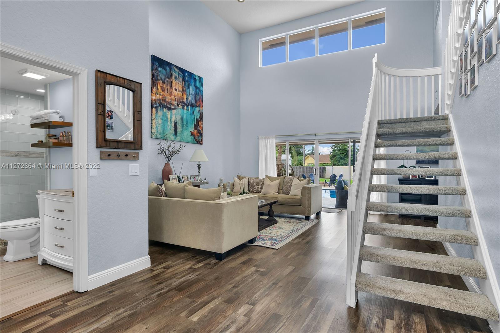 This gorgeous 2 story home in the hidden community of Stirling Village, offers all the modern design elements expected in a completely remodeled home. With dramatic vaulted ceilings, plenty of natural light, a grand staircase & engineered vinyl plank floors throughout. The spacious kitchen, remodeled in 2018 along with the 3 bathrooms, was designed for entertaining with an abundance of storage. 1 bedroom & bath downstairs; upstairs find the master suite, remodeled in 2021 featuring separate vanities and a glamorous freestanding tub. All bedrooms offer closet organization systems. The expansive corner lot boasts a sparkling salt water pool, resurfaced in 2019 with travertine pavers & a double wide gate perfect for boat access. The heart of Cooper City, surrounded by A rated schools. NO HOA!