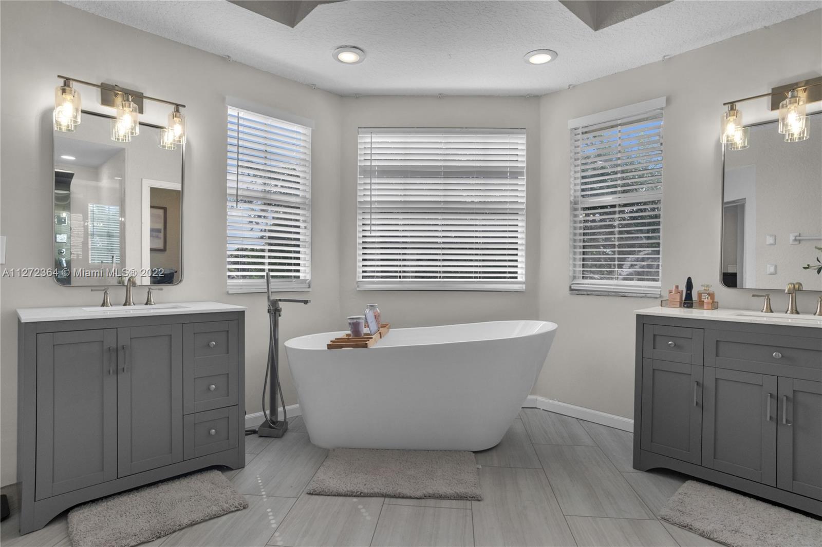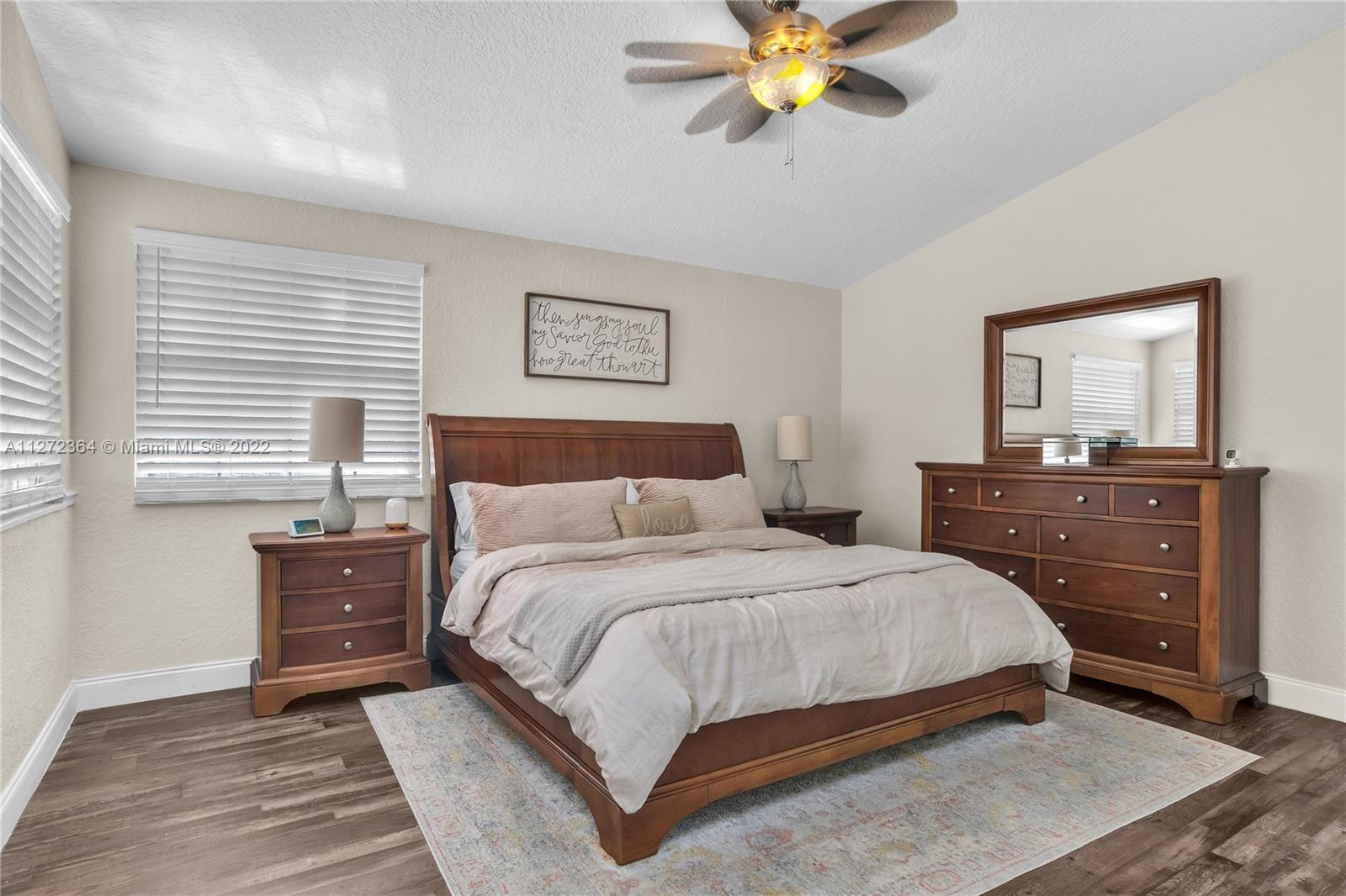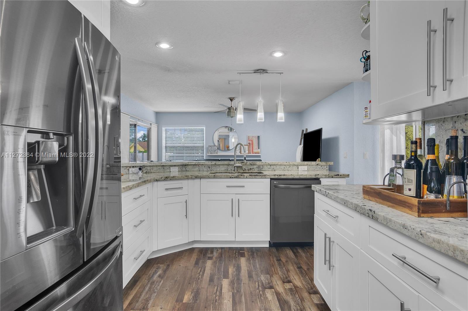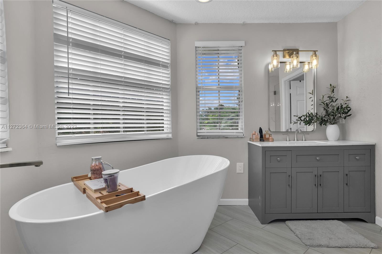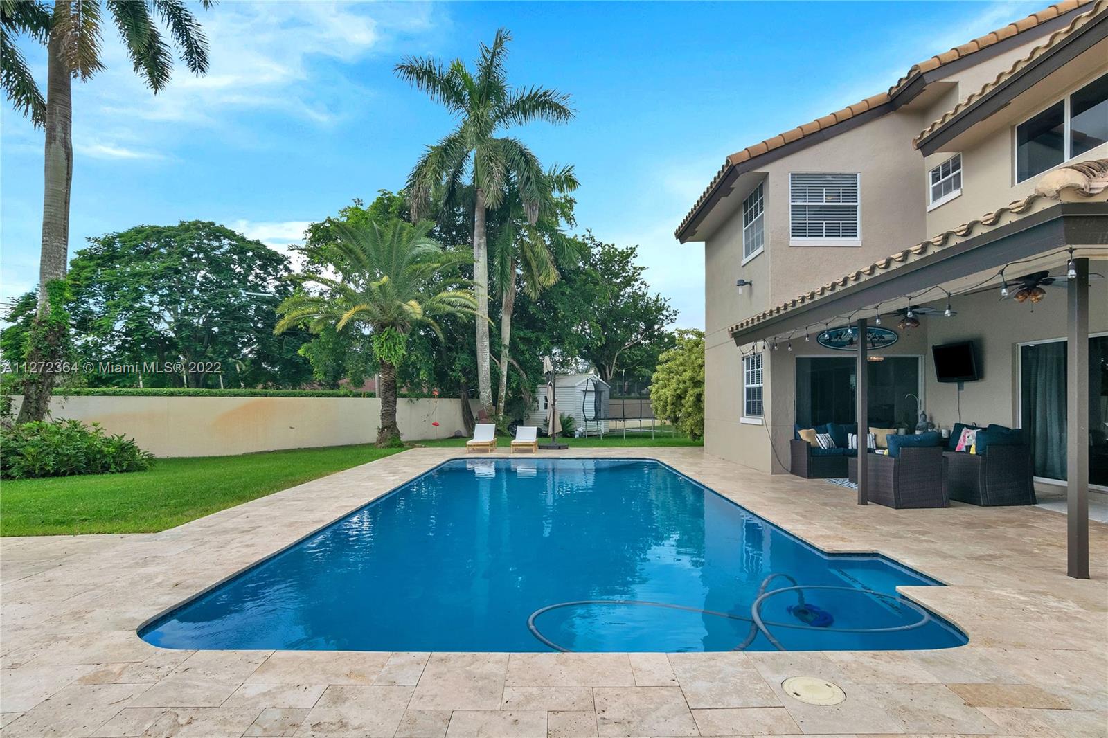 This gorgeous 2 story home in the hidden community of Stirling Village, offers all the modern design elements expected in a completely remodeled home. With dramatic vaulted ceilings, plenty of natural light, a grand staircase & engineered vinyl plank floors throughout. The spacious kitchen, remodeled in 2018 along with the 3 bathrooms, was designed for entertaining with an abundance of storage. 1 bedroom & bath downstairs; upstairs find the master suite, remodeled in 2021 featuring separate vanities and a glamorous freestanding tub. All bedrooms offer closet organization systems. The expansive corner lot boasts a sparkling salt water pool, resurfaced in 2019 with travertine pavers & a double wide gate perfect for boat access. The heart of Cooper City, surrounded by A rated schools. NO HOA!