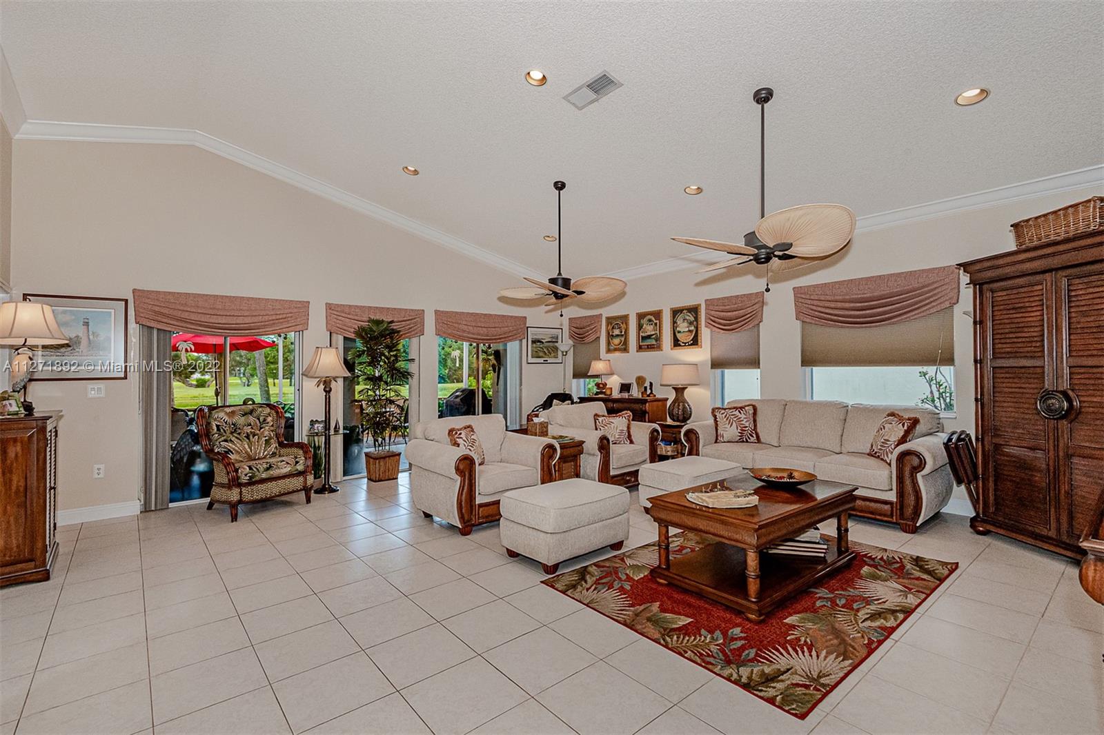 Magnificent home with lake and golf view in the private guarded Grand Palms Golf Course and Country Club. 2 bed and 2 bath converted from a 3/2 by the builder creating a great room living space with screen in patio. HOA includes 24 hour manned gate and roving patrol, landscape maintenance, tree trimming, sprinklers, house painting every 4 years, pressure cleaning of roof and sidewalks every six months, basic cable, ADT alarm monitoring, mailbox replacing every 4 years. New roof 2015, new A/C 2015, new water heather 2015, accordion shutters, installed plug-in hook up for external generator. New landscaping, new leaf filer gutters in rear and front, new pavers on screen patio. Golf cart and generator available for purchase.