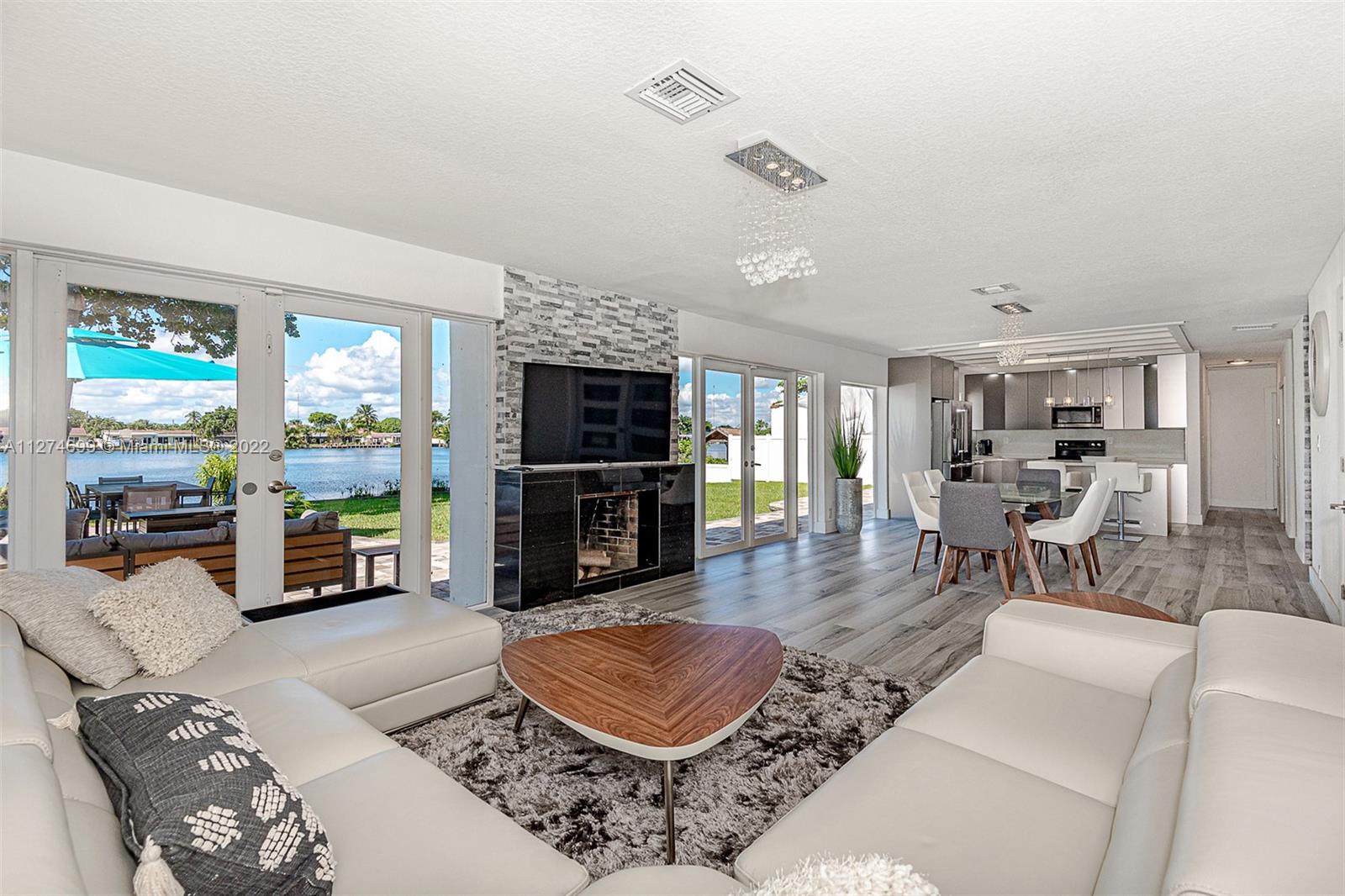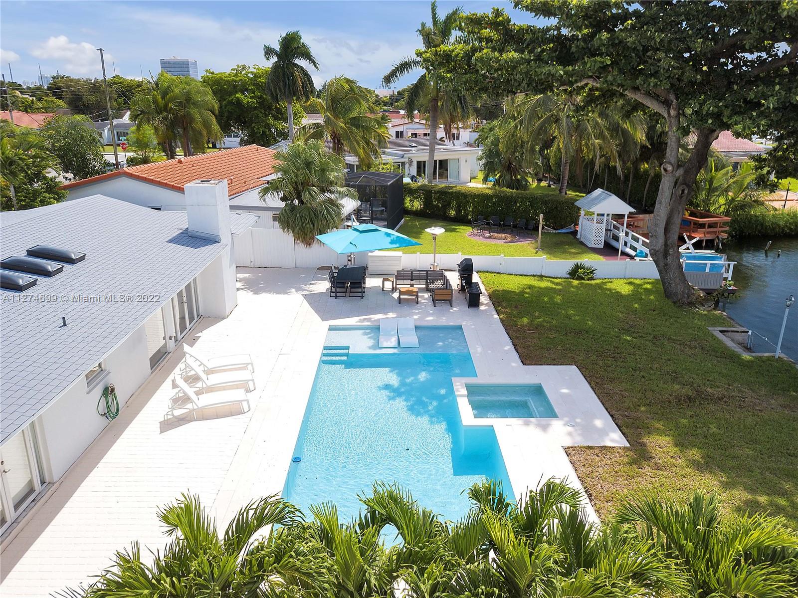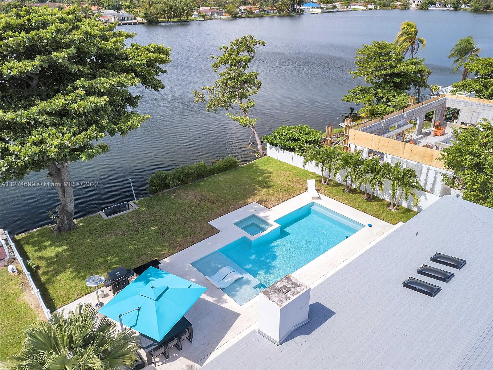 Fully Furnished- Ready to move in! Fully renovated 3Bed 2Bath (1800 sq ft) modern pool home, gorgeous lake views, pool and 6 jet jacuzzi. Outdoor tiki structure, 6 burner grill & outdoor fridge, table seating for 8. Ideal setting for a family, or turn-key short term rental. Property has short-term rental permit and verifiable rental income. Kitchen is open-design with island, quartz countertops and tile backsplash and skylights. Stainless steel appliances and double sinks each with gooseneck sink faucets. Samsung W/D. Located in the beautiful area of Highland Lakes, close to I95. Minutes from Aventura Mall, restaurants, beaches, parks and places of worship. Gorgeous lake and pool views must be seen to be appreciated. Note: Property appraiser reflect incorrect sq ft 2265 vs 1800 actual.