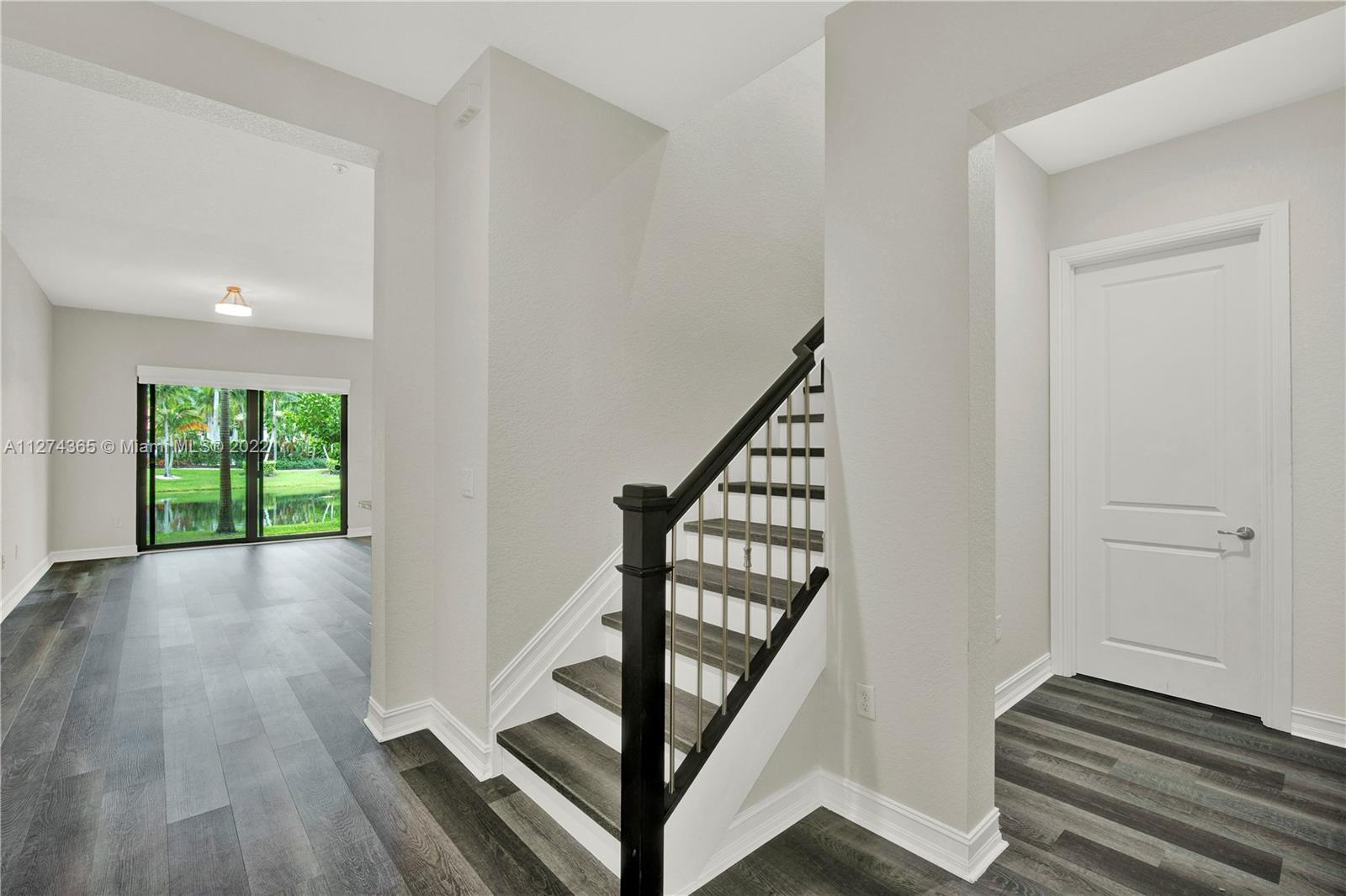 This beautiful lakefront, two-level townhome with two car garage features 3 bedrooms, 2.5 bathrooms and is located in the desirable Raintree community. Kitchen features Espresso Shaker Cabinetry, Granite Countertops, Grey Subway tile backsplash and Stainless-Steel Appliances. Upgraded iron stair rail, and vinyl wood flooring throughout first level that continues up the stairs to the primary bedroom. Primary bedroom has balcony overlooking water and two separate primary closets with custom built in cabinetry in both. Primary bathroom features dual vanities and upgraded shower with double rainfall shower heads with handhelds. Raintree is a gated community with Clubhouse, Fitness Center and Heated Pool. Townhome is vacant and was professionally cleaned and is ready for the next owner.