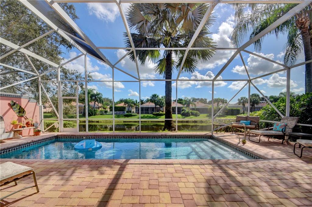 This OAKMONT has a heated pool! This most popular model is located in the resort style community of Riverwalk. Surrounded by a nature preserve, this active all ages community is the perfect place to live your best life. This home has 18 ft of glass sliding pocket doors to view the pool against the lake, enjoy the ease to truly have indoor/outdoor luxury living. The home boasts 12 ft ceilings which open up the entire space. Upgrades include: crown molding throughout, updated electrical to accommodate the generator, heat pump for the pool, built in wall unit, pull out kitchen shelving, new central vac system, granite counters. Riverwalk provides the Wifi, Cable, 24/7 manned security, full service restaurant, fitness center, hair salon, 8 Har-Tru Tennis courts, Pickleball! The wait is over!