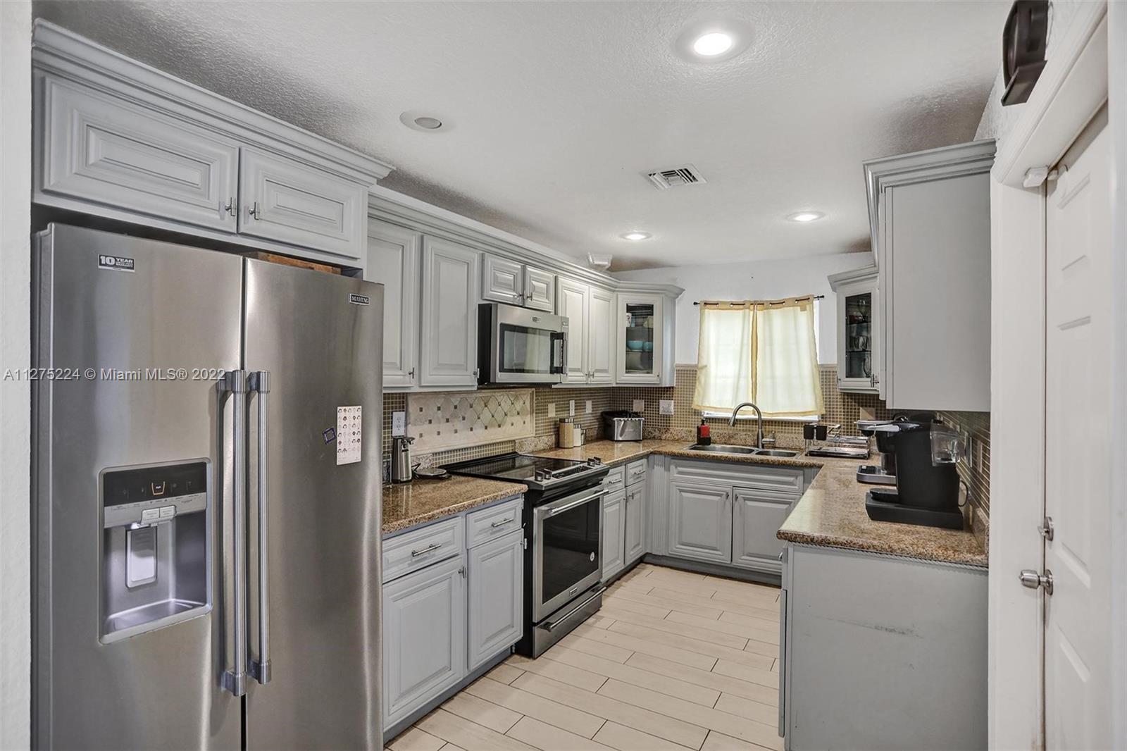 Welcome to this beautiful 3 bedroom , 2 bath home with lots of charm. This home has been remodeled with stainless steel appliances, granite counter tops in the kitchen. New wood flooring in all the bedrooms and porcelain matt tiles through the remainder of the home . Both bathrooms have also been totally renovated and to complete the look reses lighting was also added to the entire home . The home has removeable storm shutters, storm sliding doors, A/C was also replaced in 2021 . Master bedroom has his/her closet as well. WASHER/DRYER AND WINE COOLER DOES NOT CONVEY
