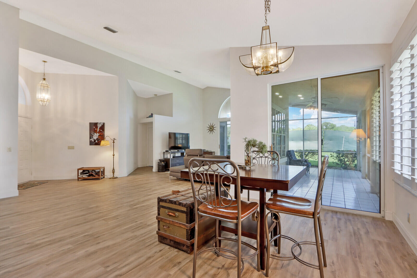 Mandatory social membership is $4,300.00, with other options available. There is a transfer fee of $3,060.00 that is required. HOA is $284.00 per month and POA is $583.00 per quarter. Popular model with high ceilings, has been thoughtfully updated with new kitchen and expanded garage space. Plantation shutters, new floors, recently installed new roof, just needs your finishing touches. Backs up to the new homes being built and close to the beautiful new clubhouse facility. This home is considered a 3 bedroom although 3rd bedroom is not enclosed and used as a den/ office currently. Come and see everyones favorite local club community.