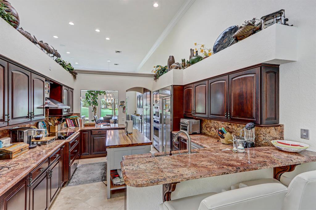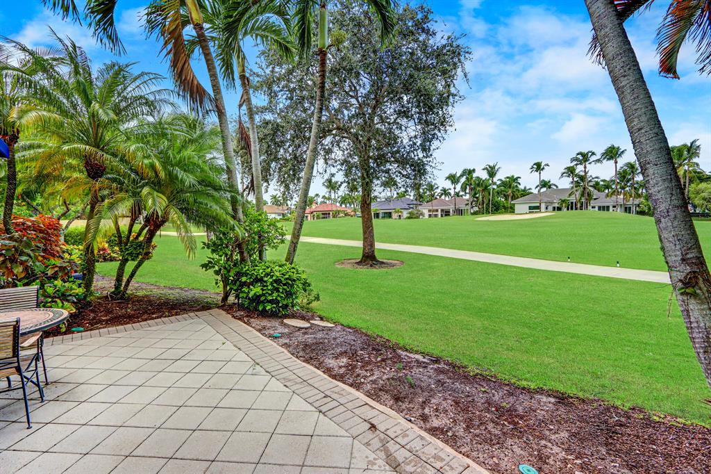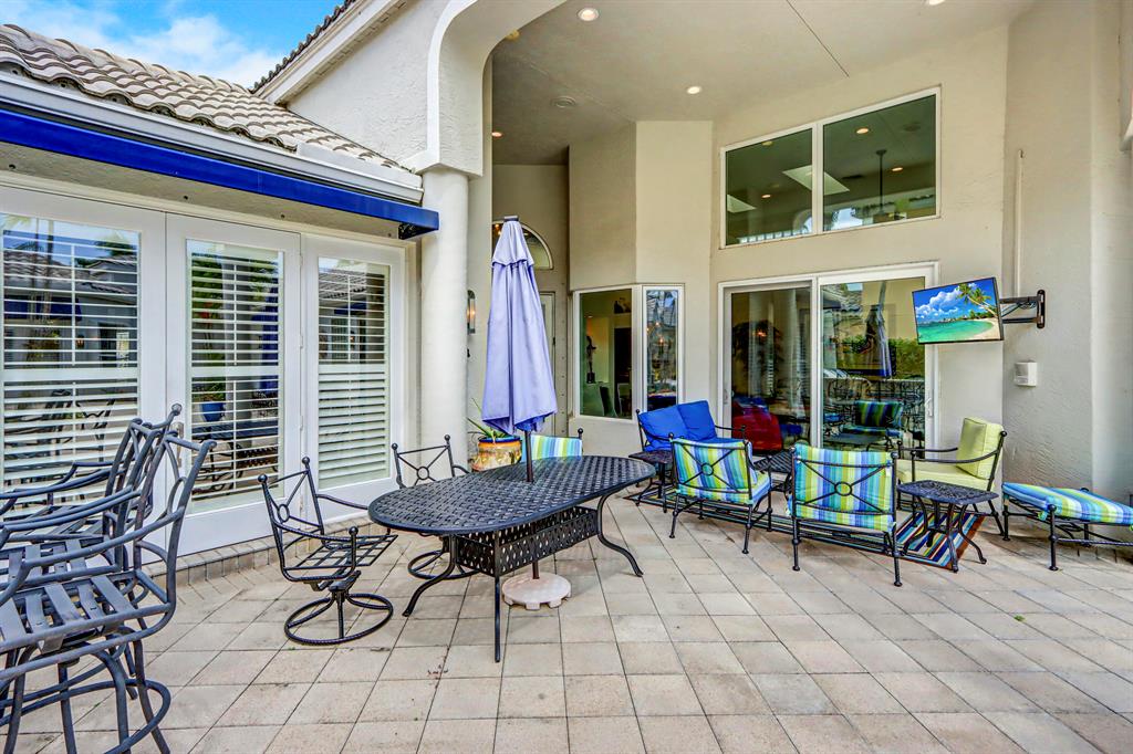 Golf course vistas fill this elegant one-story courtyard home! Enter into the inviting courtyard with a covered lanai, open patio with heated freeform pool & spa and built-in grill area. Glass double doors open into the main home of 3 bedrooms & 3 1/2 baths featuring volume ceilings with LED lighting; Saturnia marble & engineered wood floors; plantation shutters; beautiful built-in entertainment centers in the Family & Living Rooms; Sonos surround sound; granite wet bar; open kitchen with dark wood cabinetry with roll-outs, granite countertops & backsplash, stainless steel appliances about 3 years old & charming breakfast nook. The Master Suite offers a built-in dresser & desk, custom designed walk-in closets & a remodeled marble bath with light oak cabinetry, glass & quartz counters.