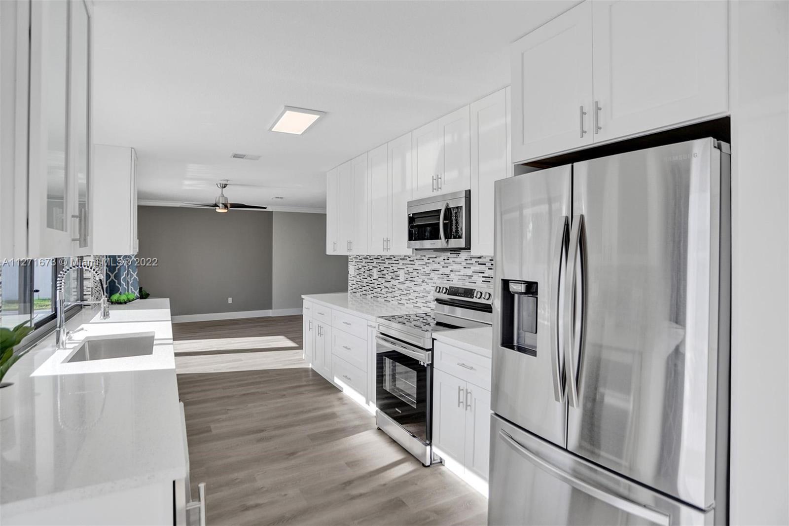 Gorgeous single-family home with over $175K in upgrades. Brand NEW Roof. NEW HURRICANE IMPACT Windows, Doors, and Garage door. NEW Gourmet Kitchen w/ quartz countertop, glass backsplash, and ALL NEW stainless steel appliances, including a wine refrigerator. Fabulously remodeled bathrooms. With spacious bedrooms, the master suite has 2 walk-in closets. NEW Waterproof flooring throughout. NEW washer & dryer. Freshly painted inside & out in neutral colors & adorned with high-end finishes & fixtures. New sprinkler system. A NEW PVC fence. A fantastic oversized backyard w/ a stunning pool & pergola, perfect for entertaining. All ages and NO HOA. Steps away from the community park. Ideal location, close to shopping & all major highways.