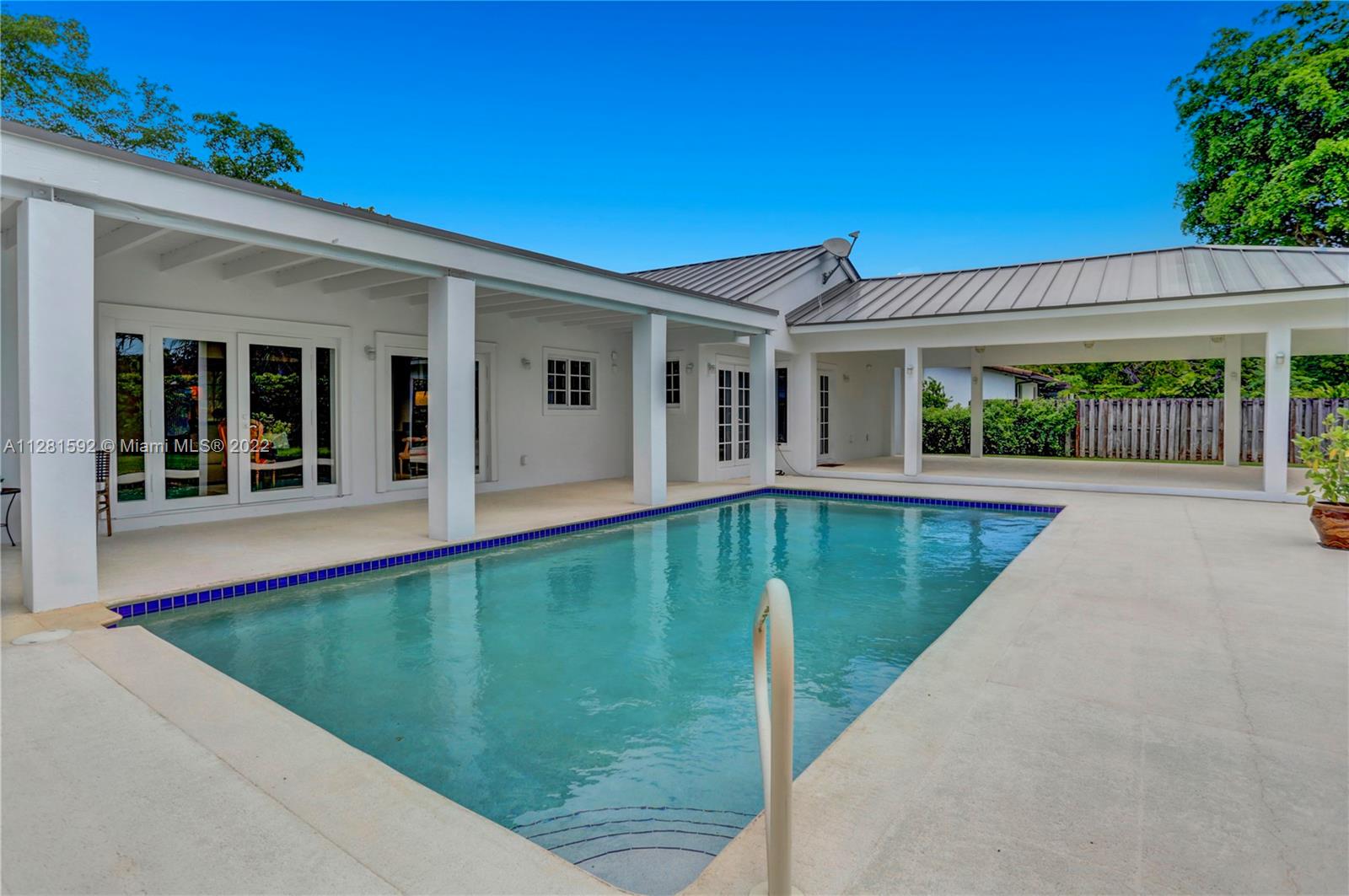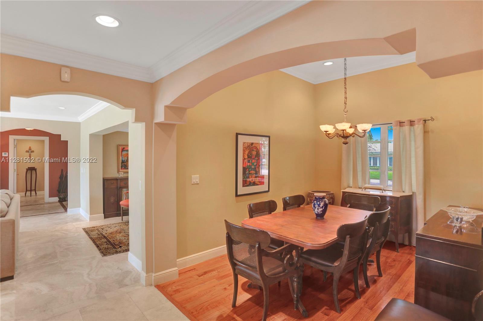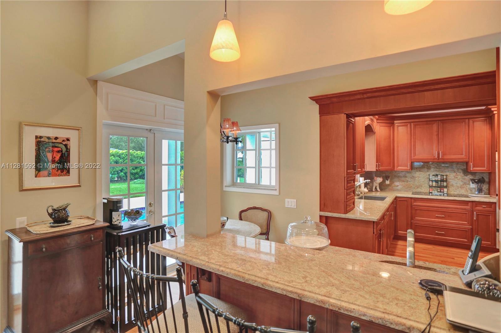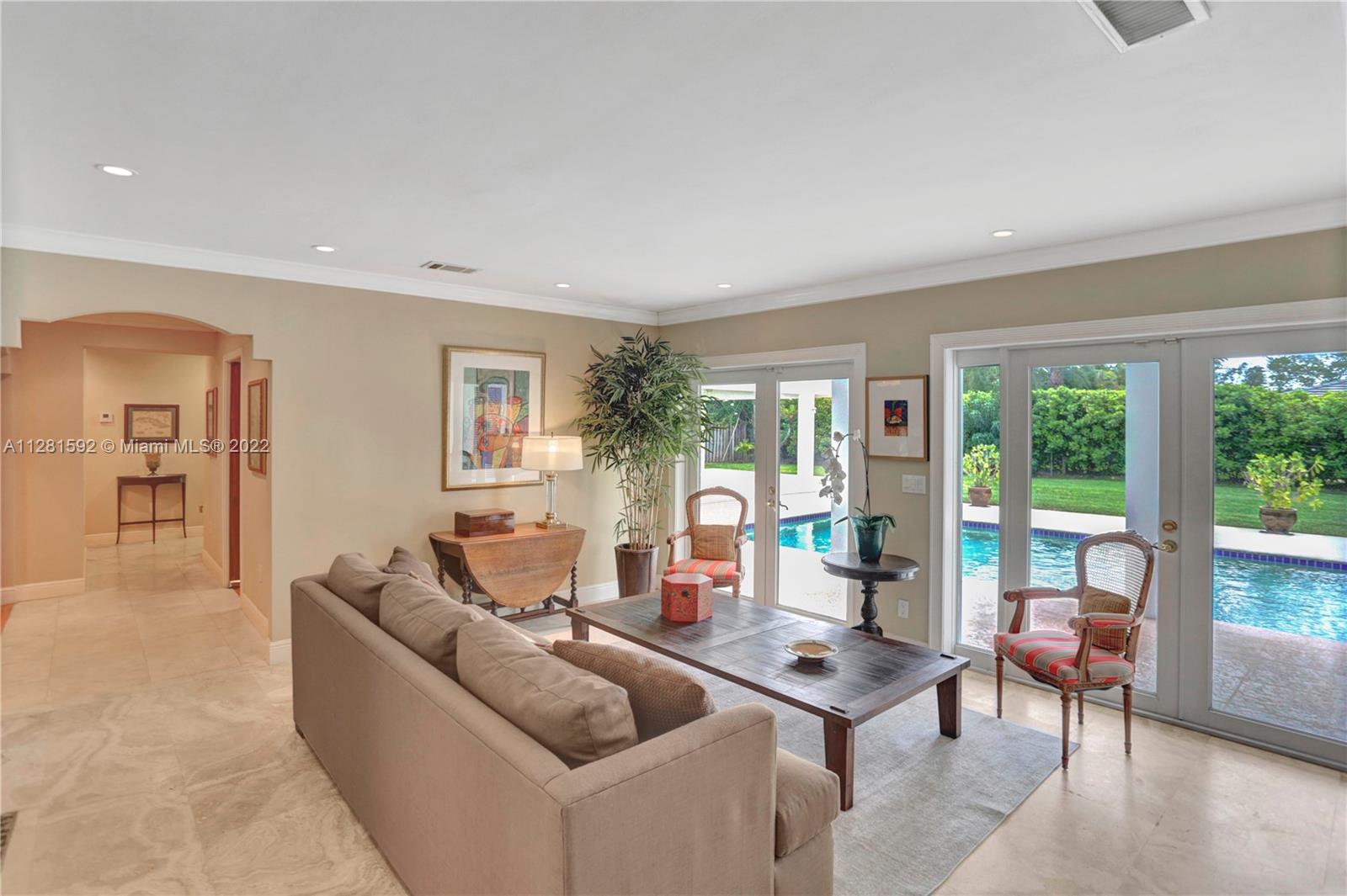 Drive down the tree-lined street in a prime section of Pinecrest to this beautiful home. This home has a wonderful floor plan with the kitchen open to the large family room. The family room has high, vaulted ceilings. There are lovely architectural details in the interior. The backyard is very private and features a large patio and a large, covered area that would be perfect for an outdoor kitchen. There is a sparkling pool and fenced yard. Home is located on a quiet corner lot with double-door gate on the side for ease of access to park a boat.