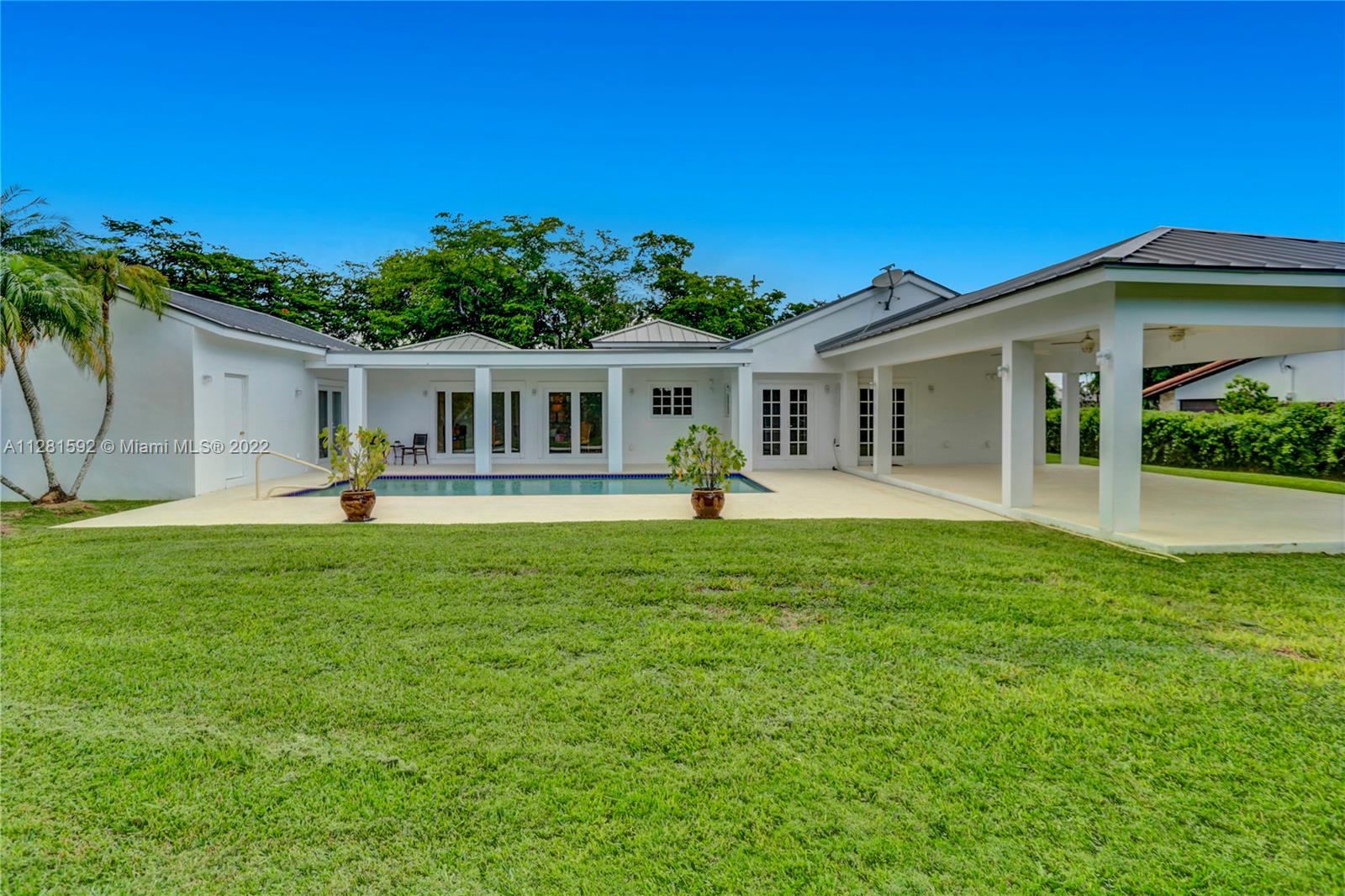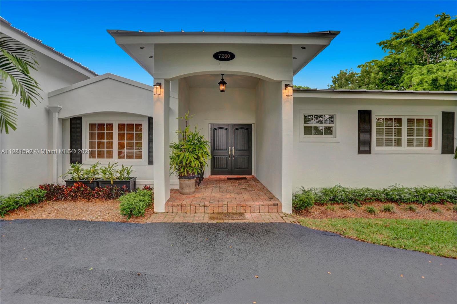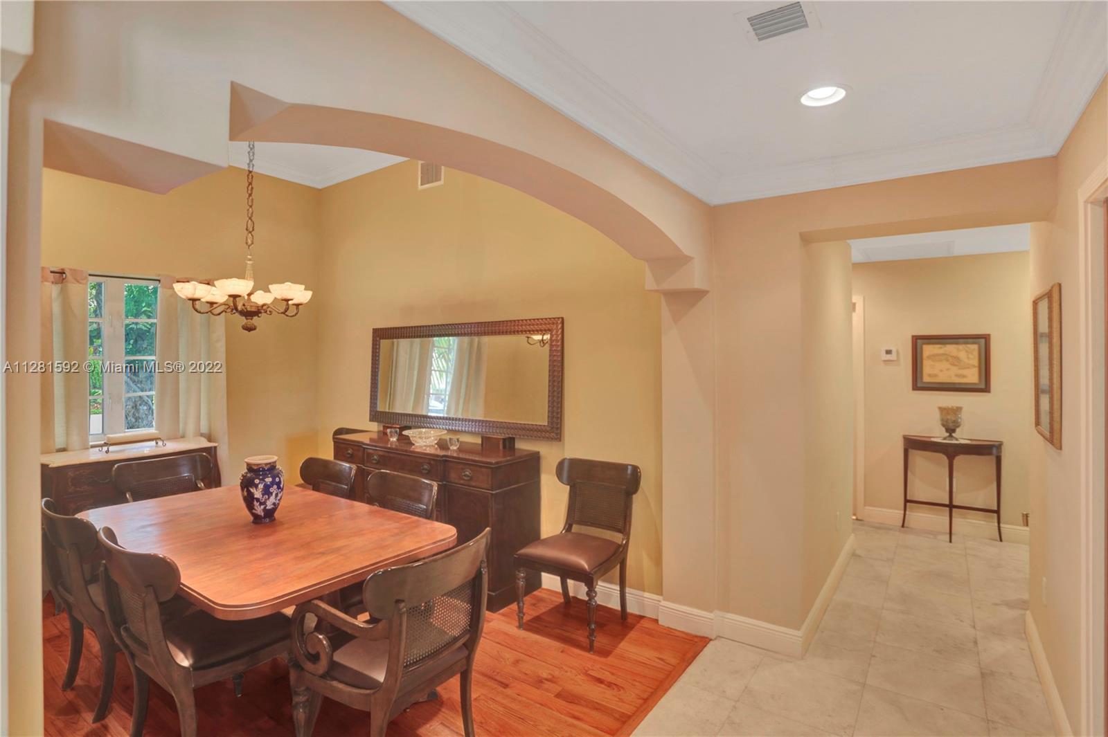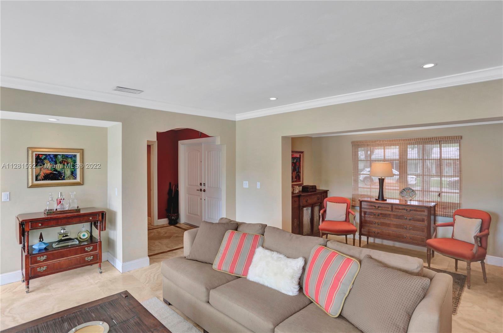 Drive down the tree-lined street in a prime section of Pinecrest to this beautiful home. This home has a wonderful floor plan with the kitchen open to the large family room. The family room has high, vaulted ceilings. There are lovely architectural details in the interior. The backyard is very private and features a large patio and a large, covered area that would be perfect for an outdoor kitchen. There is a sparkling pool and fenced yard. Home is located on a quiet corner lot with double-door gate on the side for ease of access to park a boat.