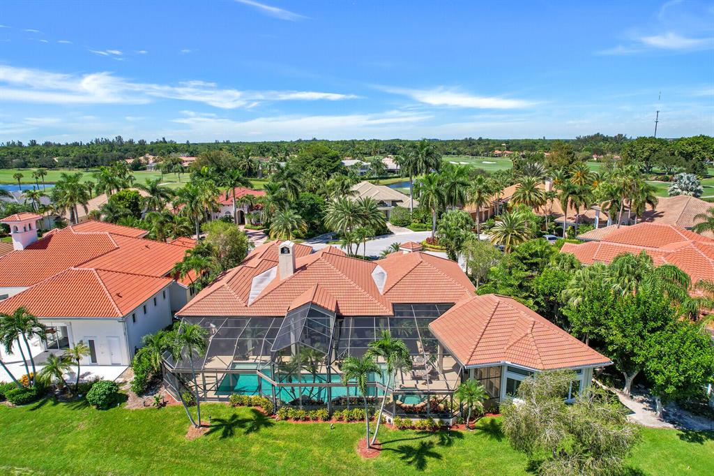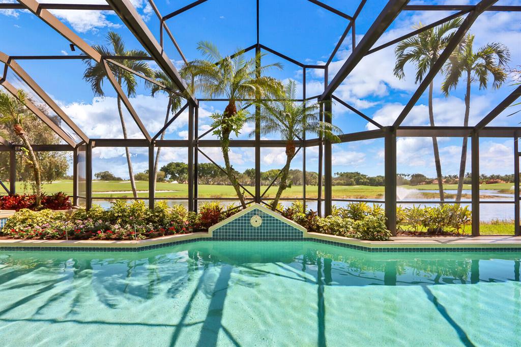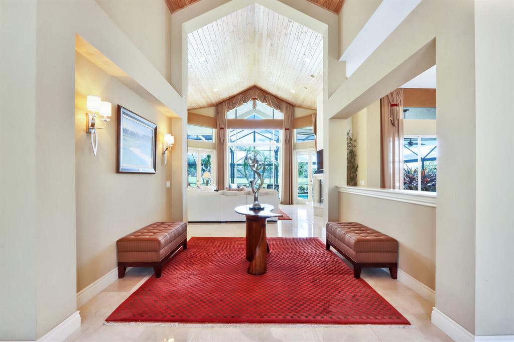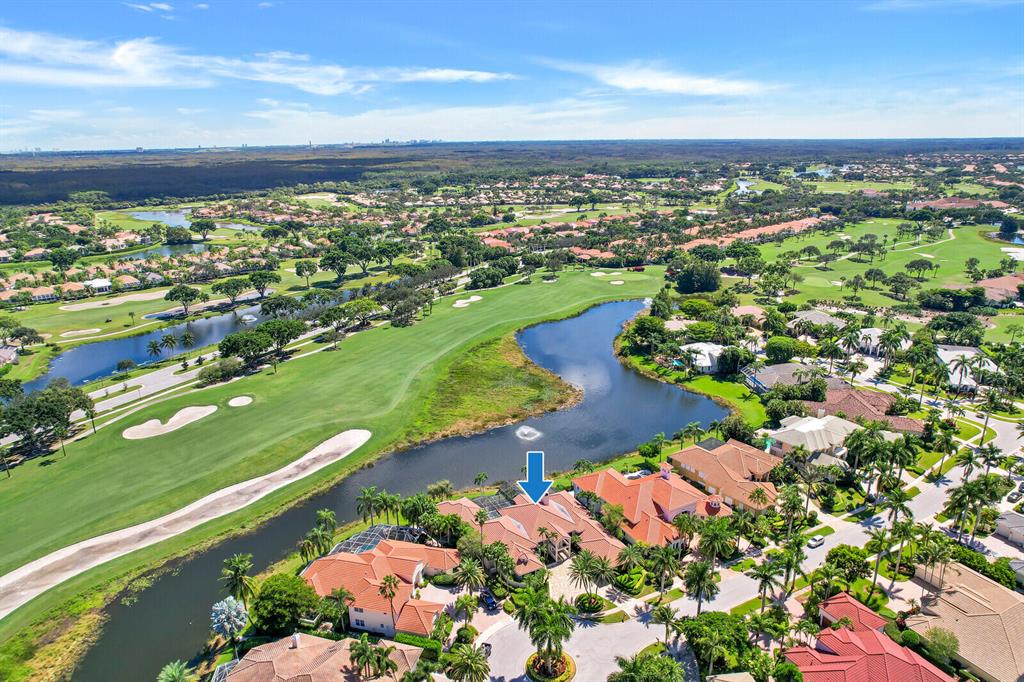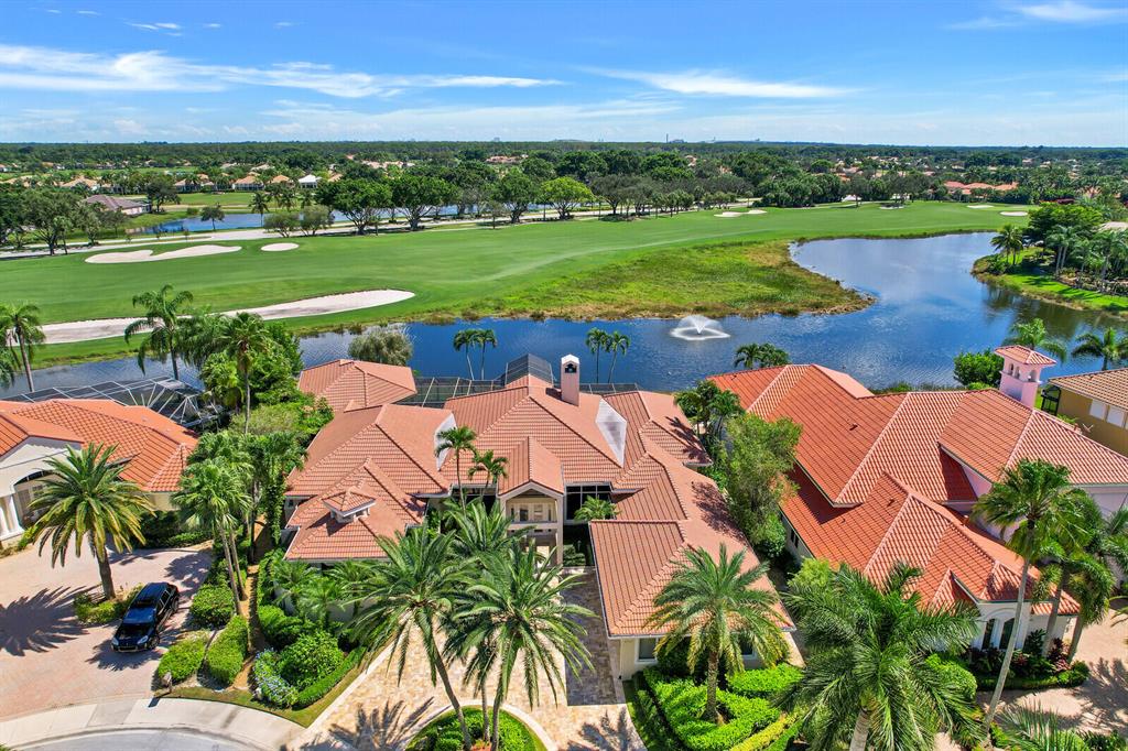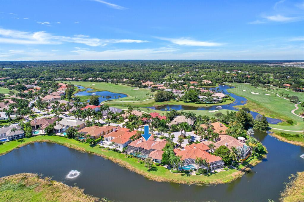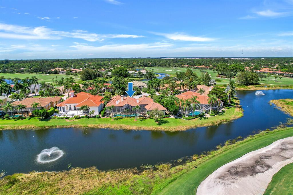Prime CUL-DE-SAC location in desirable Egret Meadow with BREATHTAKING WATER AND GOLF VISTAS of the Jack Nicklaus-designed 8th fairway of the Legend course. This magnificent custom contemporary home is an ARCHITECTURAL MASTERPIECE harmoniously integrating the best of indoor and outdoor Florida living. From the herringbone pattern travertine driveway, you'll appreciate the custom, one-of-a-kind feel of this unique home. A dramatic vaulted front porch ceiling with wood accents welcomes you, and the design feature continues inside, into the WOW-foyer and over-the-top living room that looks like it could be a lobby for a tropical resort.