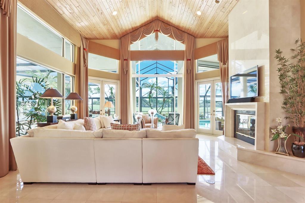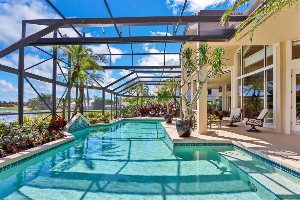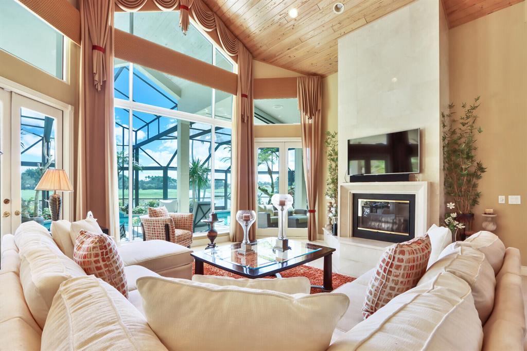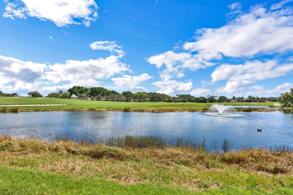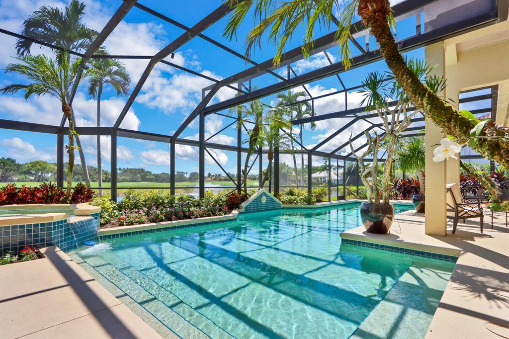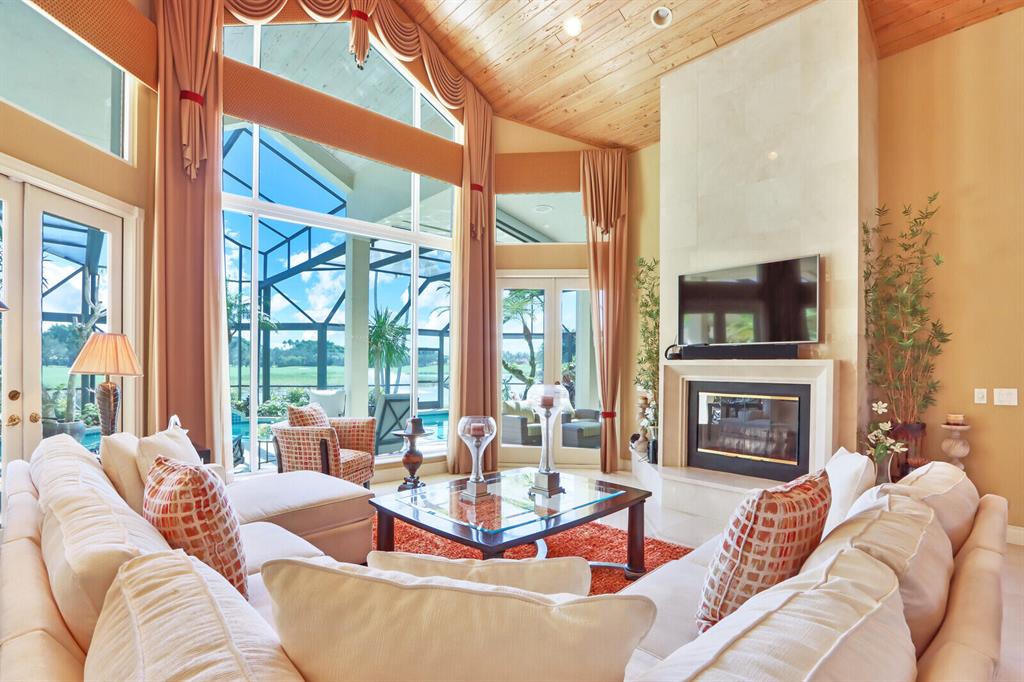 Prime CUL-DE-SAC location in desirable Egret Meadow with BREATHTAKING WATER AND GOLF VISTAS of the Jack Nicklaus-designed 8th fairway of the Legend course. This magnificent custom contemporary home is an ARCHITECTURAL MASTERPIECE harmoniously integrating the best of indoor and outdoor Florida living. From the herringbone pattern travertine driveway, you'll appreciate the custom, one-of-a-kind feel of this unique home. A dramatic vaulted front porch ceiling with wood accents welcomes you, and the design feature continues inside, into the WOW-foyer and over-the-top living room that looks like it could be a lobby for a tropical resort.
