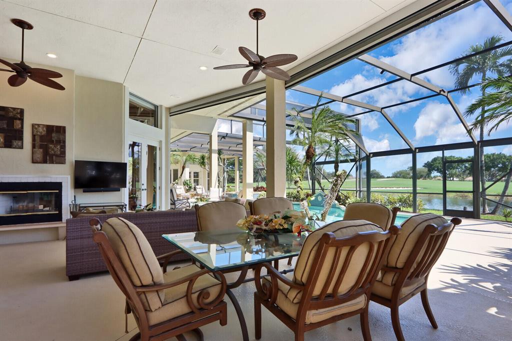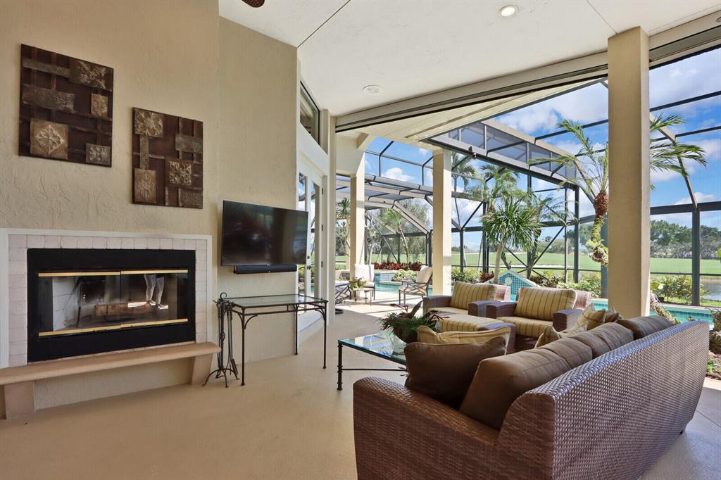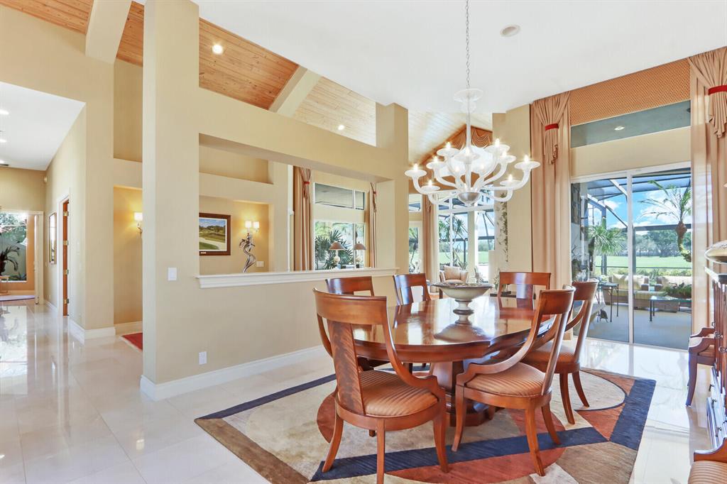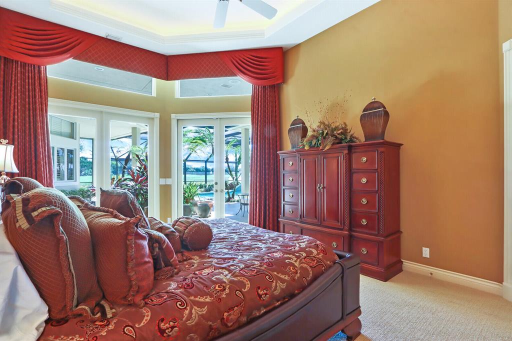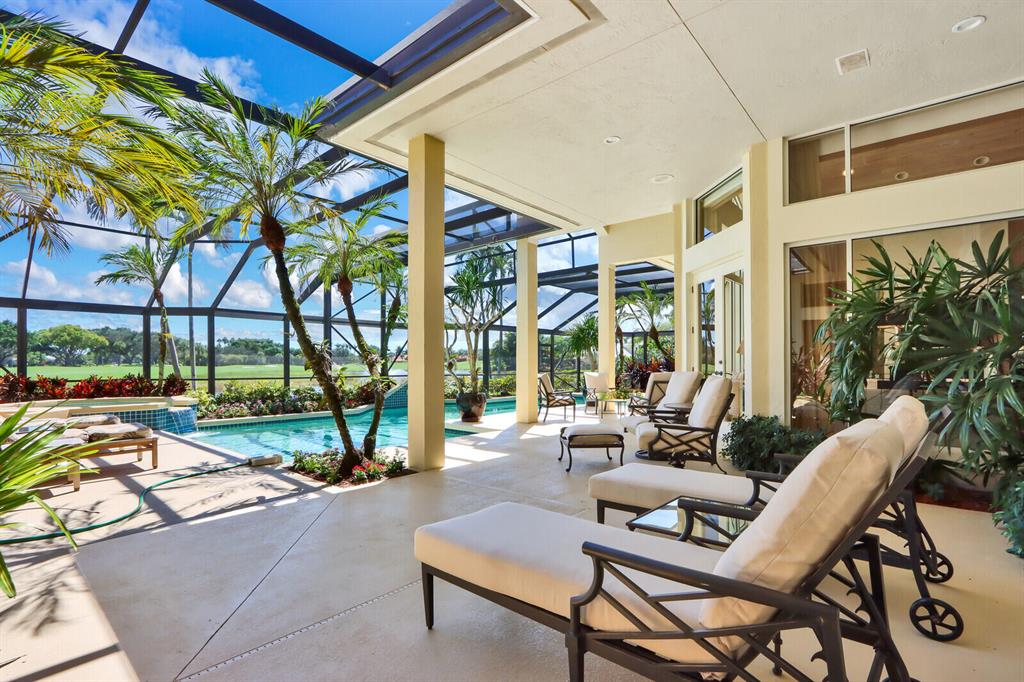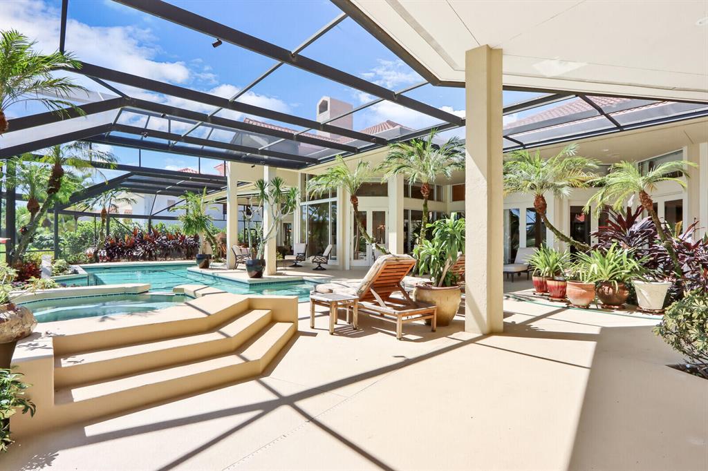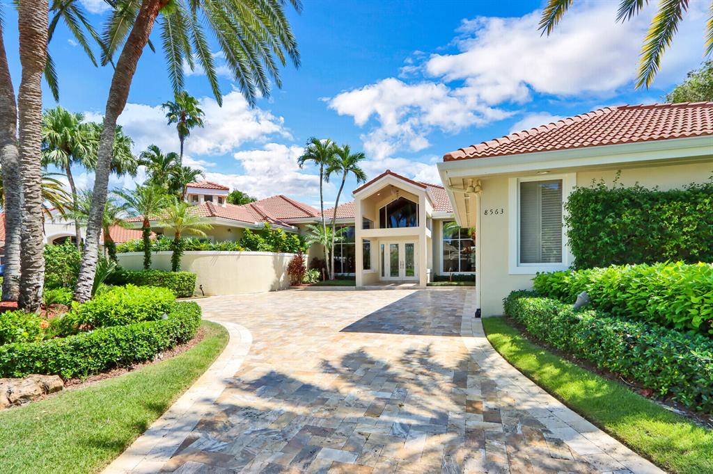 Prime CUL-DE-SAC location in desirable Egret Meadow with BREATHTAKING WATER AND GOLF VISTAS of the Jack Nicklaus-designed 8th fairway of the Legend course. This magnificent custom contemporary home is an ARCHITECTURAL MASTERPIECE harmoniously integrating the best of indoor and outdoor Florida living. From the herringbone pattern travertine driveway, you'll appreciate the custom, one-of-a-kind feel of this unique home. A dramatic vaulted front porch ceiling with wood accents welcomes you, and the design feature continues inside, into the WOW-foyer and over-the-top living room that looks like it could be a lobby for a tropical resort.
