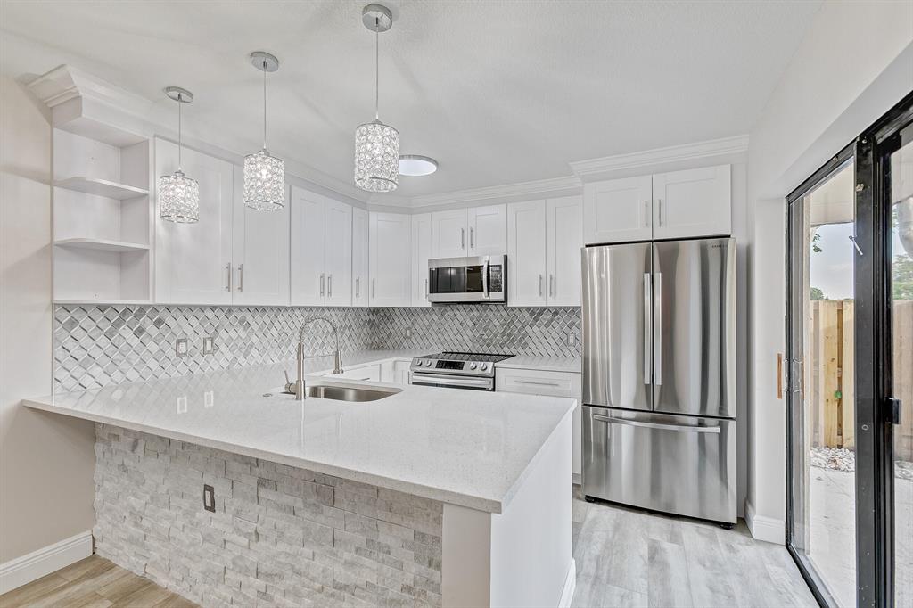 Enjoy South Florida living from this STUNNING WATERFRONT townhome renovated to perfection! Privately tucked away overlooking expansive lake views, this beautifully appointed townhouse has 2 bedrooms, 2.5 baths, over 1,200 SF of living area with new interior paint, textured ceilings (no popcorn), and luxurious vinyl plank flooring. Open and spacious floor plan, perfectly equipped with gourmet kitchen complimented by custom crown molding and soft-close cabinets, sparkling Quartz counter tops, stainless steel appliances, designer backsplash, extended breakfast bar accented by stone tile decorative wall, new faucet, sink, and LED lighting. 1st floor offers spacious living room and dining area, renovated laundry/powder room with new washer and dryer, new vanity, sink, mirrors, and lighting!