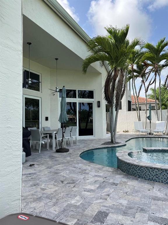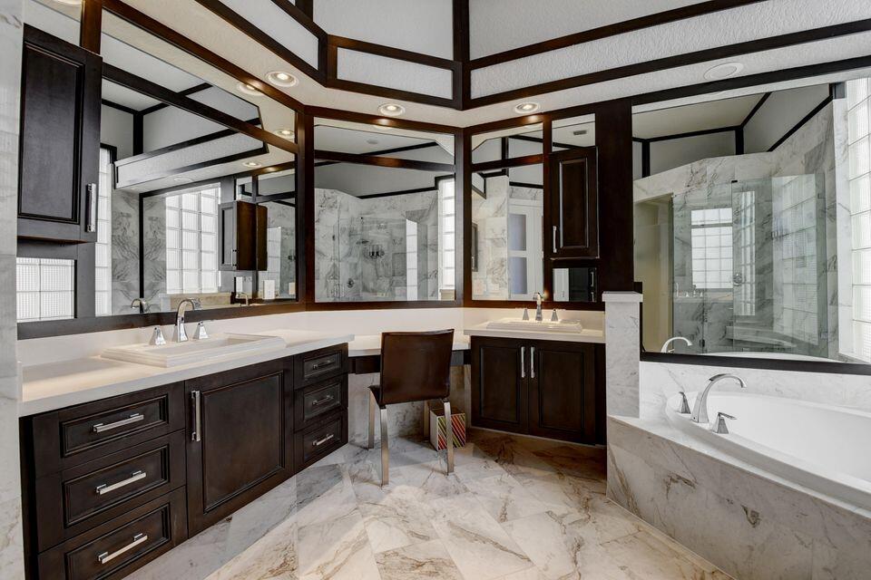 Tranquil golf course vistas fill this remodeled contemporary 1-story of 3 bedrooms + office & 2 1/2 baths. This exquisitely finished home features a wood & glass double door entry;volume ceilings with extra high-hats & crown moldings;beautiful white porcelain tile floors; elegant wall panel craftsmanship; a stunning gourmet island kitchen with white shaker-style cabinetry,Carrera marble countertops,marble backsplash & stainless steel appliances;built-in Family Room entertainment center;a fabulous wet bar with granite counter, stone backsplash & wine refrigerator;beautifully crafted office with built-in cabinetry,desk,Murphy bed & ceiling detail;remodeled contemporary Master & secondary baths;custom window treatment design & an inviting open patio with pool & spa overlooking the golf cours