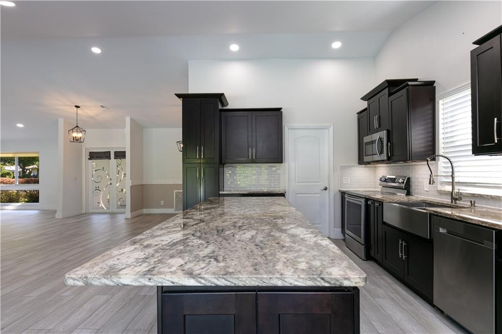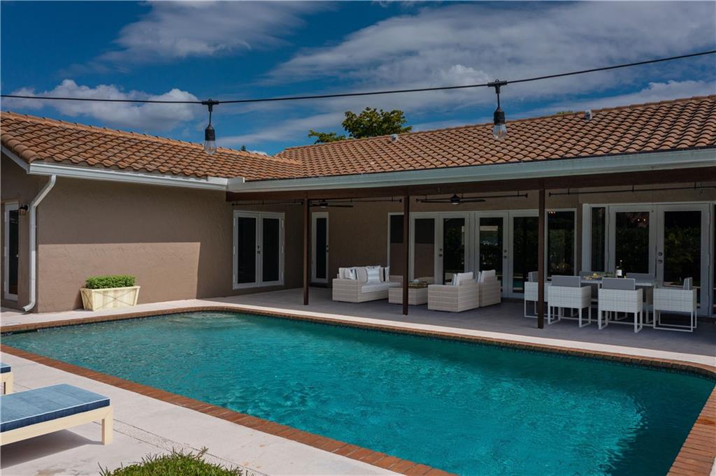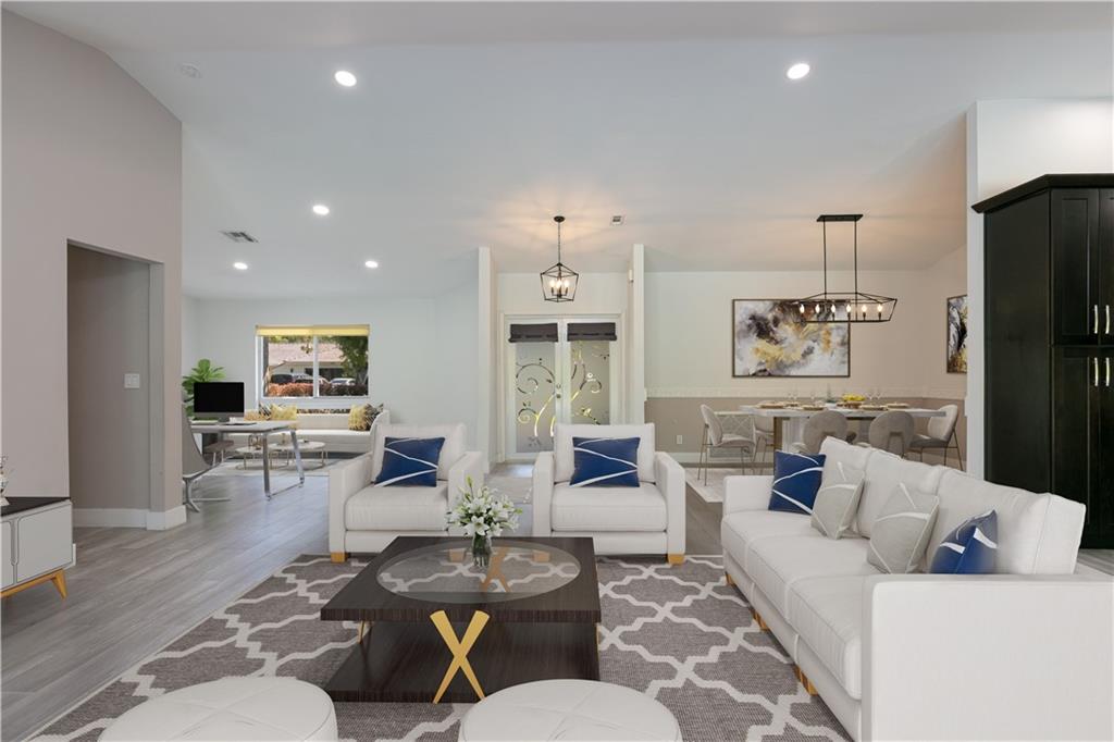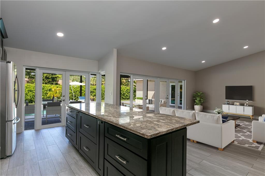 MOVE RIGHT IN, EVERYTHING HAS BEEN DONE FOR YOU! Open floor plan & gorgeous kitchen w/ a 9' island make this a great entertaining space. Separate living room can easily be converted to your home office / 4th bedroom. Insurance concerns? This home has a 2019 roof & IMPACT windows / doors. Porcelain wood look plank flooring throughout, kitchen updated w/ Procraft wood cabinetry w/ soft close doors/drawers, lg. center island, granite countertops, glass tile backsplash, farmhouse style sink & Samsung stainless steel appliances. Other great features include multiple sets of IMPACT French doors all w/ access to the patio/pool, both bathrooms fully updated, fenced 1/4 acre lot, covered patio, salt chlorinated pool, water heater '21, new garage door opener & sprinklers that run off canal & NO HOA.