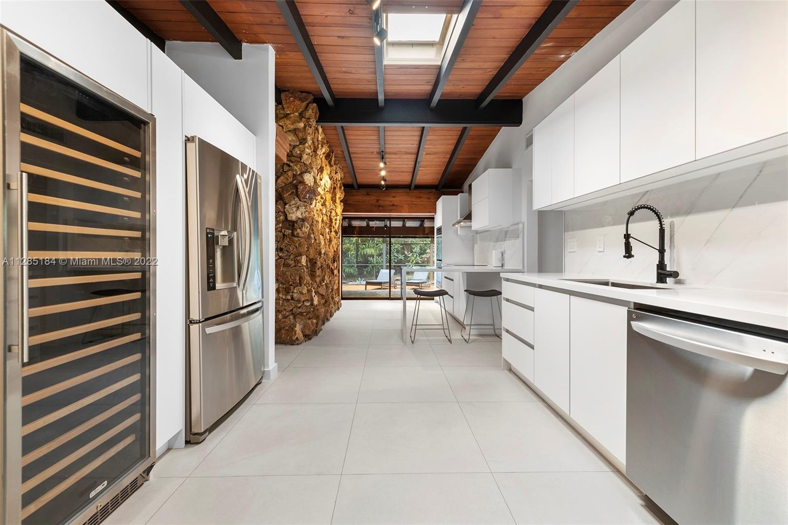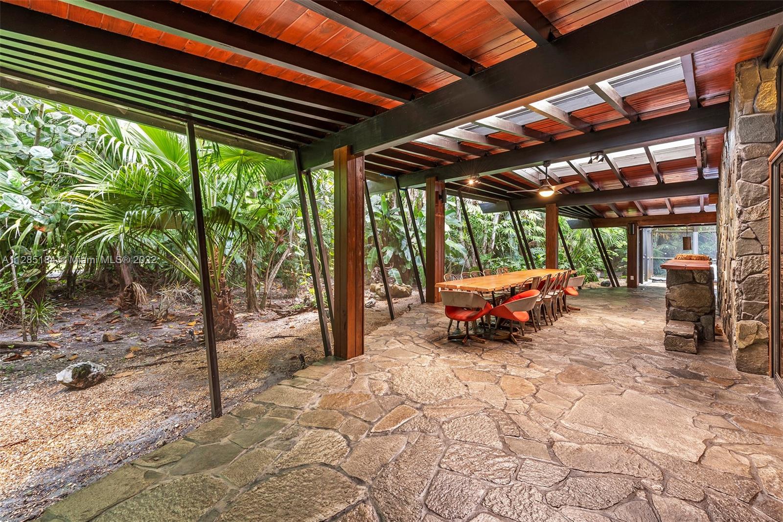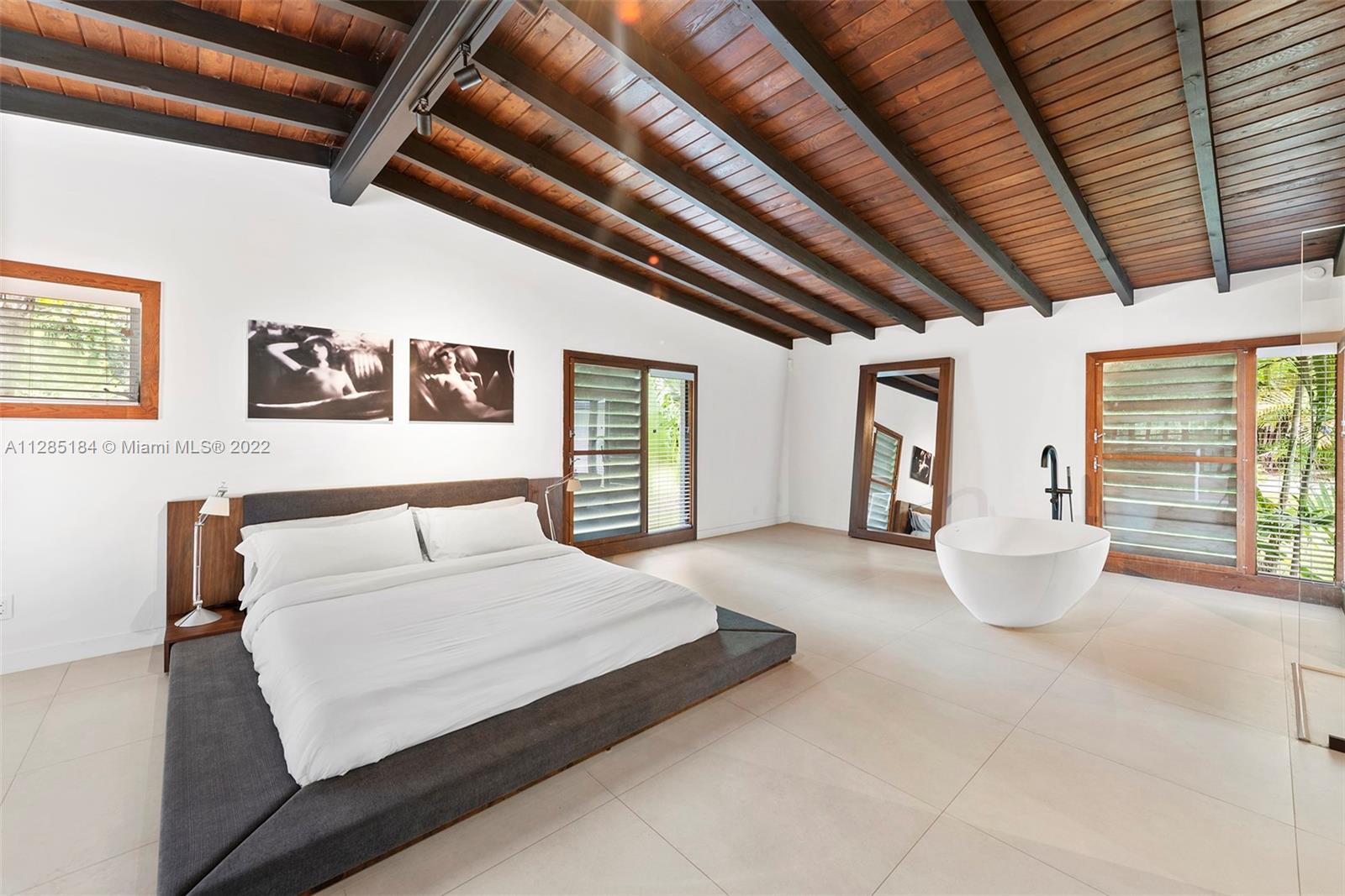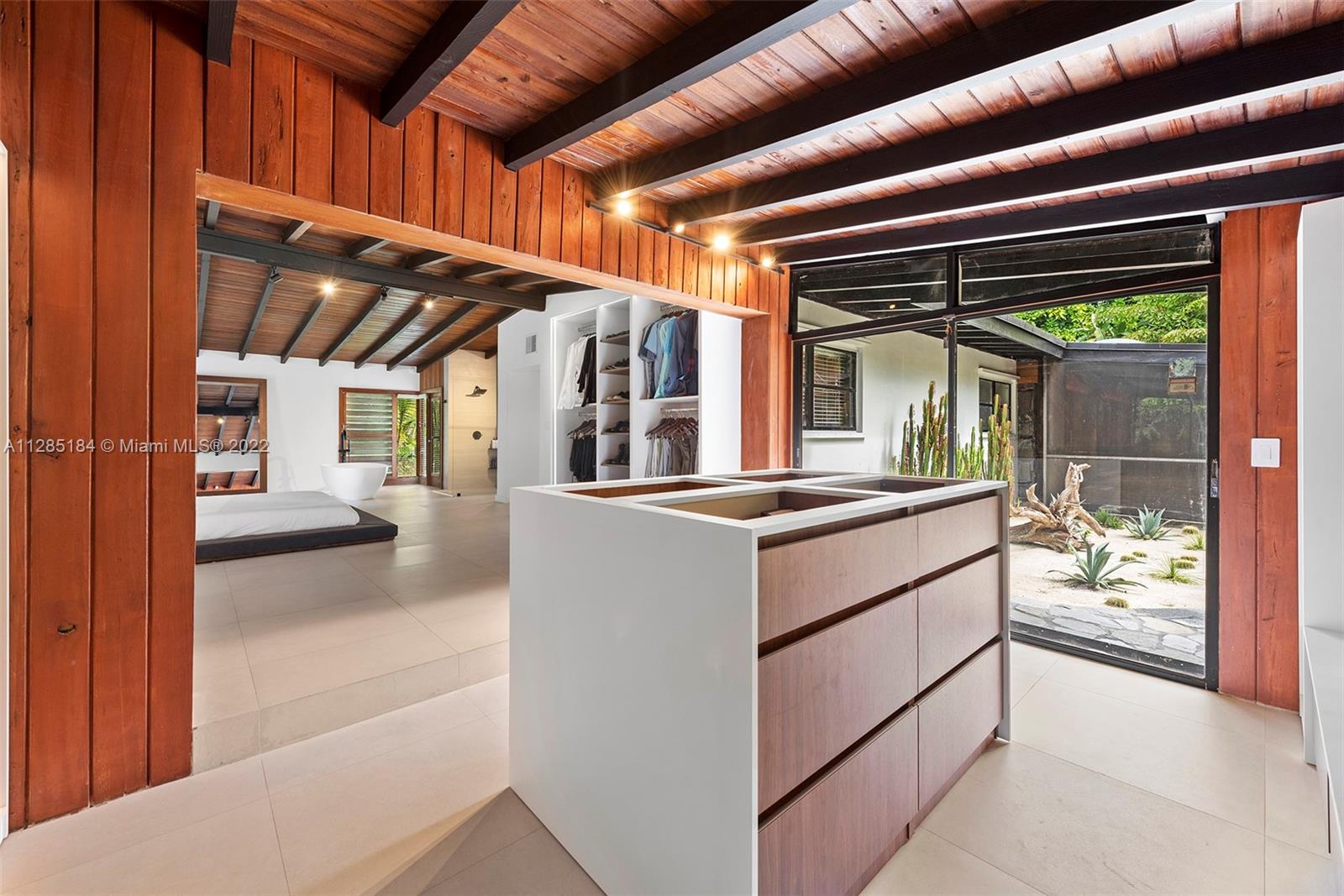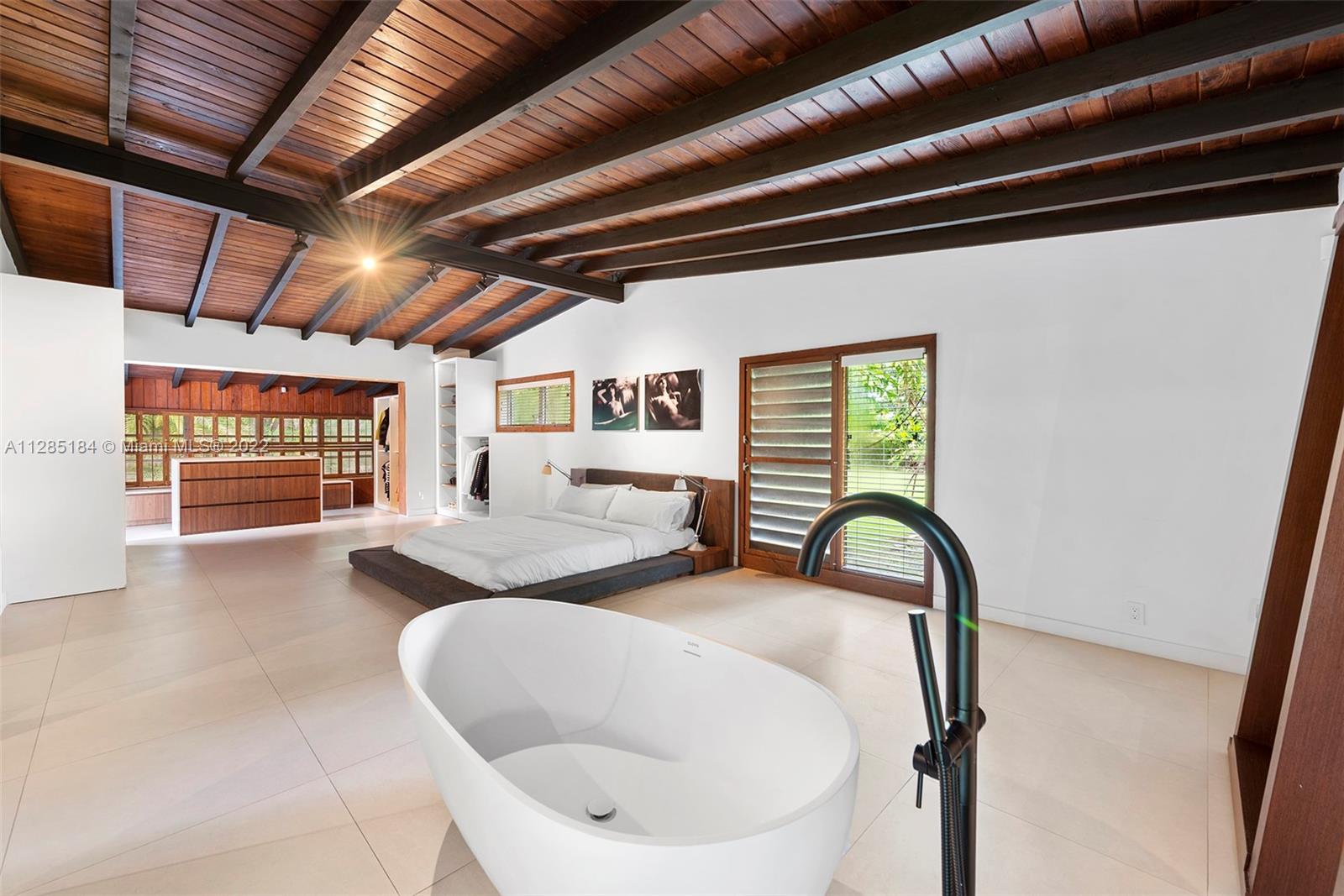 Stunning, ultra-private luxury home designed by renowned modernist architect Alfred Browning Parker. Completely renovated, the unique, nature-inspired home has 3 beds (converted from four) and 2 baths with new porcelain tile throughout. Spanning 3,181 square feet, the open concept living spaces display masterpiece craftsman touches including vaulted, beamed ceilings, original onyx rock fireplace, and exterior gray slate from Colorado. A brand-new kitchen features state-of-the-art appliances, wine fridge, white quartz counters with breakfast bar, and custom white cabinets. The spacious master suite has custom his/her closets with lighting and a designer open bathroom with dual sinks, Toto toilet and bidet, glass shower, and Clovis standalone soaking tub looking out to the garden.