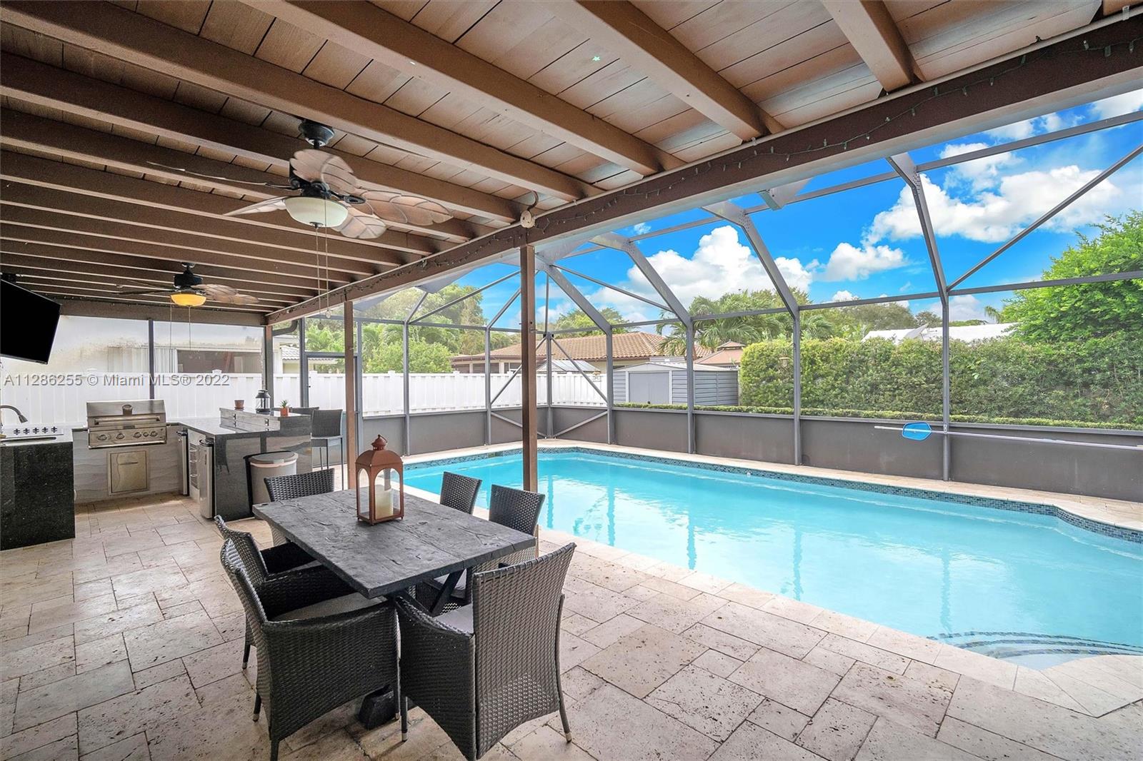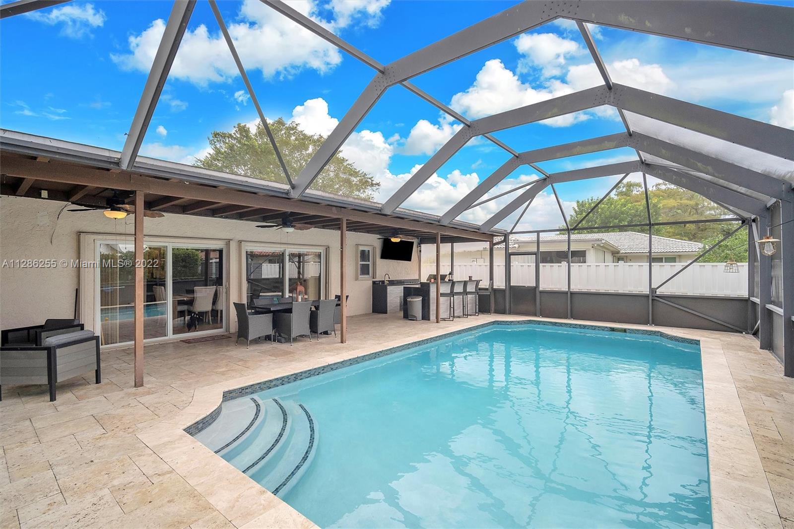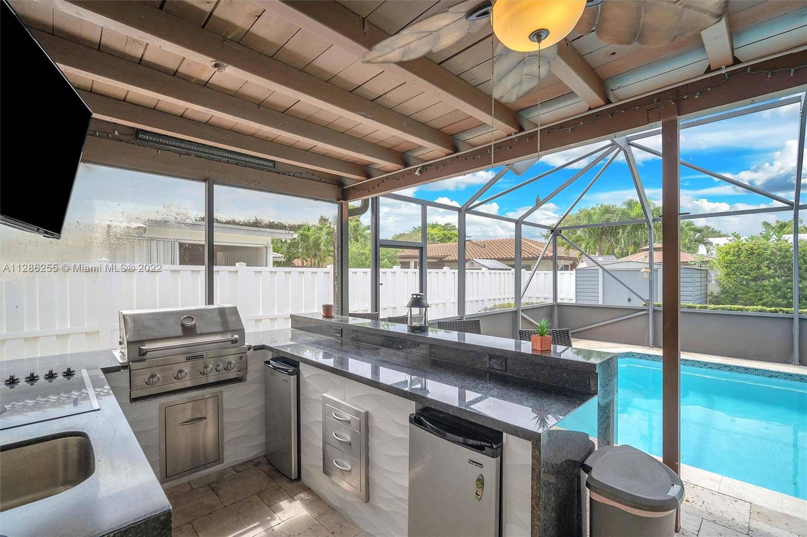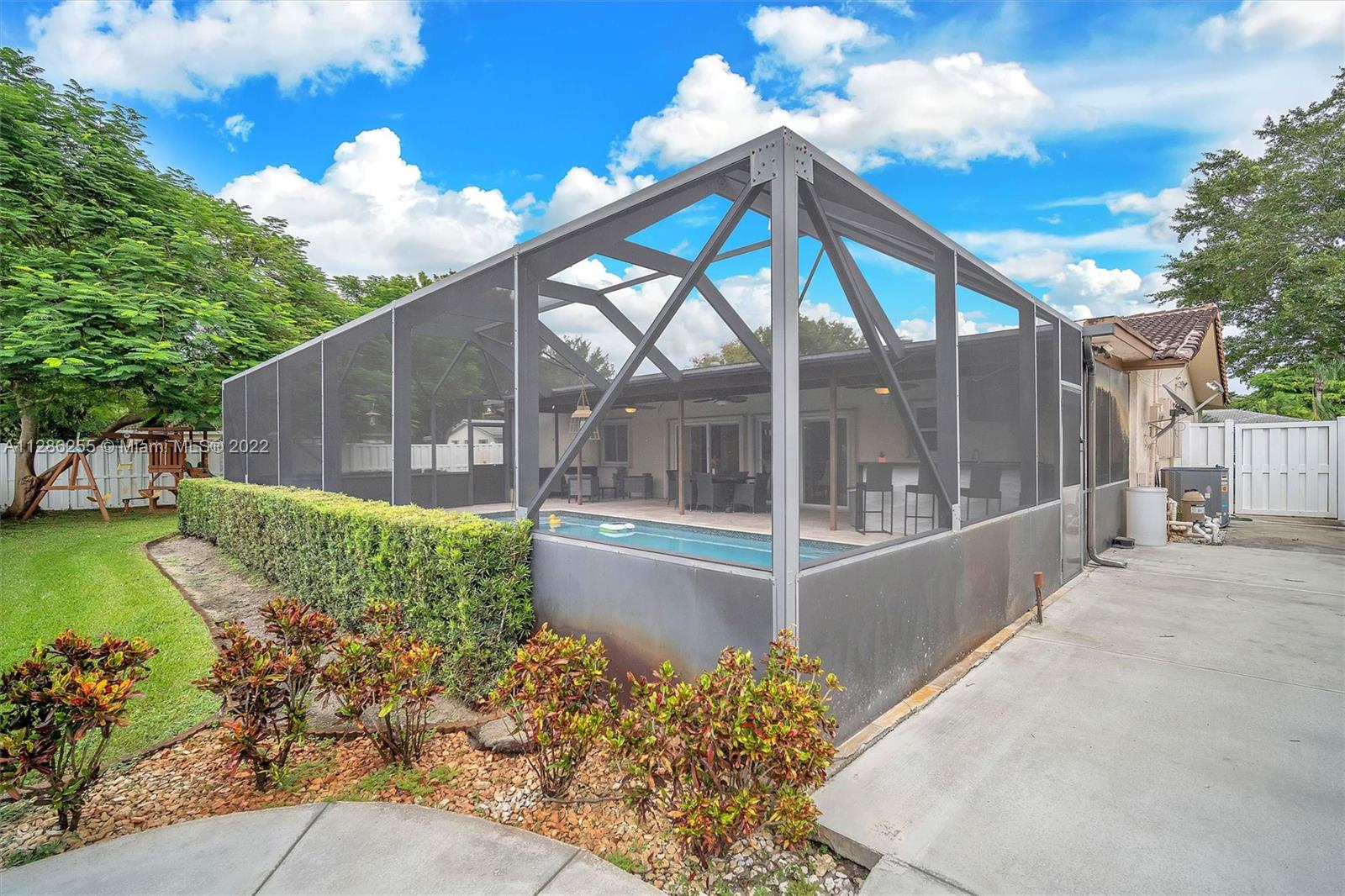 Immaculately designed 4/3 home with a pool in Coral Springs on a corner lot! This 1-story split floor plan home features: New energy efficient windows, accordion shutters, hurricane rated garage door, huge circular driveway, family room, breakfast area, kitchen granite counter tops, SS appliances, 24” porcelain tile floors thru-out living area, 18” porcelain tiles in bedrooms, walk-in closets, knockdown ceiling texture throughout, spacious master, screened in pool, Fully equipped outdoor kitchen, Travertine pool deck, Safety gate Diamond bright finished heated pool w/newer pool pump and fenced backyard perfect for entertaining, yard shed. No HOA. NEW Epoxy garage flooring with Mini Split AC.