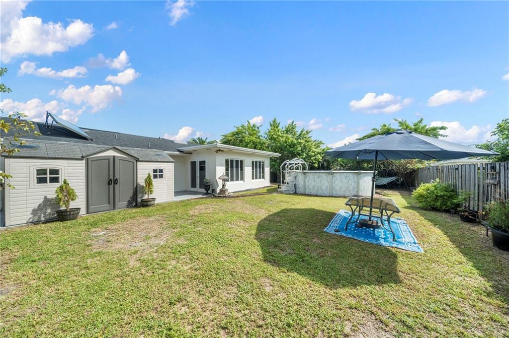 Nicley updated 3 bedrooms, 2 bathrooms, 1 car garage, pool home. It has one of the largest fenced yards in the Boca Trails community. Home features an open & spacious split floor plan. Updated kitchen with wood cabinets & newer Ss Appliances and updated bathrooms. Has tile throughout the living areas and wood floors in the bedrooms. Freshly painted inside & outside, Impact glass windows & doors throughout. Corner lot, Circular driveway and is on a double cul-de-sac so there is no drive through traffic. New roof August 2022! Newer electrical panel! Solar panel on the roof for water heating. Lower energy consumption tank. No HOA Fees & No restrictions! Two storages sheds; a large 8 x 15, and a small one 3 x 6. Community is located in a Great School district! Professional Photos Coming Soon!
