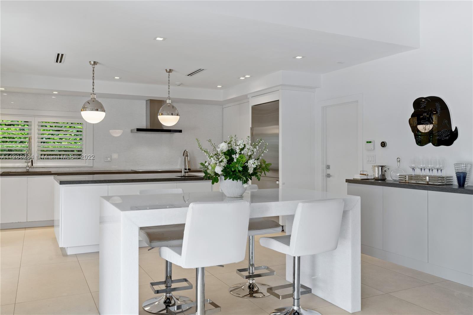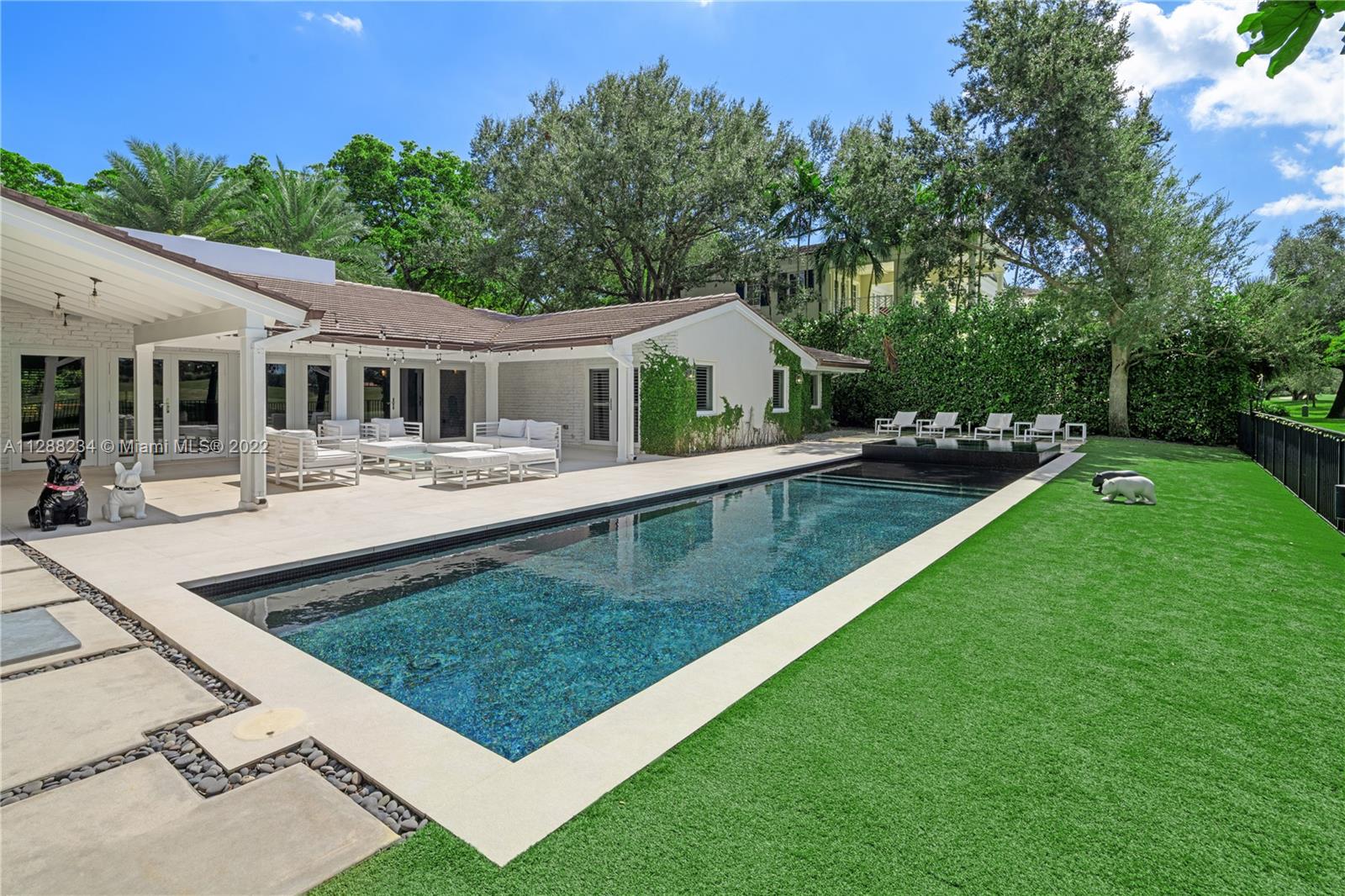 Situated on one of the most gorgeous streets in the original George Merrick Pioneer Village. Perfectly positioned on the 15th hole of the Riviera Golf Course with breathtaking views. The 2016 home remodel included replacement of roof, electric, plumbing, and all interior and exterior finishes. Open concept floor plan with living and dining room, cohesive to family room and kitchen area features pre-wired Sonos sound system, gas fireplace and high ceilings – prime for entertaining family and friends. Stunning views from your backyard terrace is complete with plenty of space for lounging and hanging out by the heated salt-water pool. Built-in Summer kitchen with barbecue, ice maker and beverage refrigerator. This is a fabulous opportunity to own a house on the coveted Santa Maria Street.