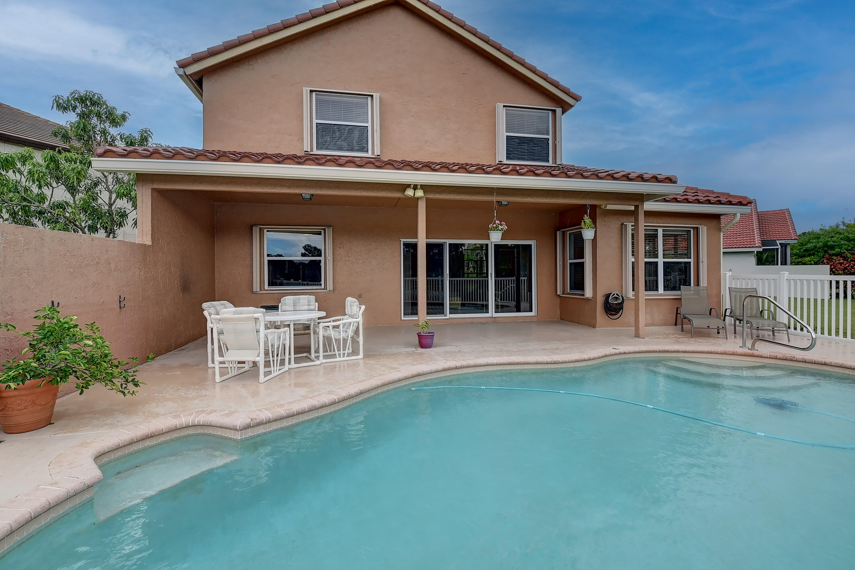 Boca Winds Carmel Model. Clean, bright, and airy describe this beautiful 4-bedroom 3-full bath, pool home located on an over-sized cul-de-sac prime lakefront lot. Soaring ceilings in the living room and dining room. The kitchen features a walk-in pantry, breakfast area as well as counter seating. The kitchen overlooks the family room with plenty of natural lighting from the bay window and patio doors. The view from the kitchen and family room is of the pool, patio, and lake...A fourth bedroom which is on the first floor is opposite a remodeled bathroom, which is perfect for guests or a home office. The master bedroom suite is spacious and features a double door entrance, volume ceiling and 2 custom walk-in closets.