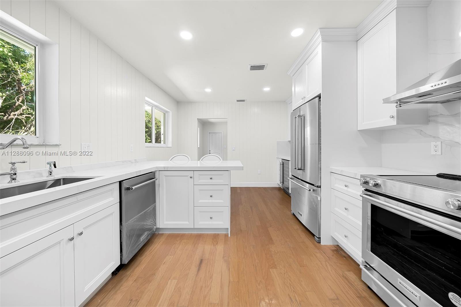 Immaculately presented and recently renovated 2,967 Sq. Ft. home with 3 bedrooms and 2 bathrooms, offering privacy and serenity. The light-filled and spacious floor plan highlights beautiful living areas, with every detail thoughtfully attended to. A formal dining area with wood floors is adjacent to the gourmet kitchen. Featuring a quartz eat-in peninsula island and new stainless-steel appliances, the kitchen flows effortlessly to a comfortable den area. The principal bedroom has an ensuite bathroom and spacious closet. Other features include custom designer light fixtures throughout, French doors, plantation shutters, artificial grass, and a 2-car garage with carriage-house style doors. Great location close to schools, universities, hospitals, shops, and restaurants.