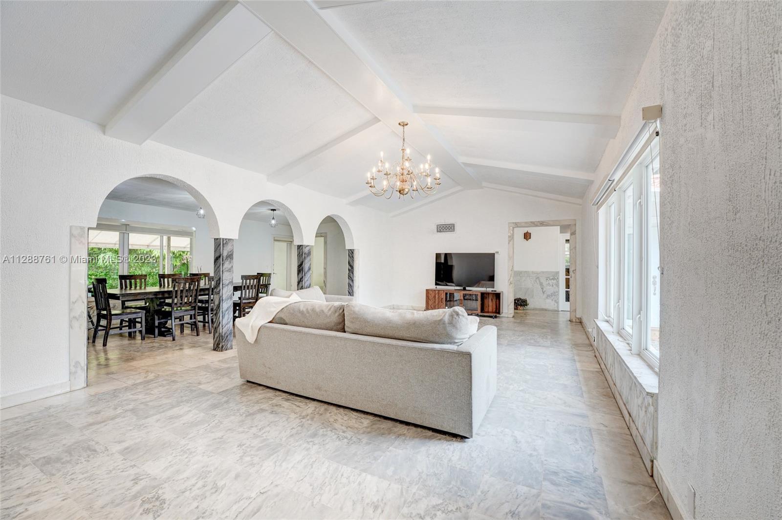 Spacious one-story Coral Gables home with 2,662 sqft of living space, set on a 10,700 sqft lot ($524 per SqFt). Located on a tranquil street with no through traffic. A welcoming courtyard leads you into an open living room with a vaulted ceiling. The family/dining room overlooks the covered terrace and garden. Eat-in kitchen features a gas range and built-in wine fridge. Split plan layout with very large bedrooms. A bonus room besides the kitchen works perfectly as an office/playroom. The home also features impact windows and doors throughout, separate laundry/utility room, tankless water heater, zebra blinds, spacious back and side yard, marble flooring and more. Fantastic location near downtown Coral Gables.