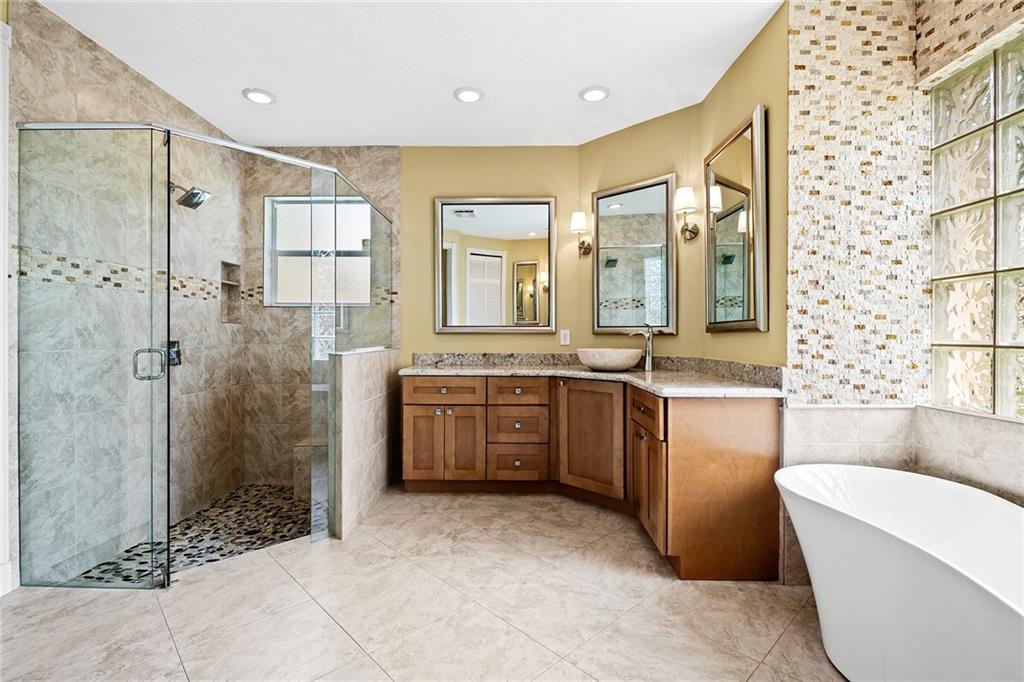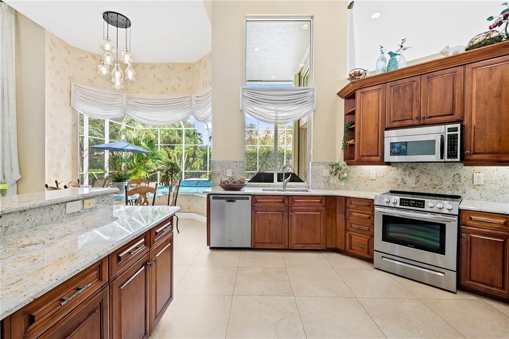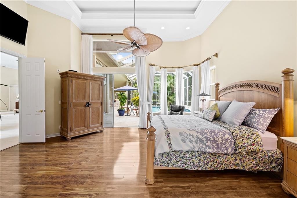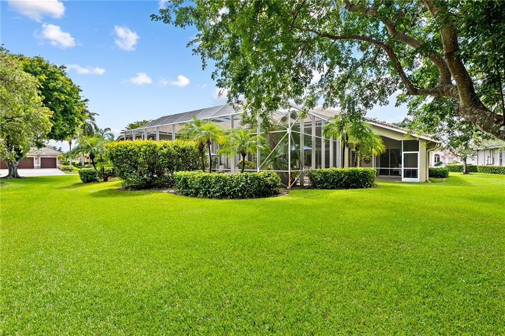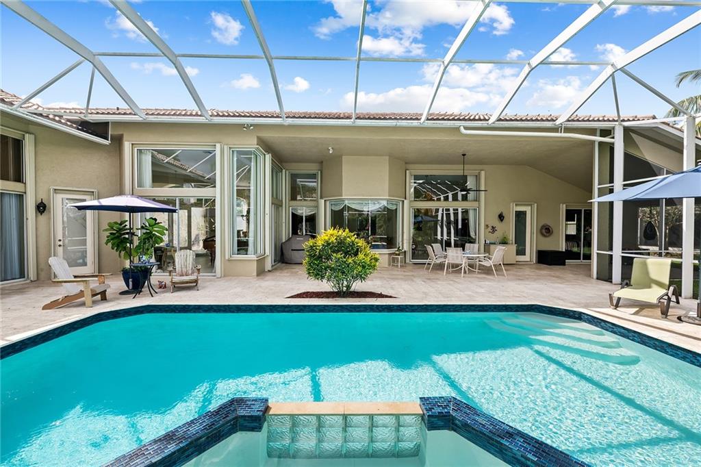 Located in prestigious gated Eagle Trace. Pristine updated home located on an oversized lot in the Greens features five bedrooms, four bathrooms,(5th BR used as office),paver circular driveway with an elegant porte-cochere entrance,three car garage and hurricane protection. You will feel at home the moment you enter this exceptional property with volume ceilings,open bright and spacious living room,dining room,family room w/built in wet bar overlooking a chefs kitchen with eating area,counter seating,granite counter tops,SS appliances,plenty of cabinets & a roomy walk in pantry. Enjoy the outdoor luxury lifestyle this home offers with an oversized screened in travertine patio overlooking a magnificent pool/spa. HOA amenities include Tennis,pickleball,playground, BBall