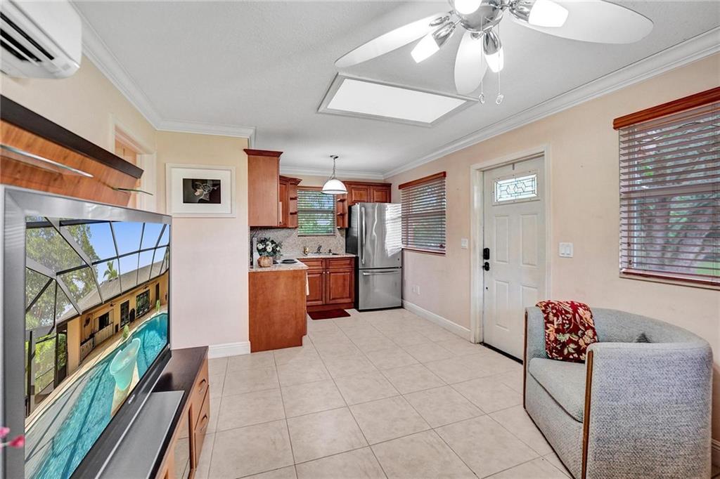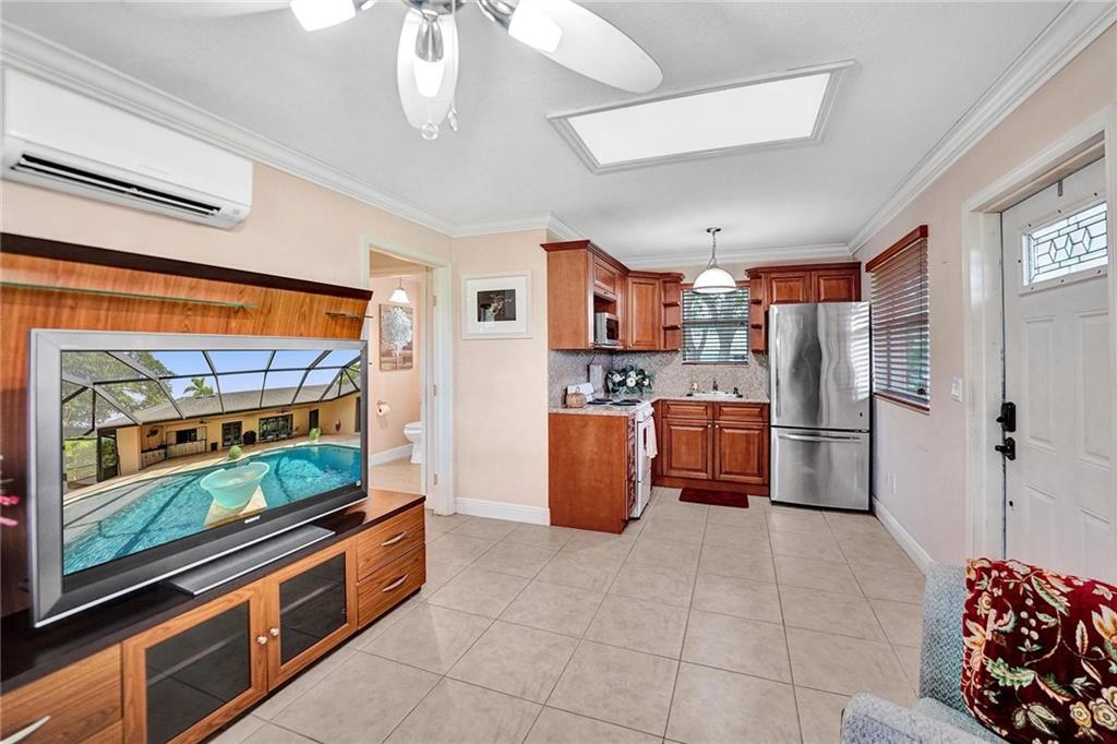 Over 3600 square feet of incredible entertainment space, on a .97 acre sprawling property, with hurricane glass throughout, and custom designed cabinetry creating defined living spaces. Saltwater beach pool. Four large bedrooms two and half redone baths, private master suite with an incredible master bath. Beautiful tile floors throughout. Screened in spectacular pool area with water feature and large pool side patio. The large property includes numerous specimen plantings including spectacular rainbow eucalyptus trees as you take the path to the adorable one-bedroom casita. At almost 500 square feet this one bedroom one bath cottage is ideal for extended family or a rental. Room count does not include guest house. Two-car garage & parking in the circular drive for your next great party.