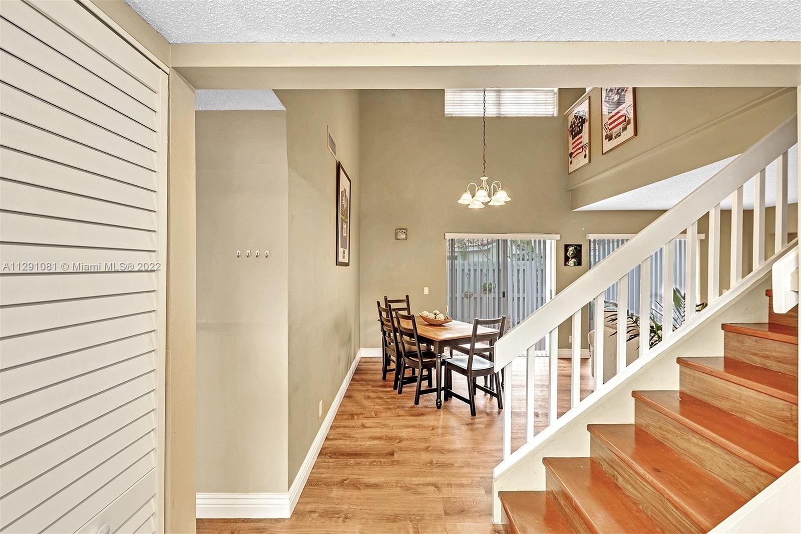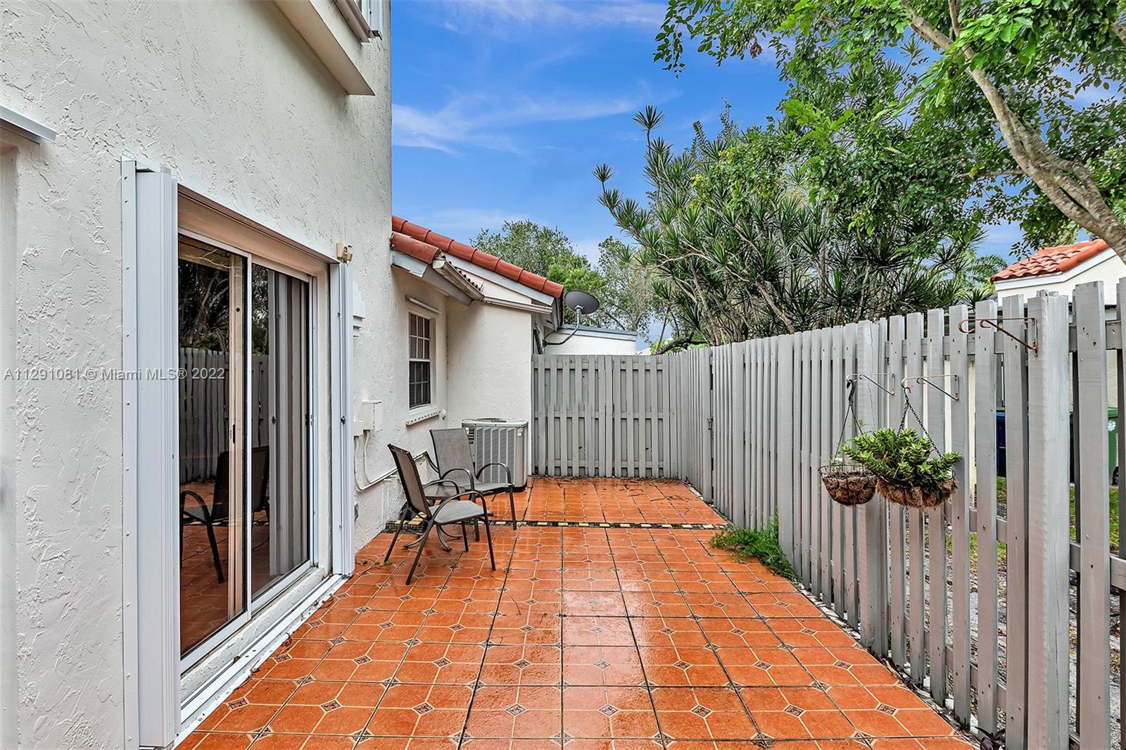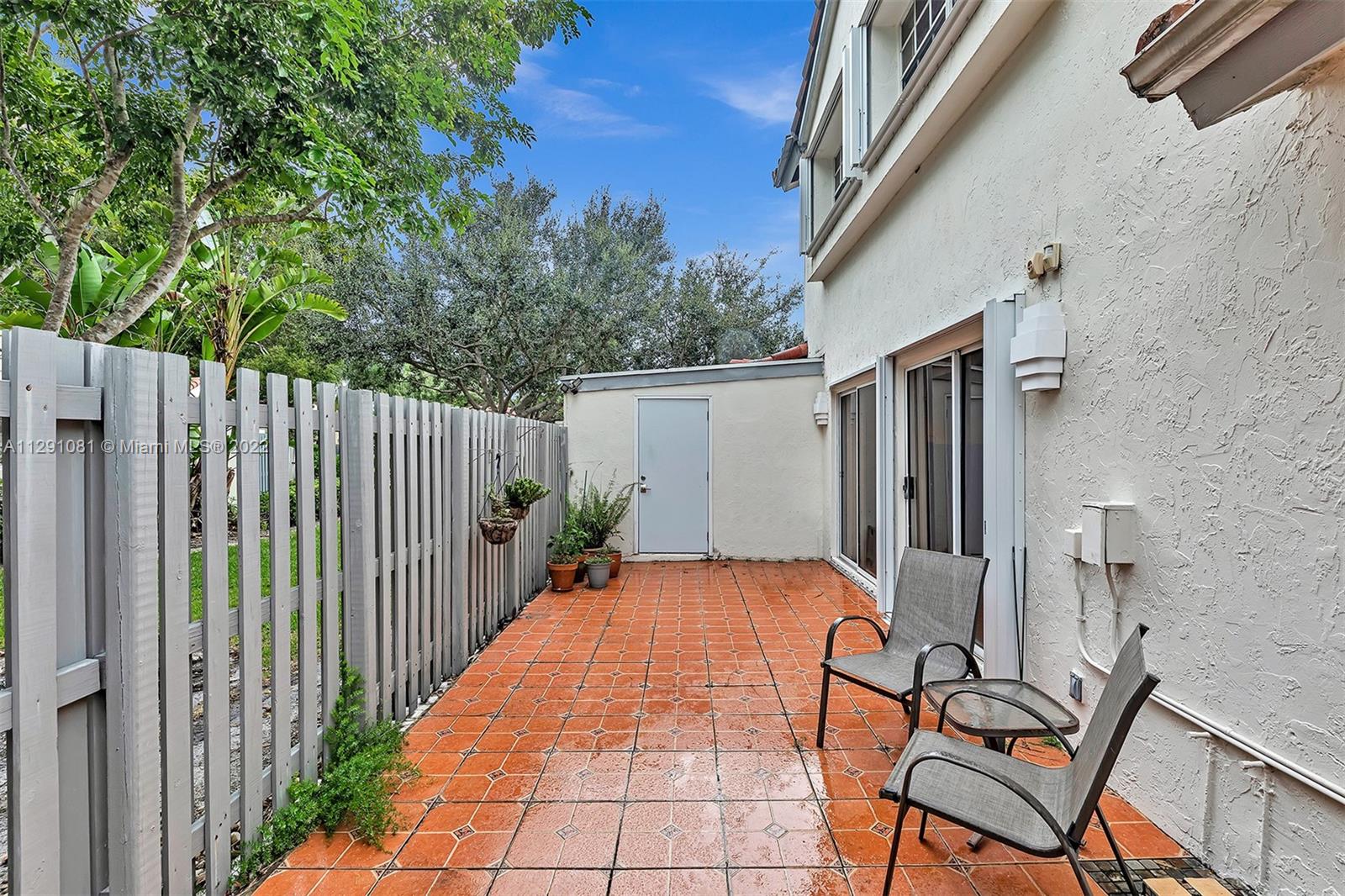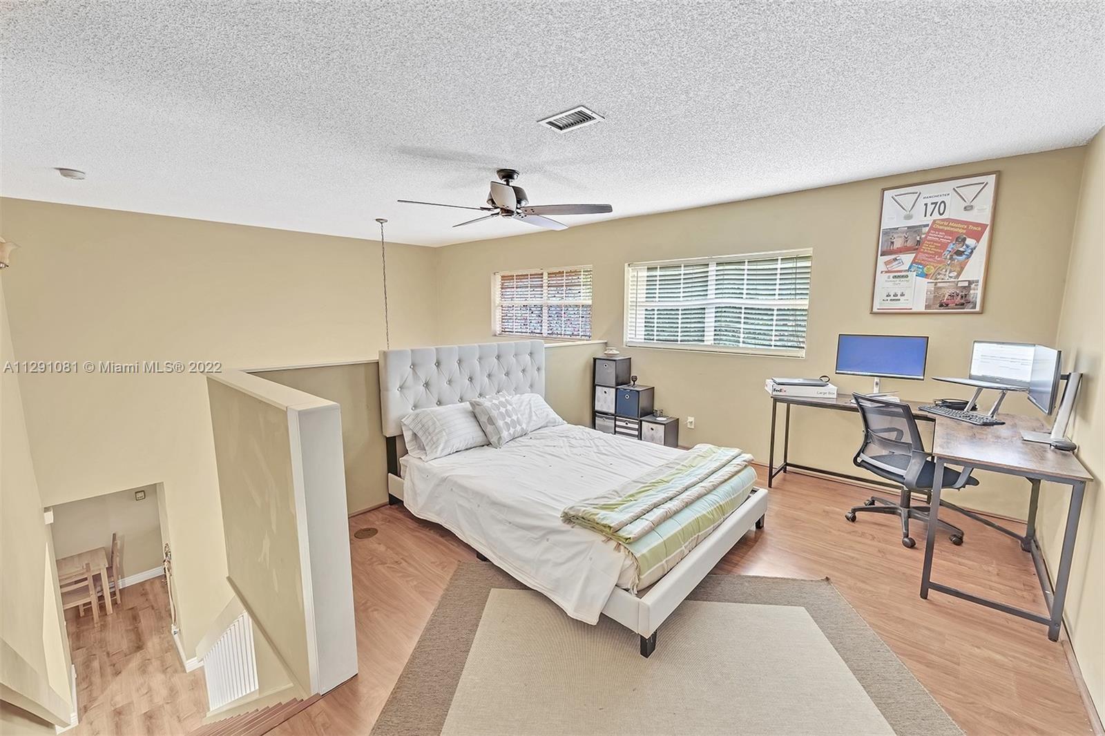 Exceptional townhouse offering two bedrooms two bathrooms plus a spacious loft and fenced yard. Private view overlooking green area. Enter the great room and experience the 2 story volume ceiling which provides lots of natural light and open feeling. Eat-in kitchen has cozy breakfast area. Floor plan flows with 2 master suites, one upstairs/one downstairs, each with direct access to bathroom and large walk-in closets. Additional features include waterproof vinyl flooring downstairs and laminate in bedrooms and loft, full size front loader washer and dryer, large storage shed, accordion shutters upstairs and panels downstairs. Pets are welcome! Investors welcome! Certain trucks are permitted. Unit has 2 assigned parking spots. Steps to community pool, parks and shopping.