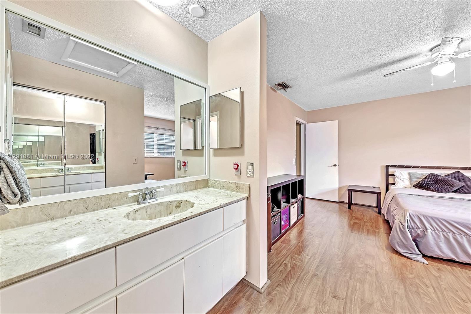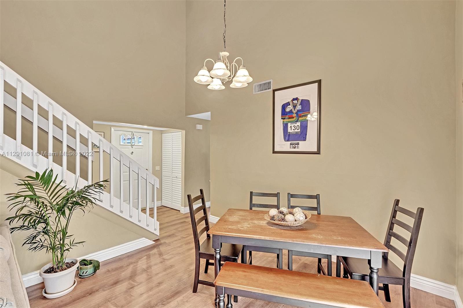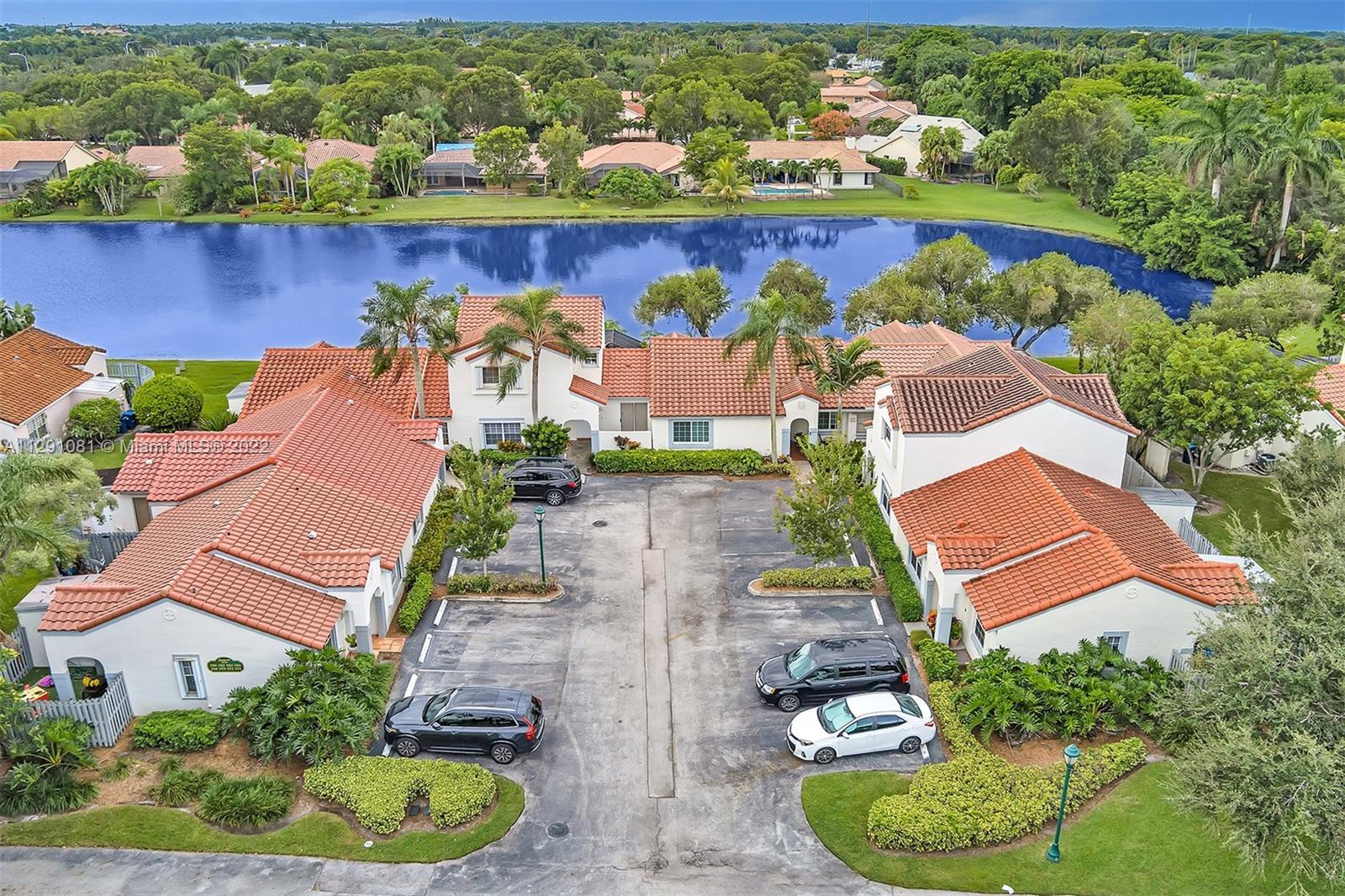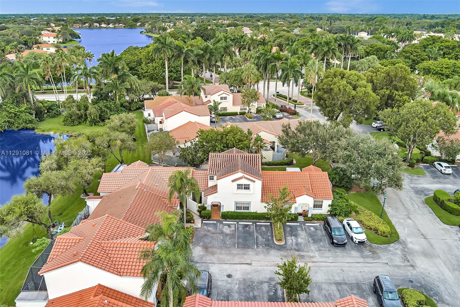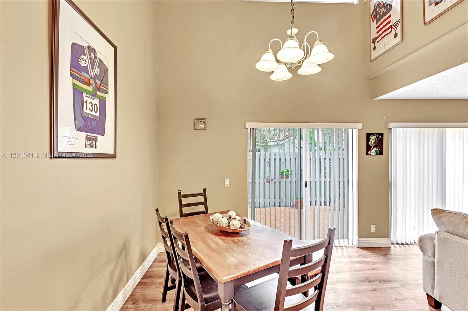 Exceptional townhouse offering two bedrooms two bathrooms plus a spacious loft and fenced yard. Private view overlooking green area. Enter the great room and experience the 2 story volume ceiling which provides lots of natural light and open feeling. Eat-in kitchen has cozy breakfast area. Floor plan flows with 2 master suites, one upstairs/one downstairs, each with direct access to bathroom and large walk-in closets. Additional features include waterproof vinyl flooring downstairs and laminate in bedrooms and loft, full size front loader washer and dryer, large storage shed, accordion shutters upstairs and panels downstairs. Pets are welcome! Investors welcome! Certain trucks are permitted. Unit has 2 assigned parking spots. Steps to community pool, parks and shopping.