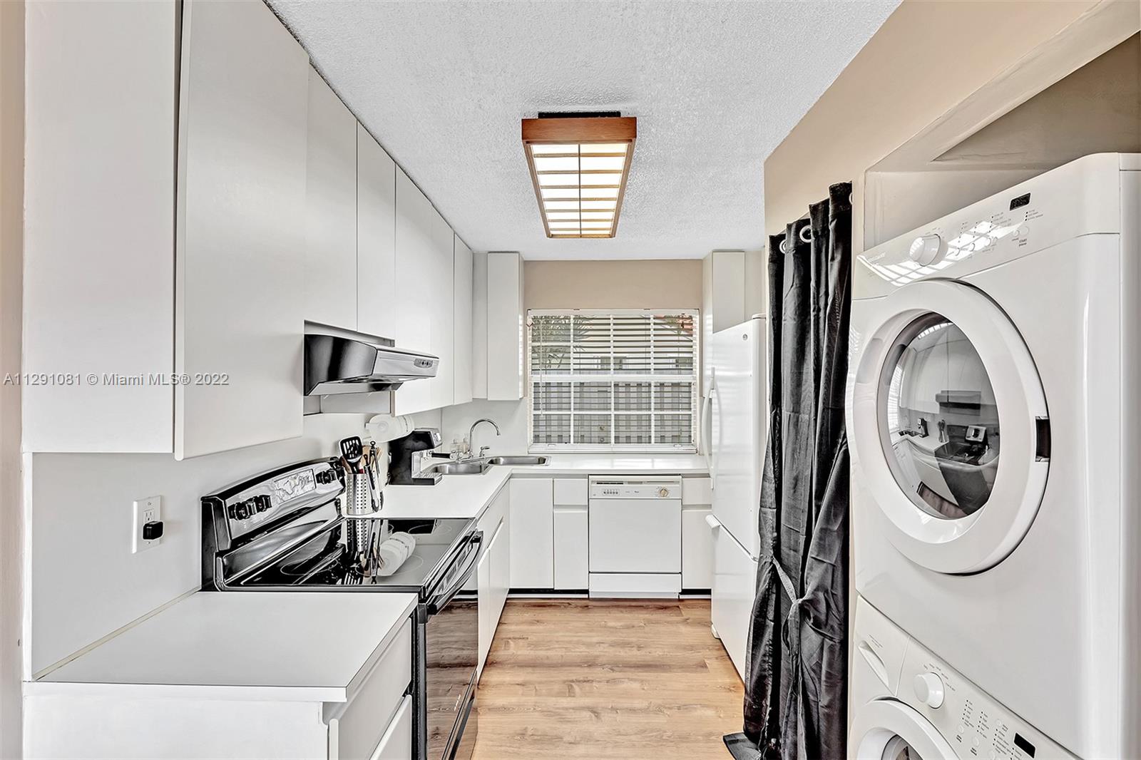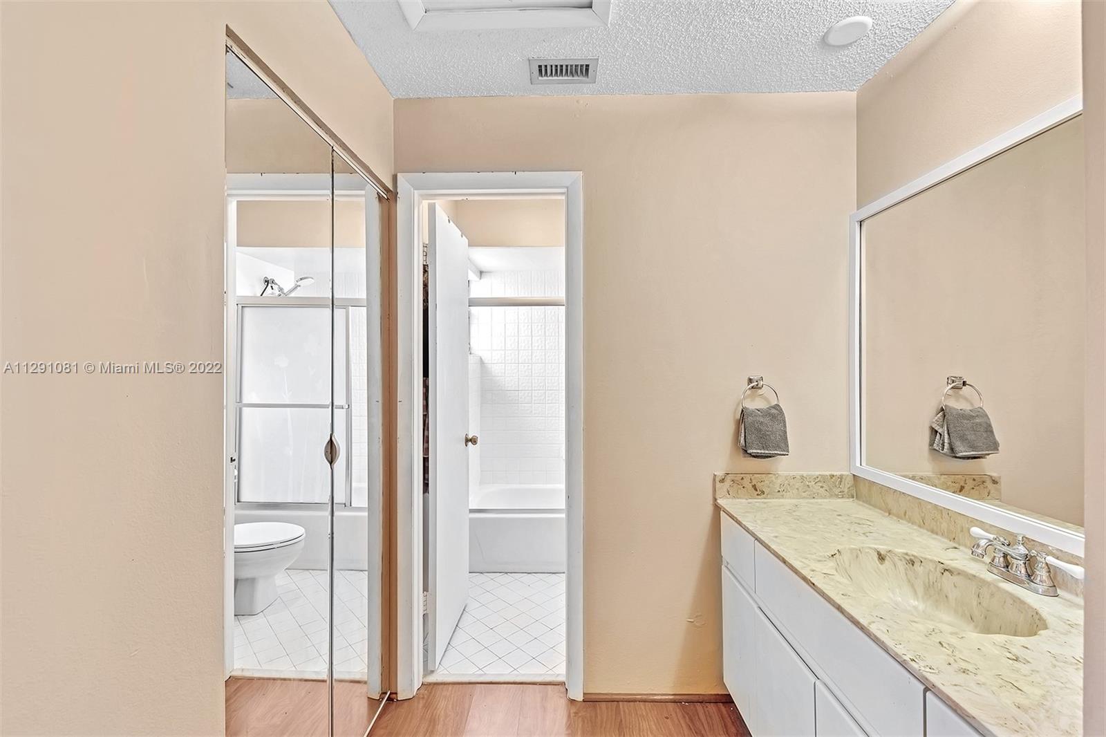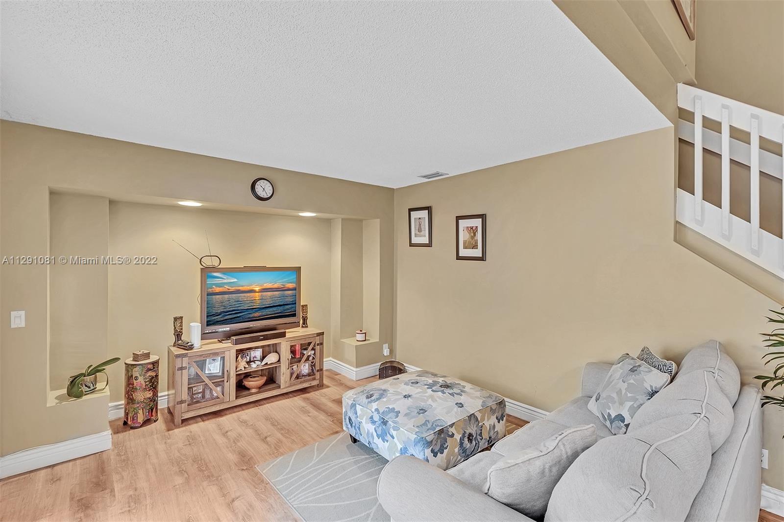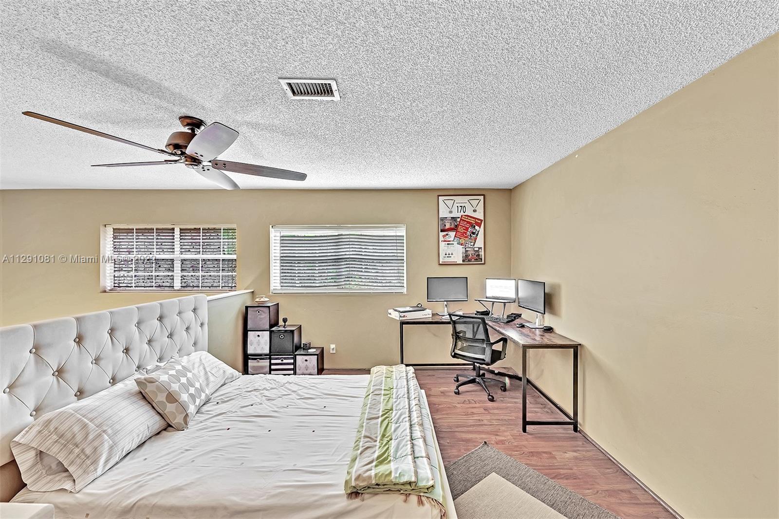 Exceptional townhouse offering two bedrooms two bathrooms plus a spacious loft and fenced yard. Private view overlooking green area. Enter the great room and experience the 2 story volume ceiling which provides lots of natural light and open feeling. Eat-in kitchen has cozy breakfast area. Floor plan flows with 2 master suites, one upstairs/one downstairs, each with direct access to bathroom and large walk-in closets. Additional features include waterproof vinyl flooring downstairs and laminate in bedrooms and loft, full size front loader washer and dryer, large storage shed, accordion shutters upstairs and panels downstairs. Pets are welcome! Investors welcome! Certain trucks are permitted. Unit has 2 assigned parking spots. Steps to community pool, parks and shopping.