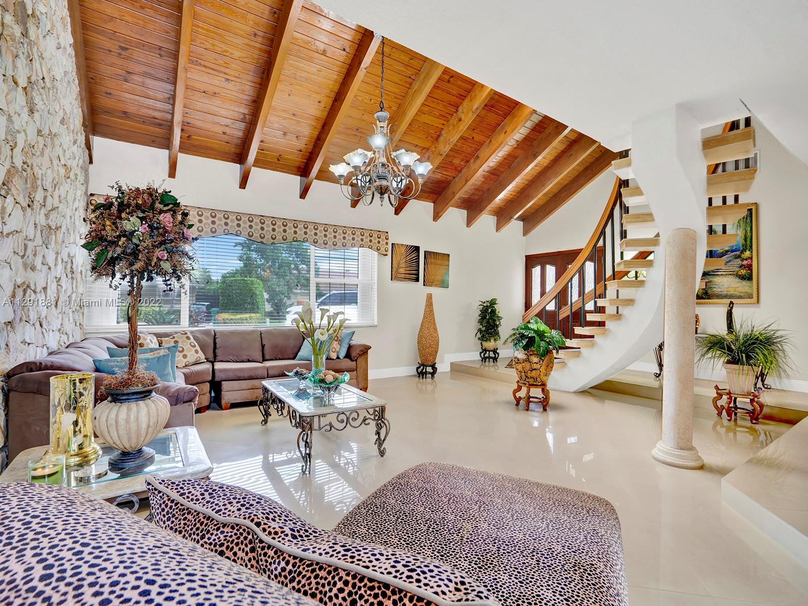 Beautiful 5 bedroom 4 Bathroom home in the Country Club of Miami with a pool, 2 car garage, wood beamed vaulted ceilings, marble tile, spacious living areas and an amazing backyard ready to entertain family and friends this holiday season. Enjoy the amazing view from your balcony of the country club municipal golf course, boasting two 18 hole courses and a lighted driving range; which is said will be reconfigured to a Platinum level 18hole championship and a 9hole Executive level for an estimated value of $14million. Roof 1997 Roof Repair 2022. Use show assist..