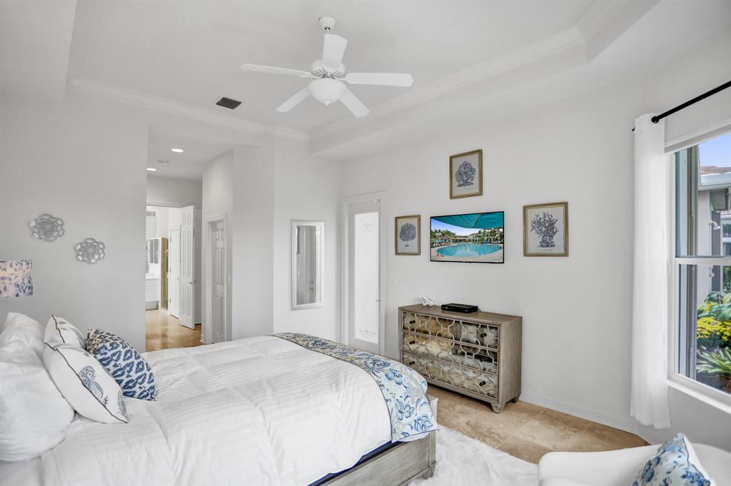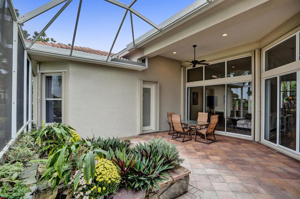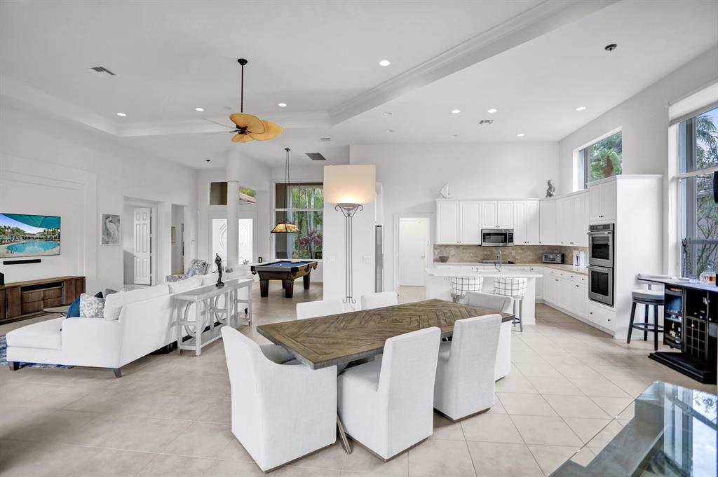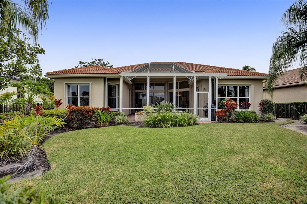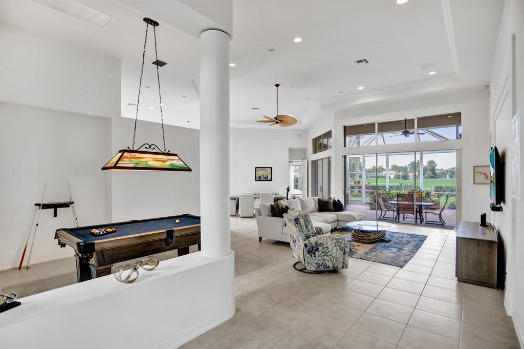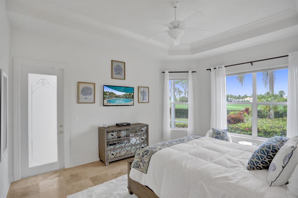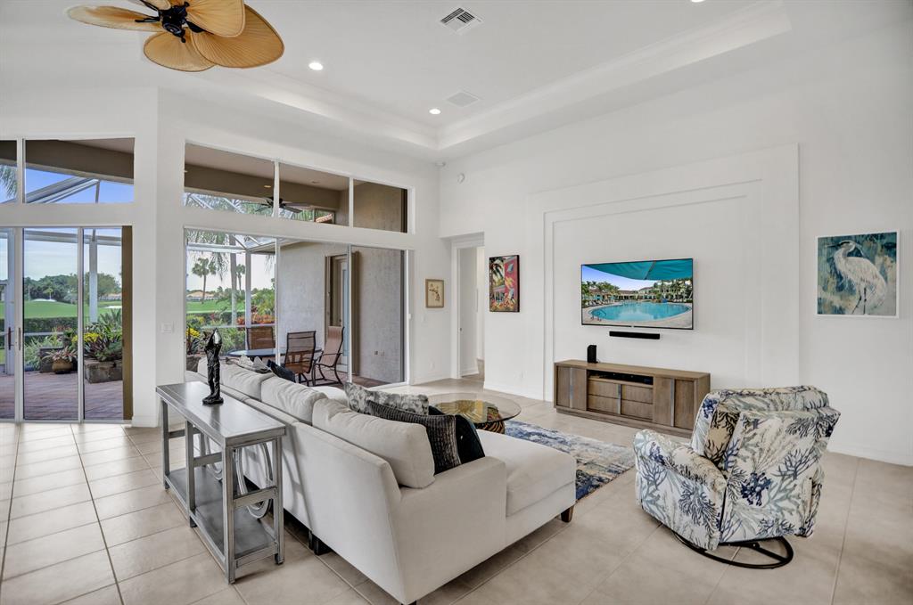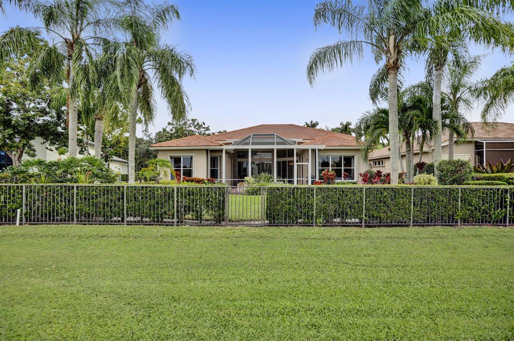Signature Golf membership available! Pristine home situated on a lovely wide lot with panoramic golf & water views in the very sought after Ibis Golf & Country Club community featuring unequaled 1st class amenities. The private & expansive yard offers gorgeous sunsets & tranquility. Thoughts to add a pool? There's plenty of space & a great southern exposure to naturally heat the pool. The great room with an open concept is bright & airy thanks to the enormous windows allowing great natural light to fill the home. Volume coffered ceilings & crown molding add to the elegance. Full accordion shutters, newer appliances in the kitchen and AC. FULL golf conveys. Furnishings negotiable. If buyer does not purchase the pool table, the light fixture above the table does NOT conveys